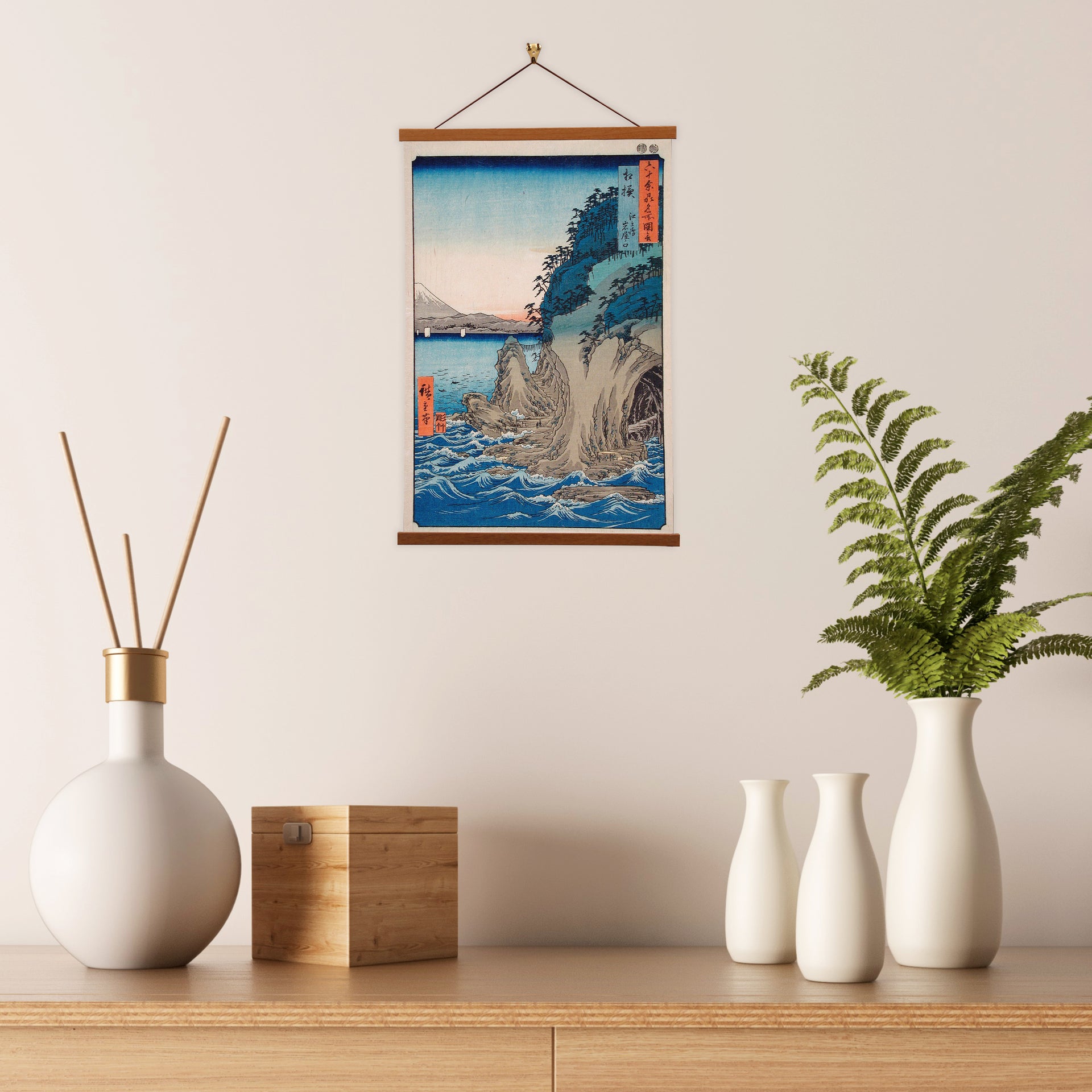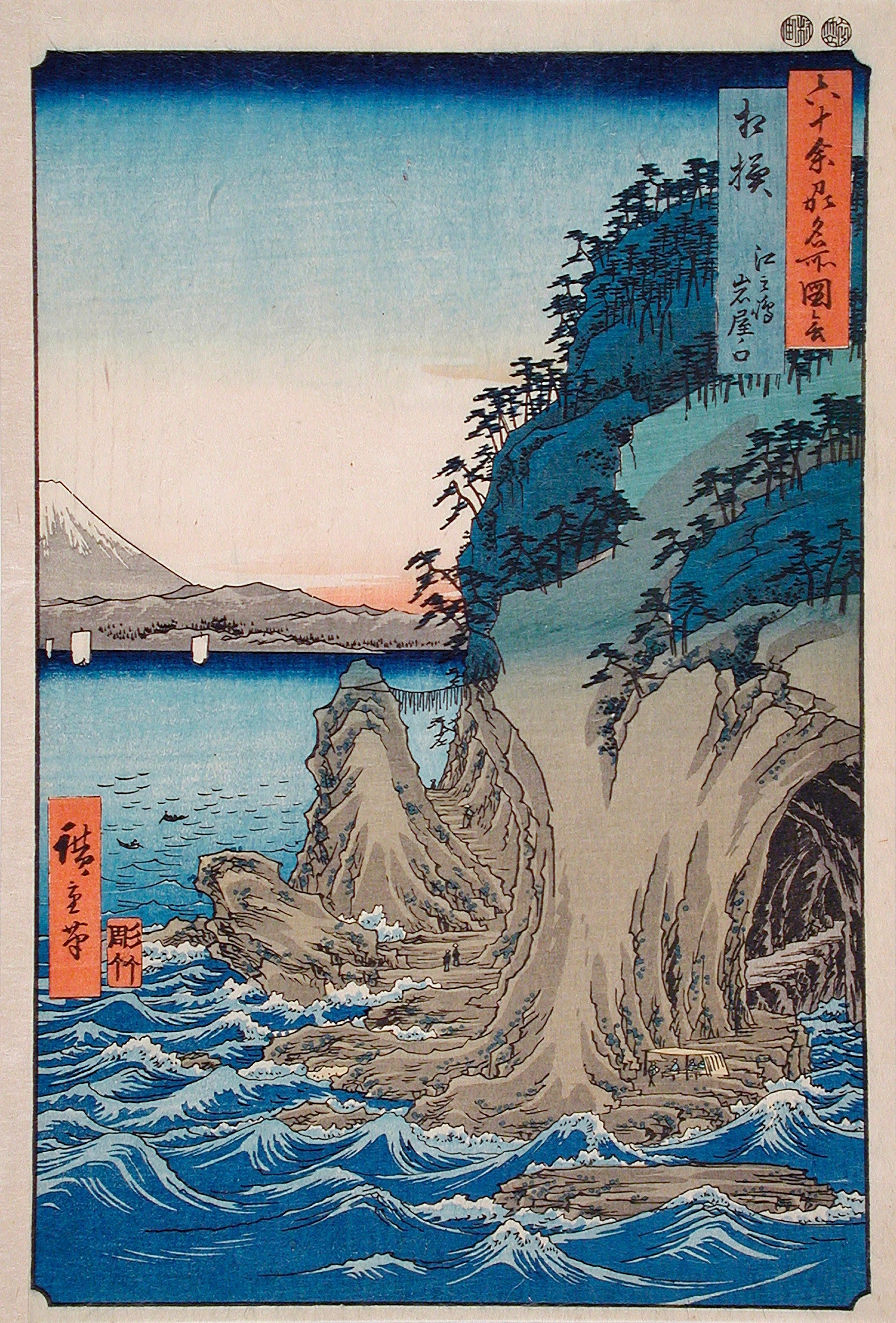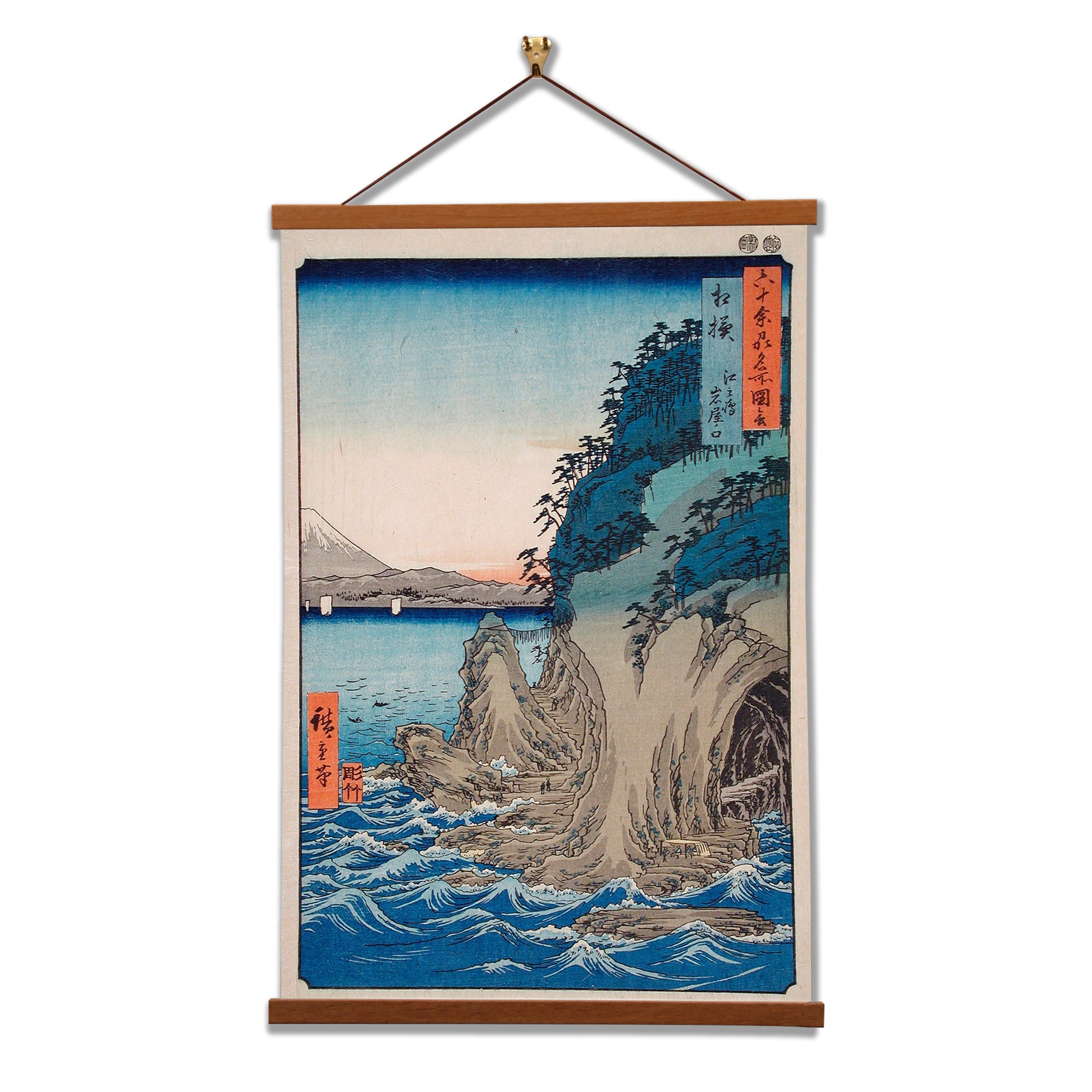"Entrance to the Cave at Enoshima Island in Sagami Province, Number 15" by Utagawa Hiroshige is a captivating woodblock print from the mid-19th century. It depicts a serene coastal landscape on Enoshima Island, with a mysterious cave entrance framed by rocky cliffs and a tranquil sea. Hiroshige's masterful use of color and detail transports viewers to this scenic, otherworldly realm, inviting them to explore the hidden wonders of the natural world.