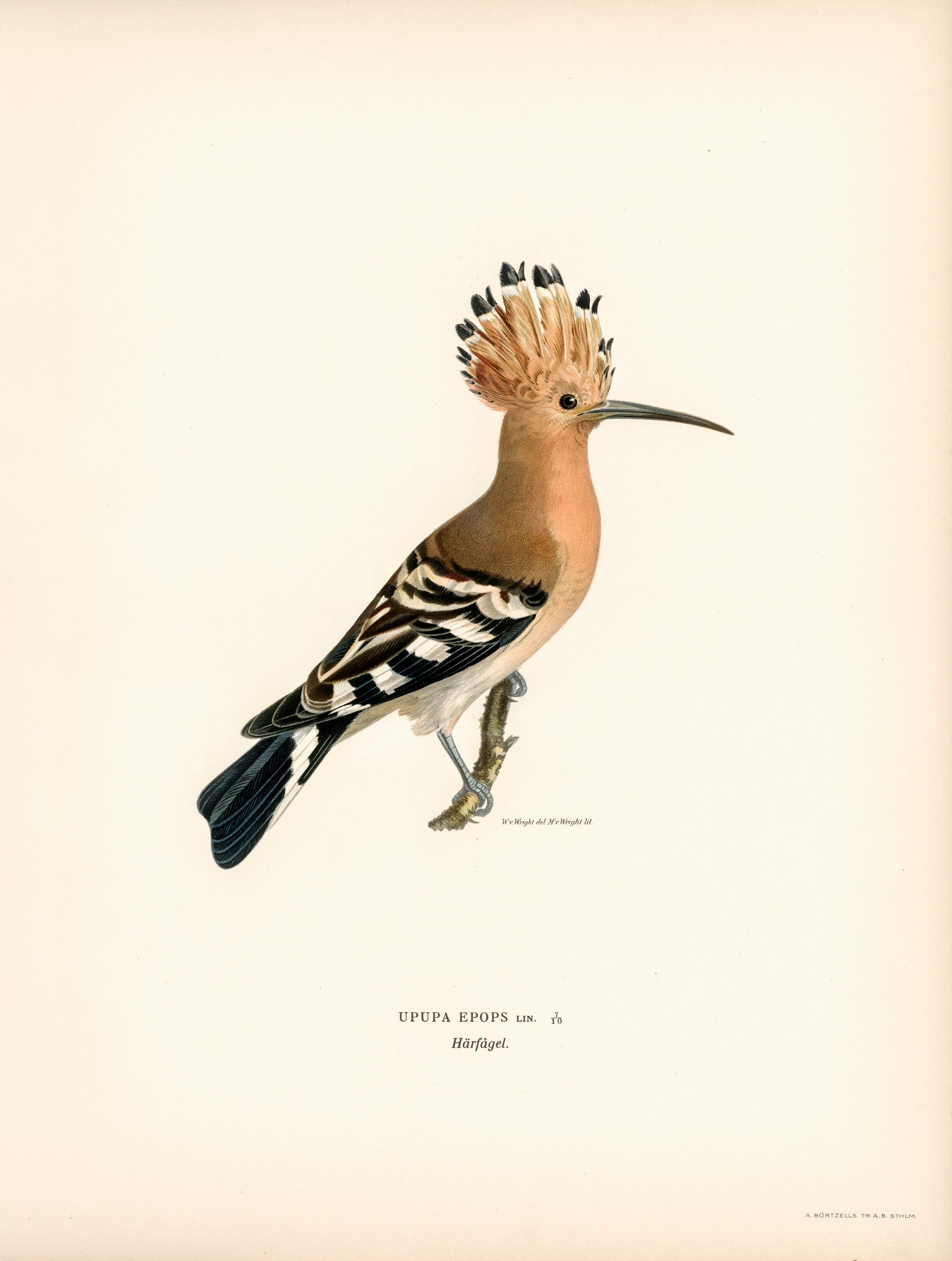 The von Wright Brothers capture the enchanting Eurasian hoopoe (Upupa epops) in vivid detail. Their exquisite artistry breathes life into this iconic bird, showcasing its distinctive crown of feathers and striking plumage. With a blend of precision and reverence, they celebrate the beauty of this European and Asian gem.