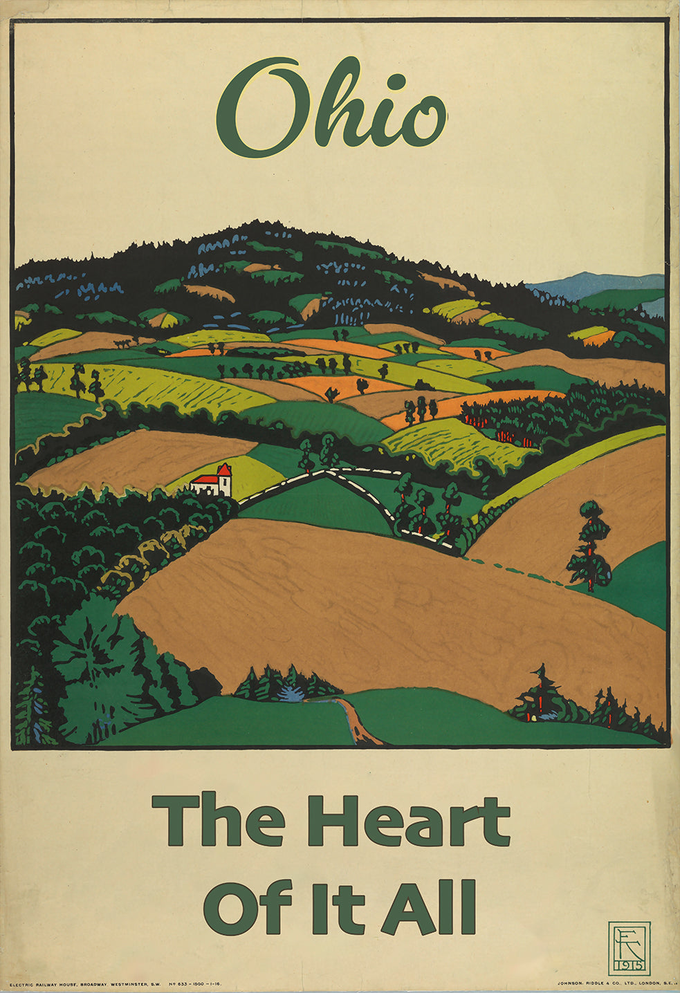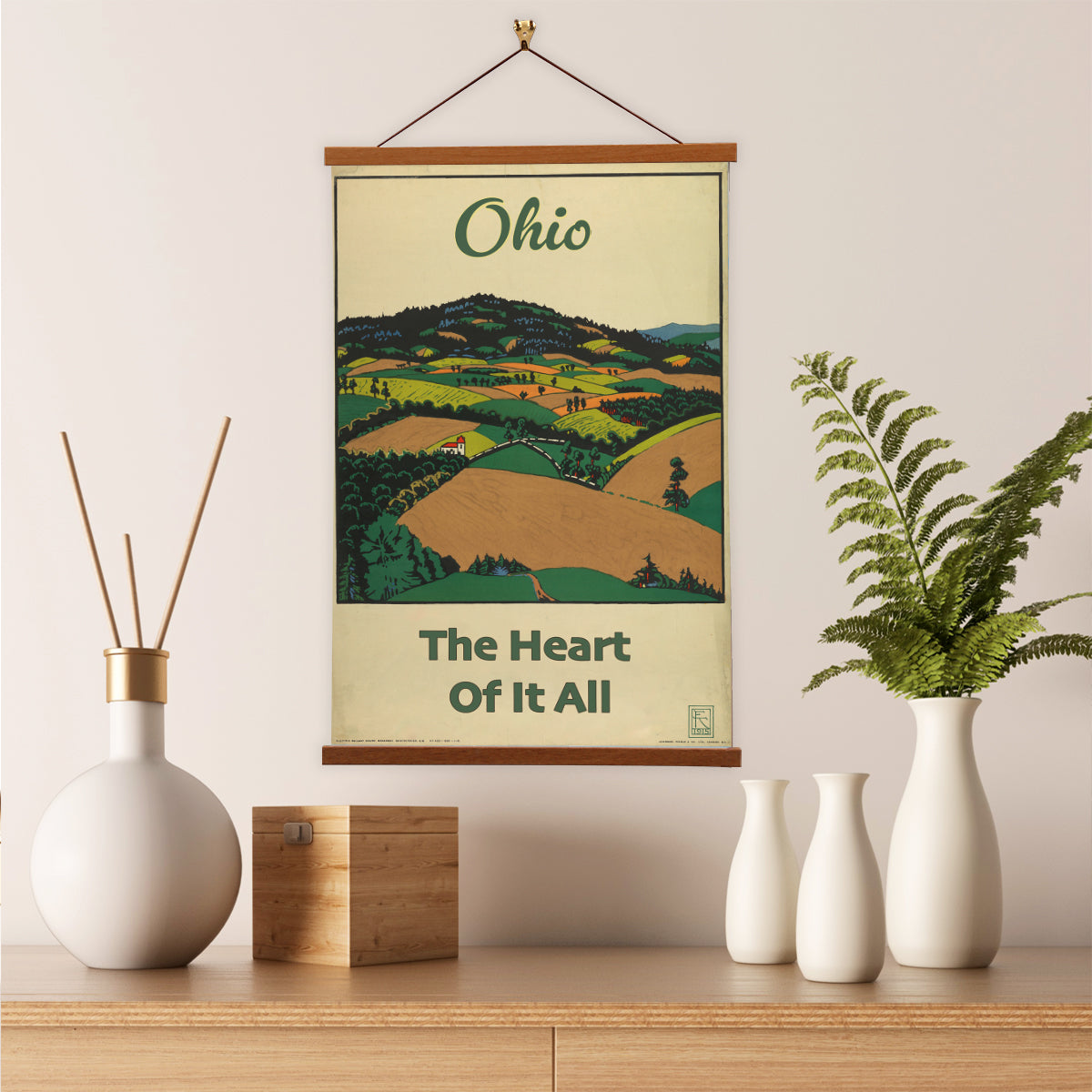 Capture the essence of Ohio's heartland with our vintage impressionist poster. Vast agricultural fields sway gracefully in the breeze, embodying the state's abundant harvests. Labeled 'The Heart of it All,' this nostalgic artwork pays tribute to Ohio's agricultural heritage, inviting you to embrace the beauty of the heartland.