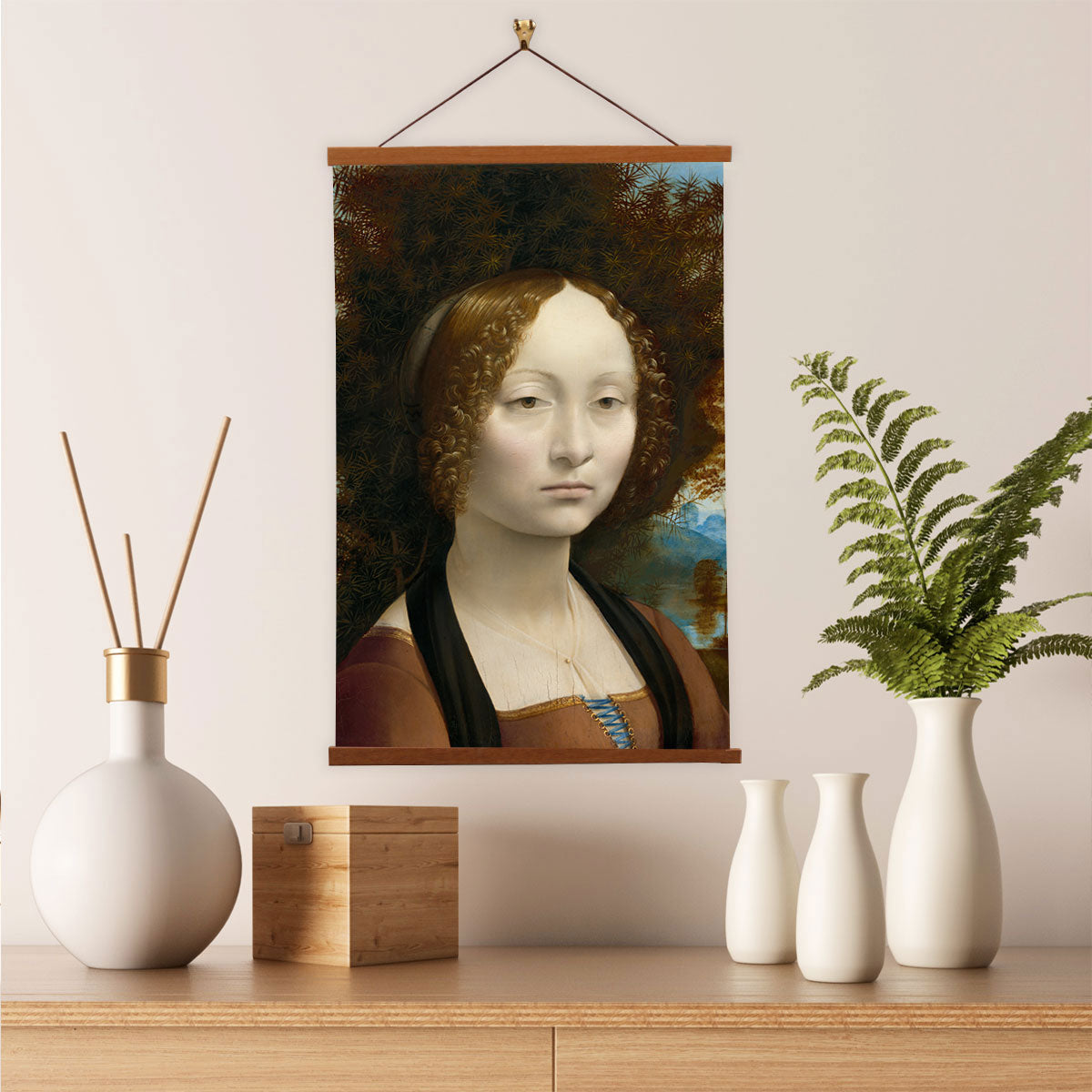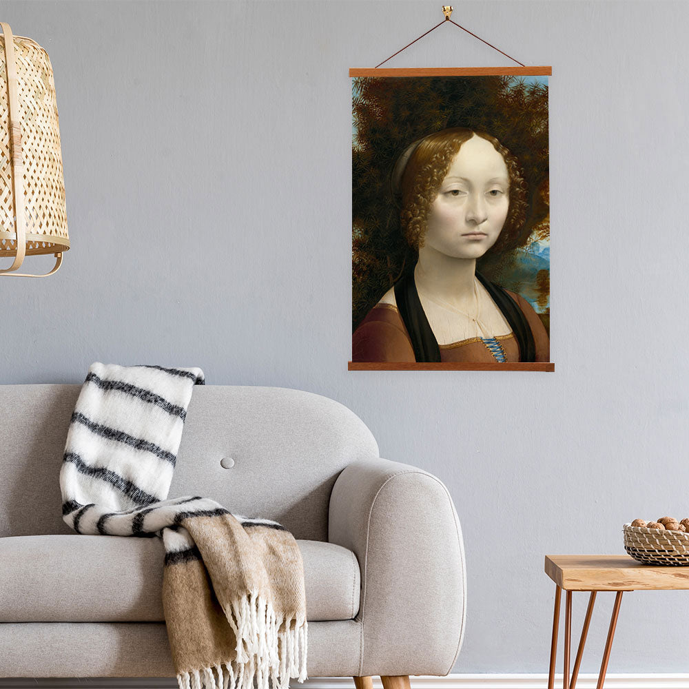 This elegant portrait captures the serene beauty and quiet intelligence of a young Florentine noblewoman. Leonardo’s delicate rendering of Ginevra’s features, combined with the soft atmospheric background, showcases his early mastery of light, texture, and psychological depth. The calm expression and subtle details make this piece a timeless symbol of Renaissance grace and refinement.