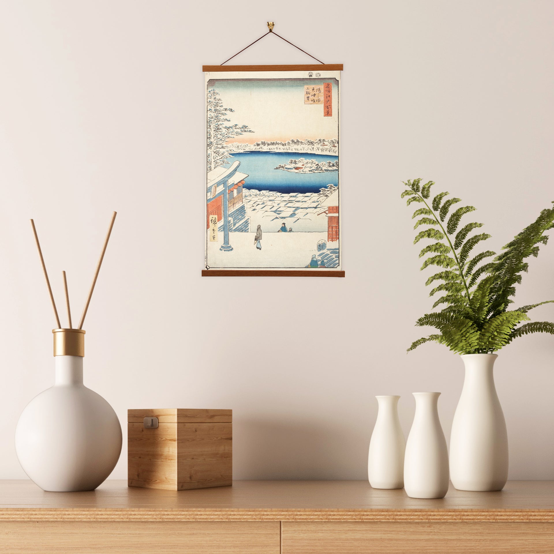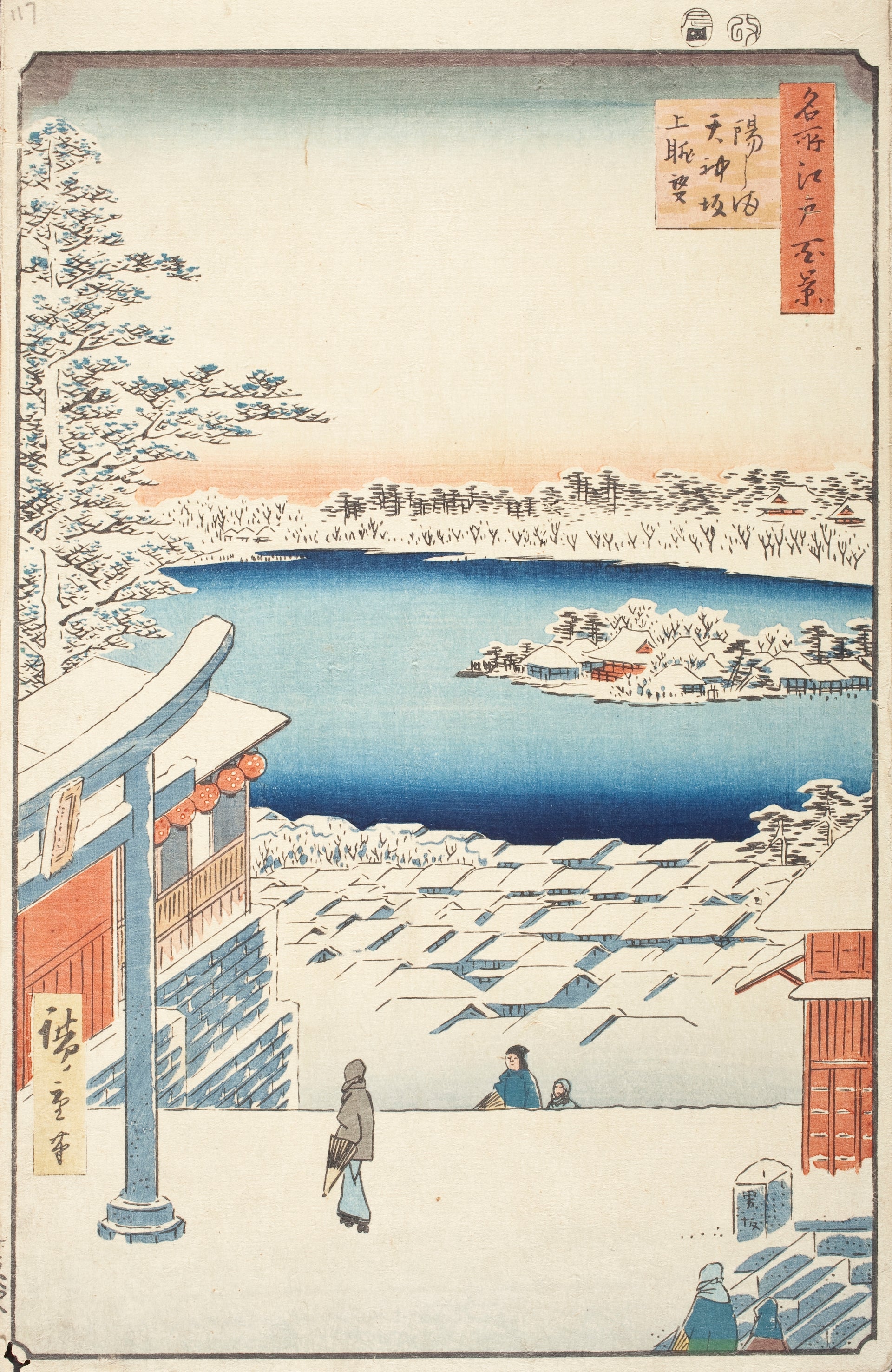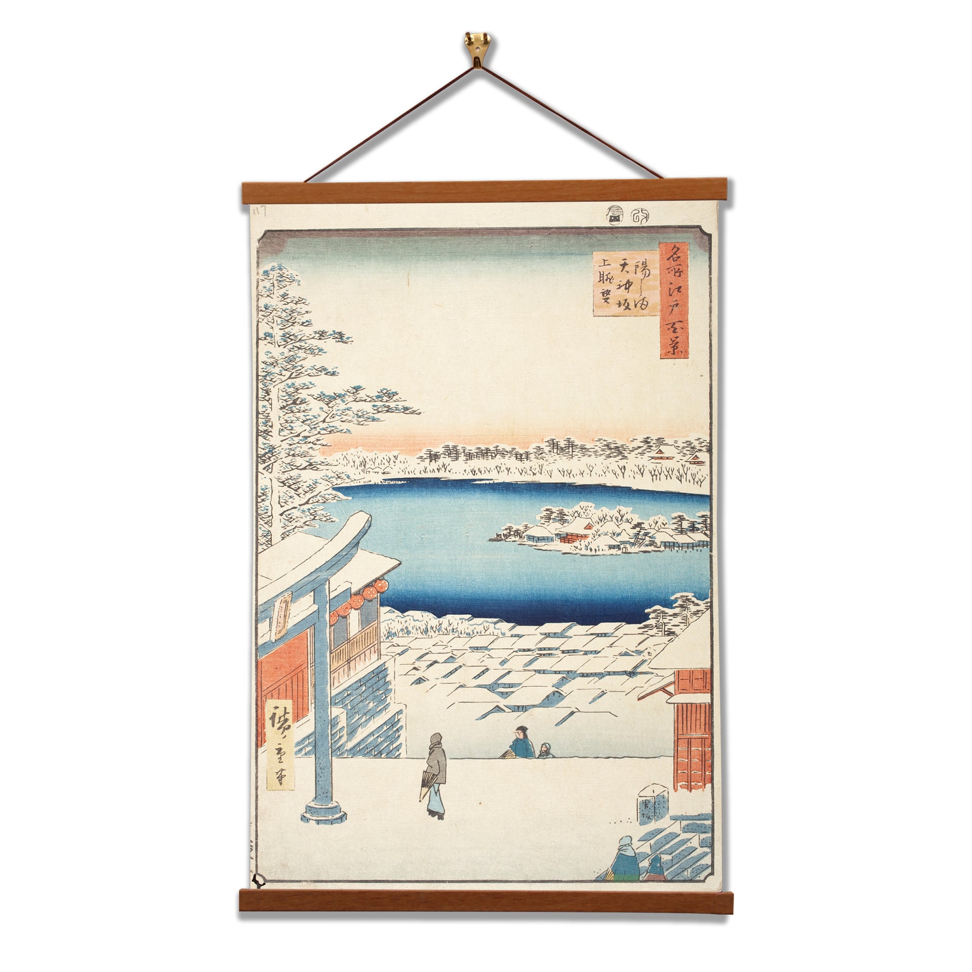 Hilltop View, Yushima Tenjin Shrine is a woodblock print by Utagawa Hiroshige, a renowned Japanese artist of the Edo period. This masterpiece captures the serene beauty of Yushima Tenjin Shrine in Tokyo, showcasing a panoramic view from a hilltop. Hiroshige's expert use of color and detail transports viewers to a tranquil, sacred space.