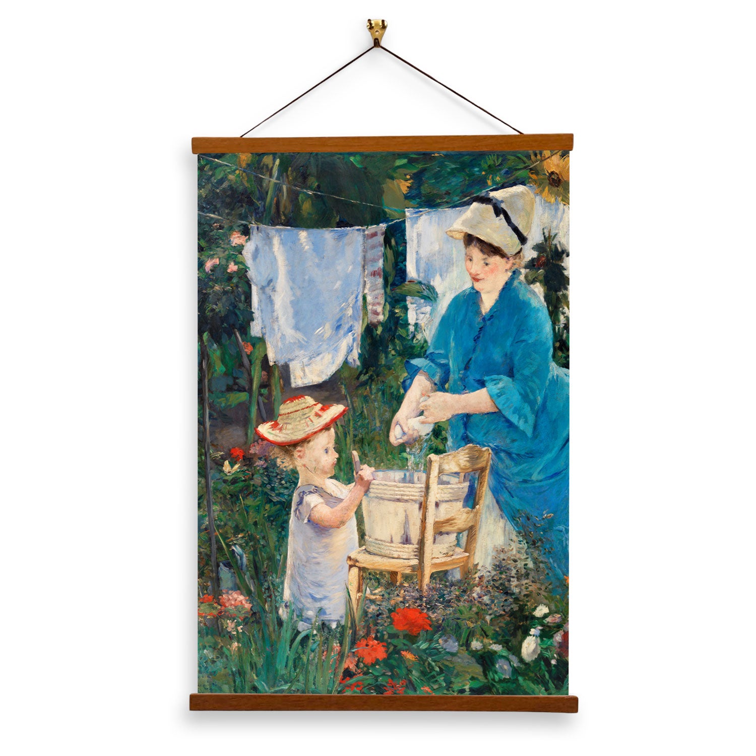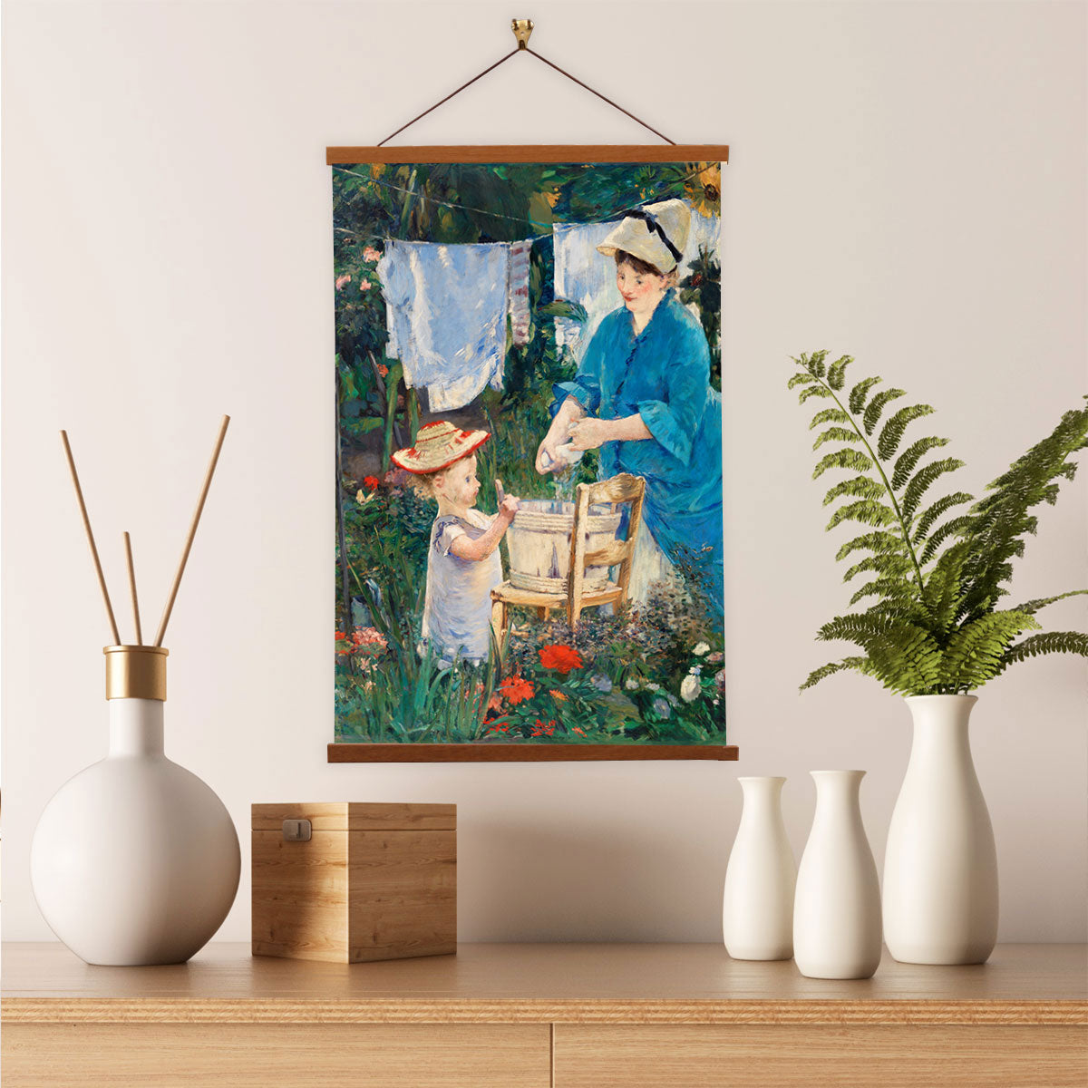 "Laundry" by Édouard Manet presents a quiet, everyday moment with striking simplicity. The scene, depicting a woman tending to freshly washed linens while a child looks on, showcases Manet’s skill in capturing ordinary life with depth and realism. His loose brushwork and subtle interplay of light and shadow bring warmth and movement to the composition, turning a humble task into a timeless reflection of domestic life.