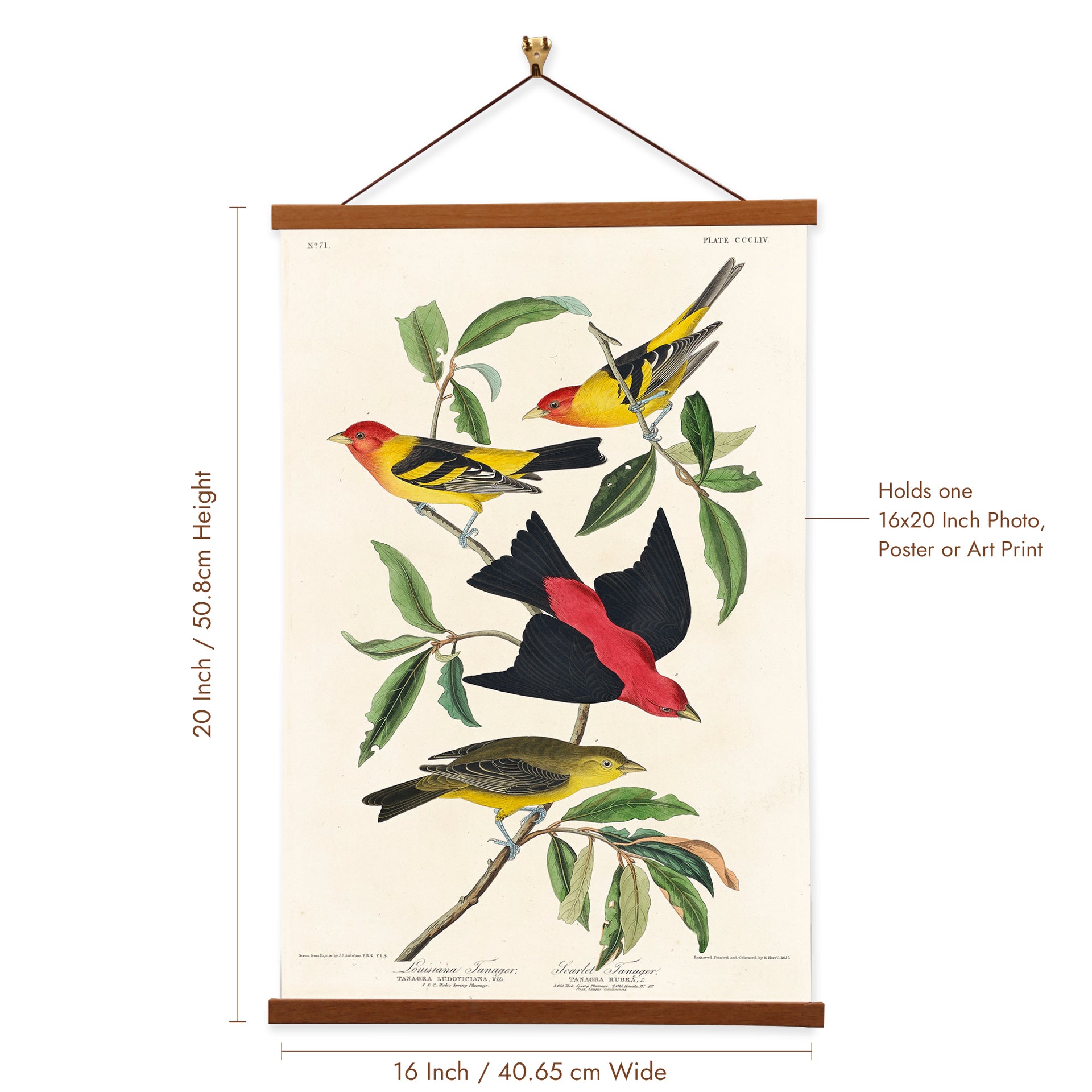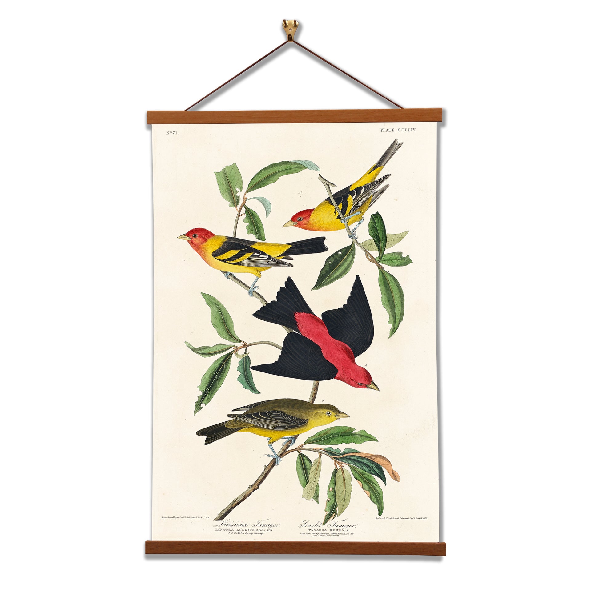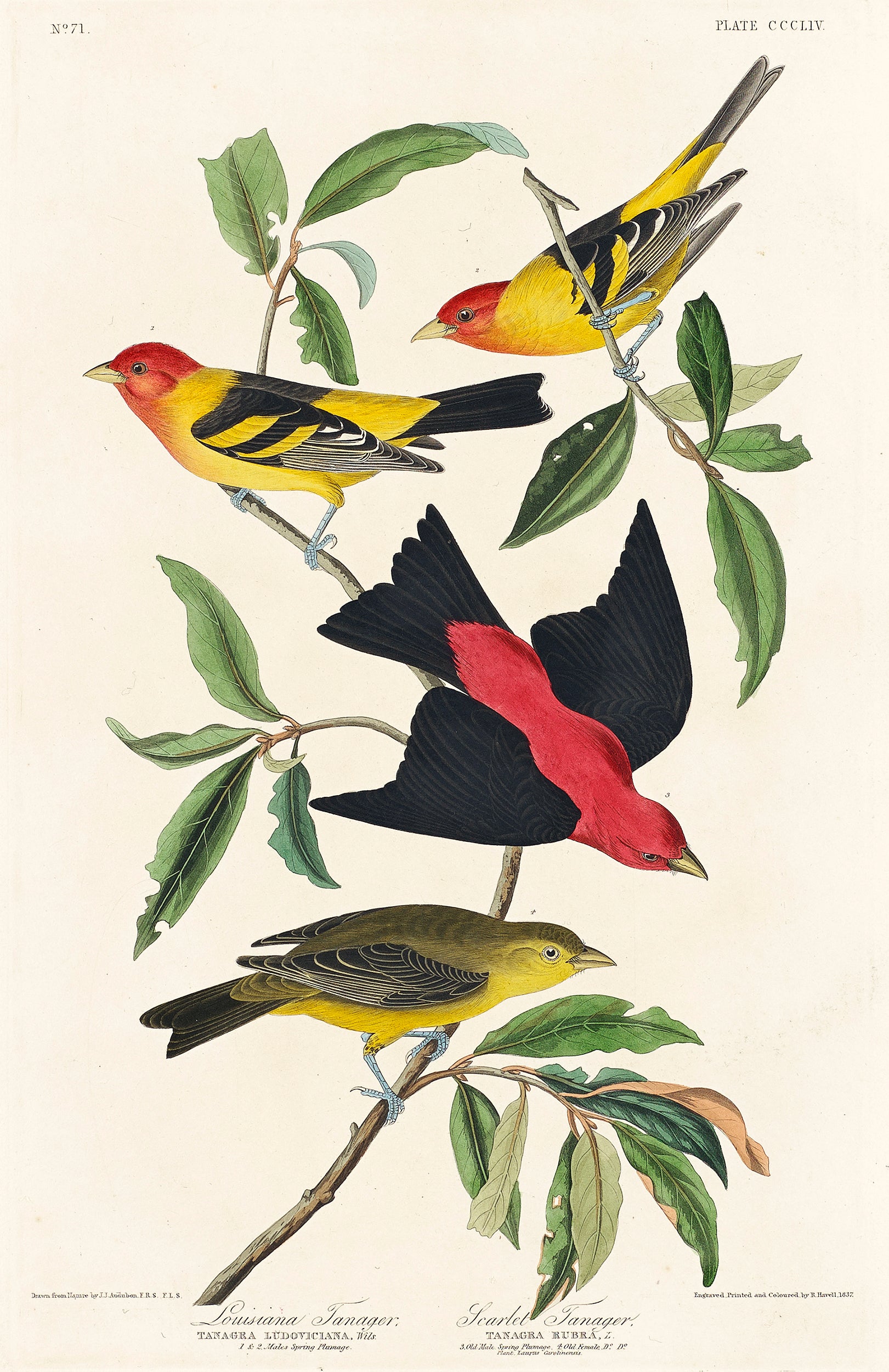 John James Audubon, the renowned ornithologist and artist, depicted the vivid beauty of the Louisiana Tanager with intricate detail. His illustration captures the bird's striking vermilion plumage and distinctive black markings. Similarly, Audubon's Scarlet Tanager portrayal showcases the brilliant scarlet hue of the male, set against a lush forest backdrop, bringing these avian wonders to life through his artistry.