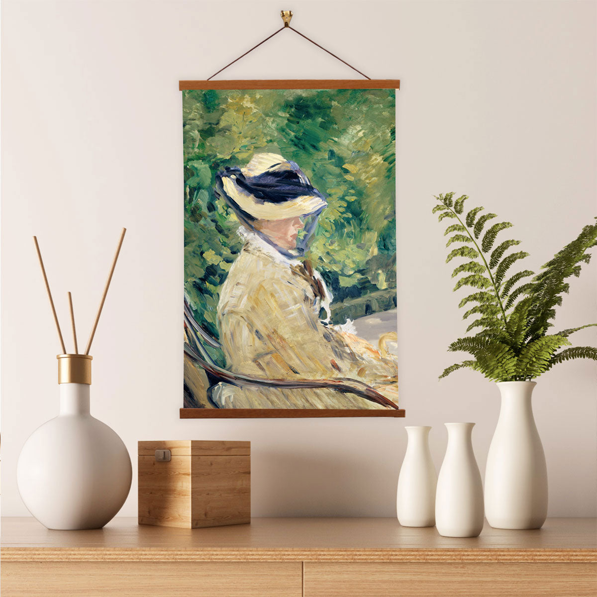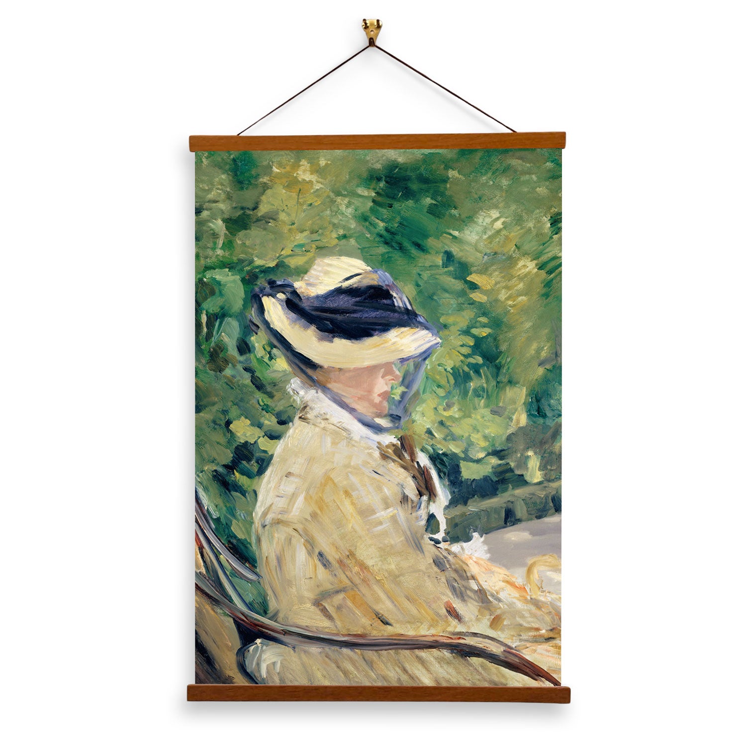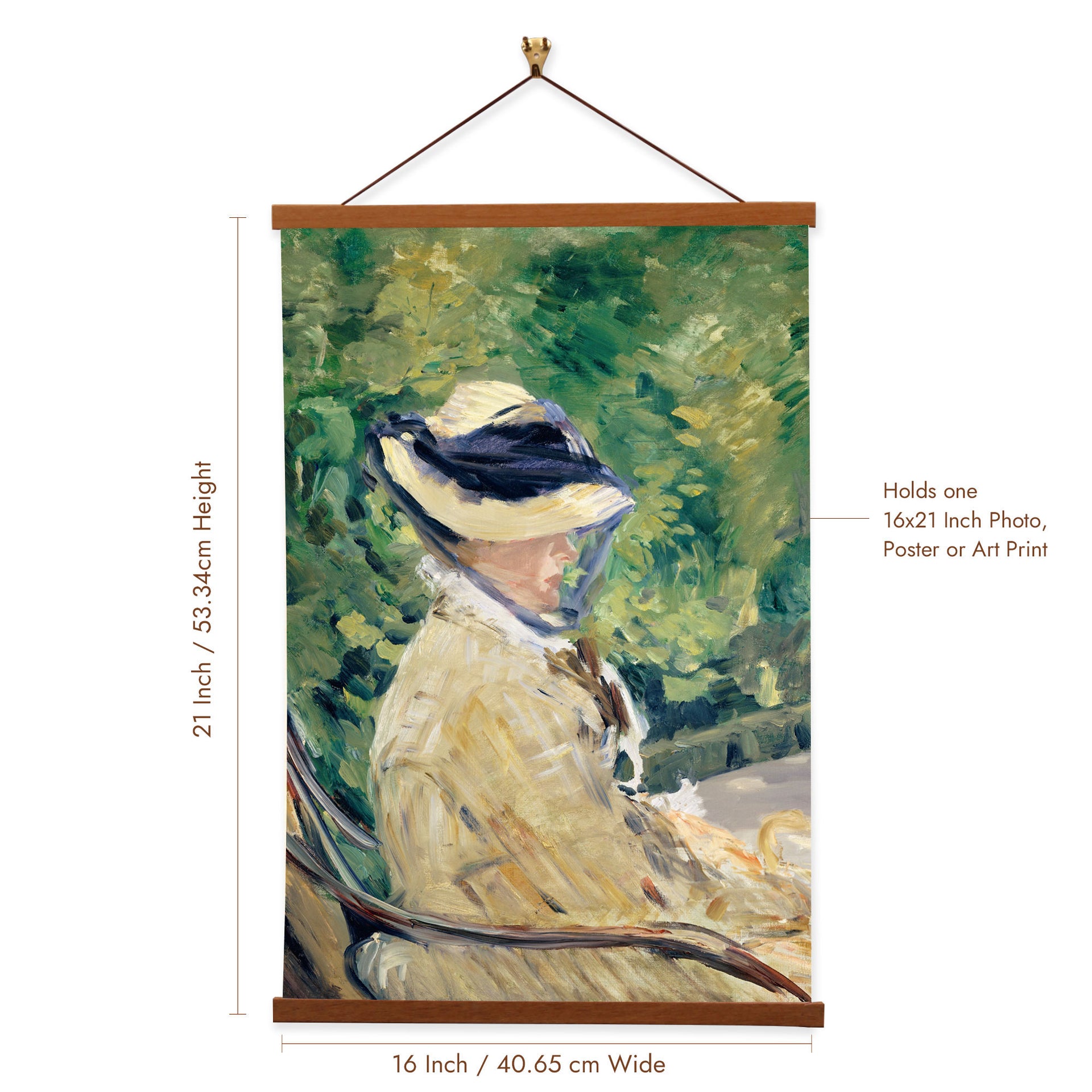 Our posters are elegantly suspended from a magnetic hanger crafted from rich walnut-colored wood, accentuated by a rustic rawhide string for a timeless and sophisticated display. Transform your space with this combination of artistry and craftsmanship.