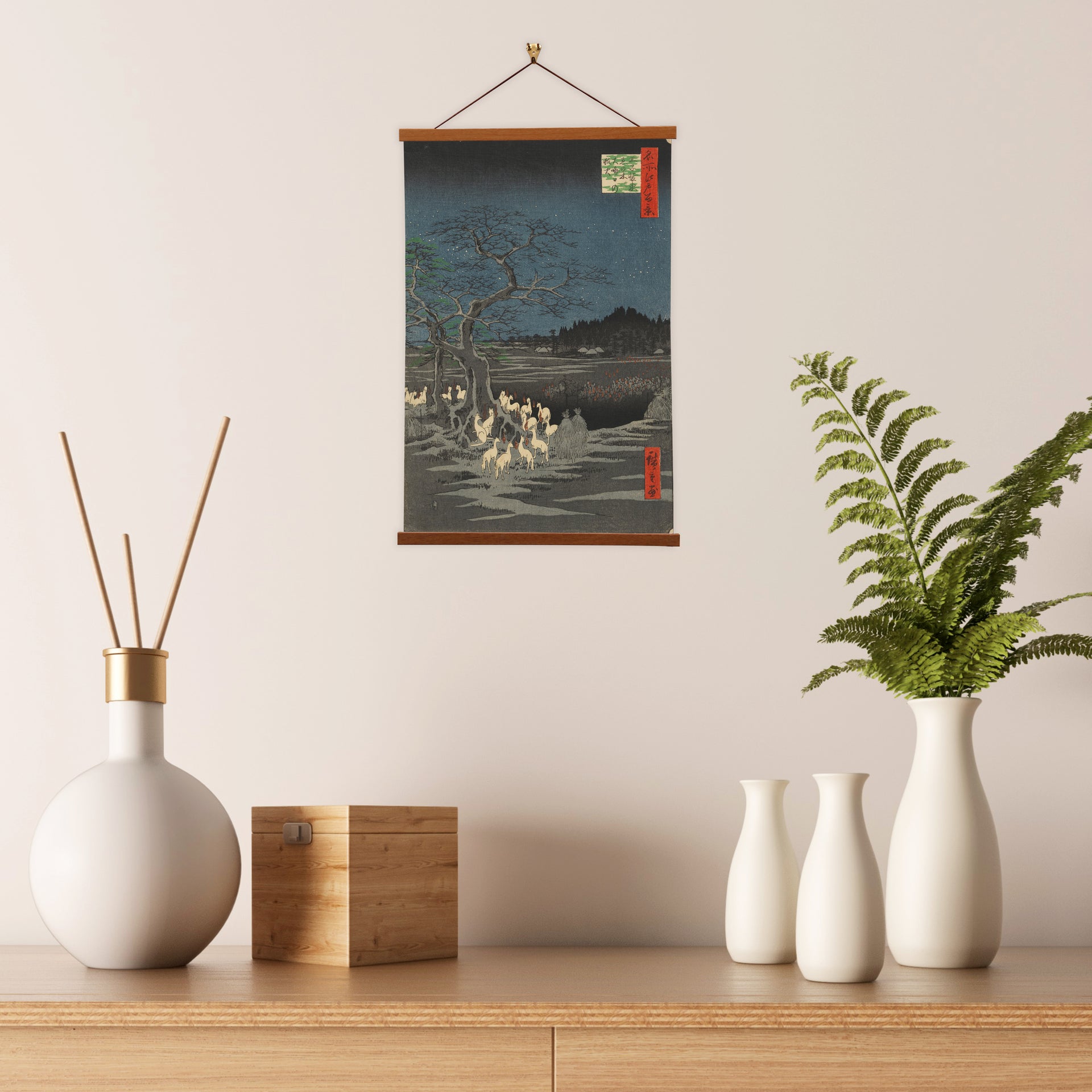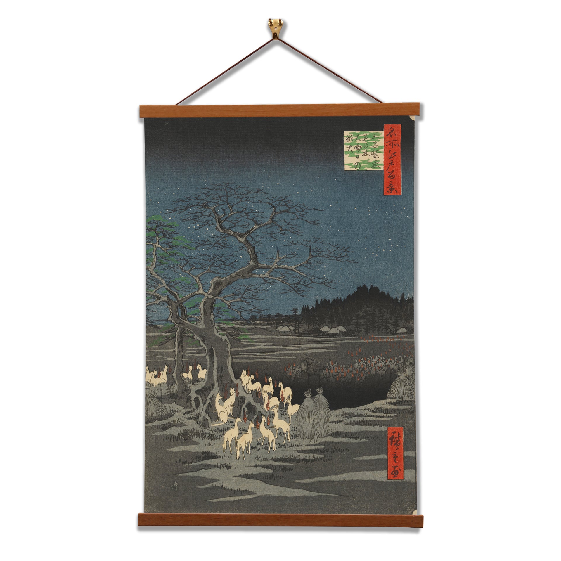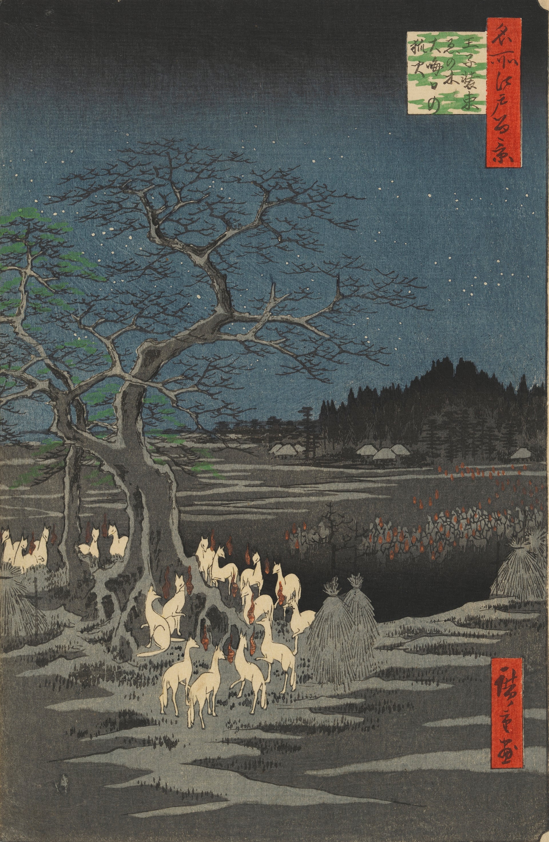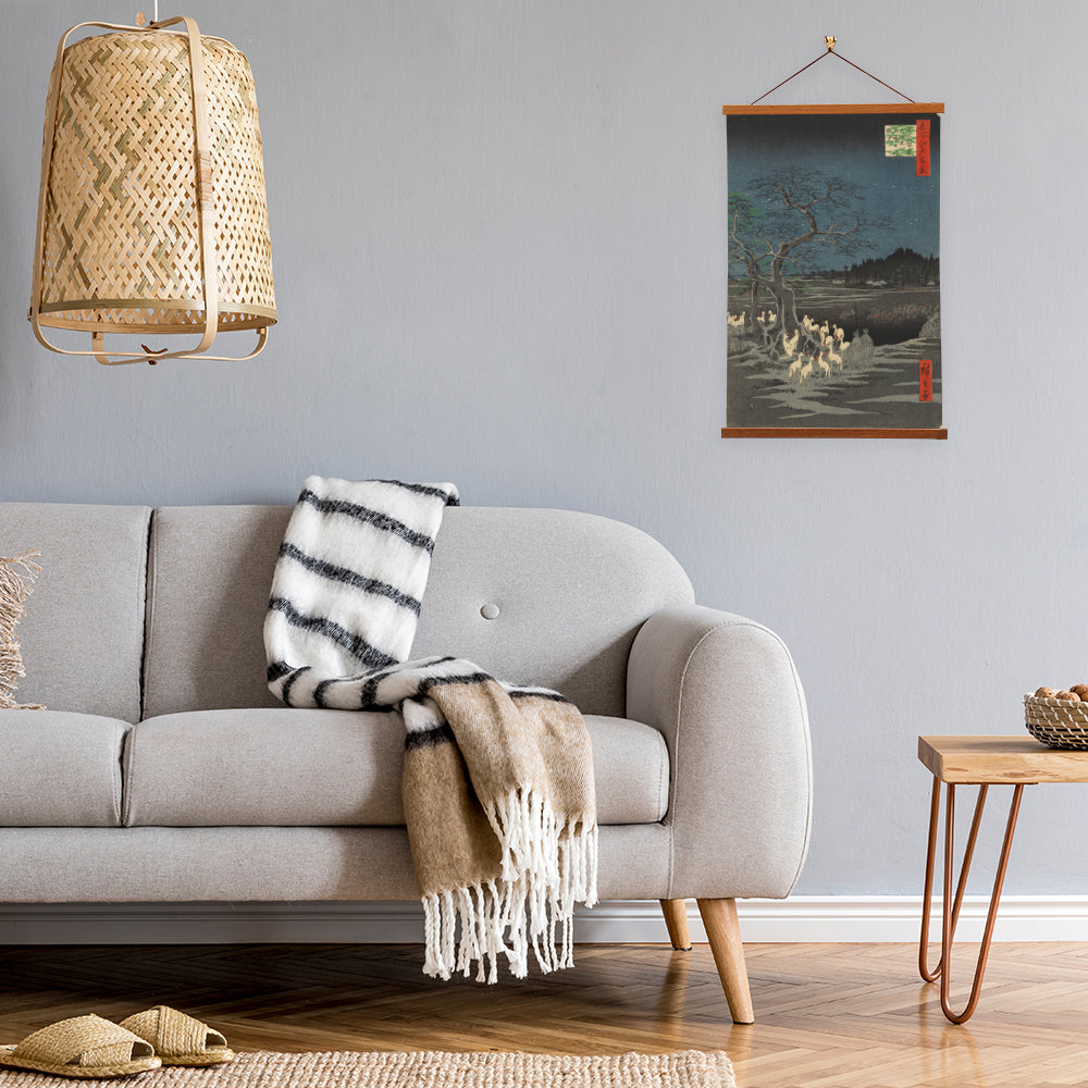 "New Year's Eve Foxfires at the Changing Tree, Oji" is a mesmerizing woodblock print by Utagawa Hiroshige. This iconic masterpiece captures the tranquility of Oji, Japan, on the eve of the New Year as fox spirits gather around a sacred tree, illuminated by ethereal flames. Hiroshige's intricate details and rich colors evoke a sense of mysticism and serenity, making it a timeless celebration of Japanese culture and the transition to a new year.