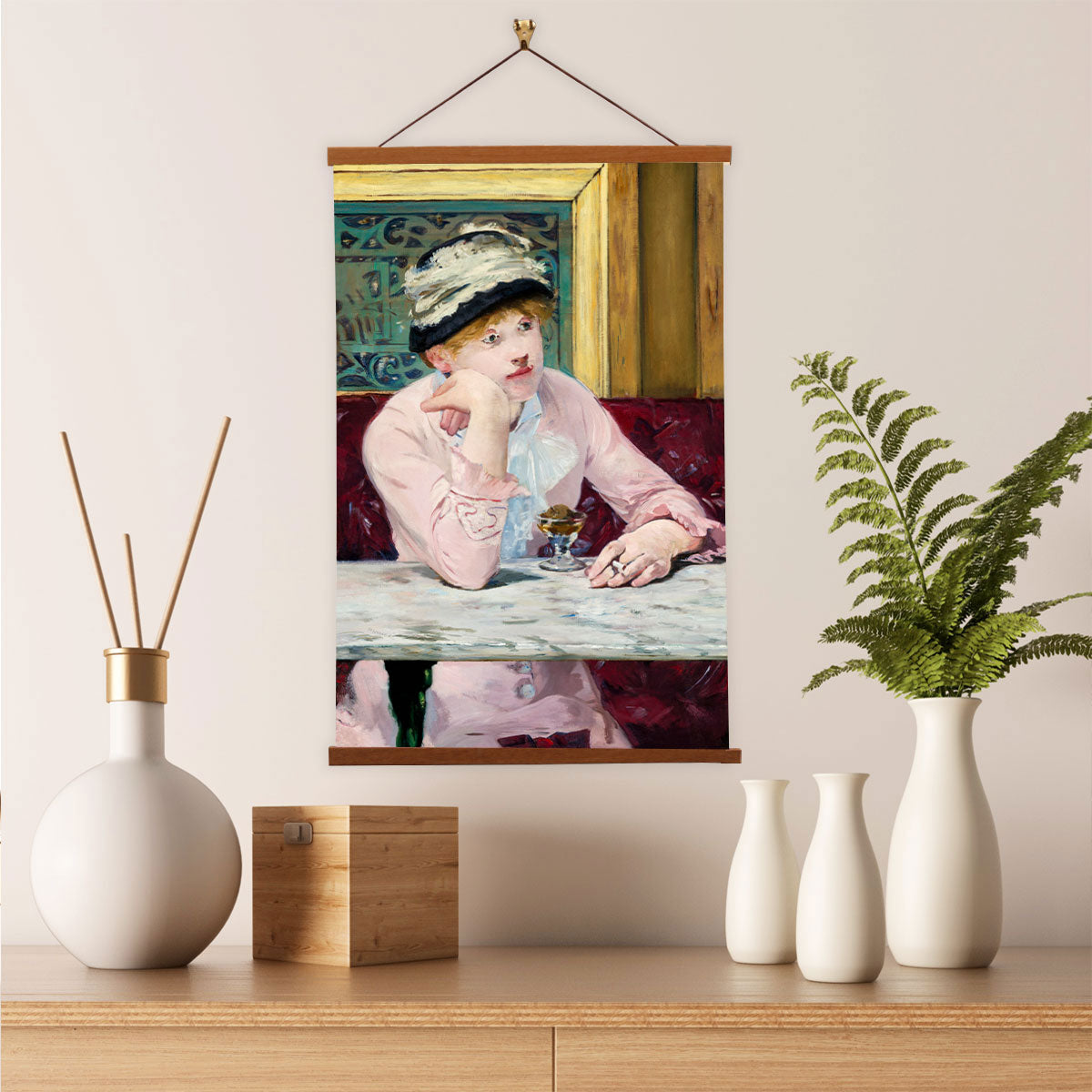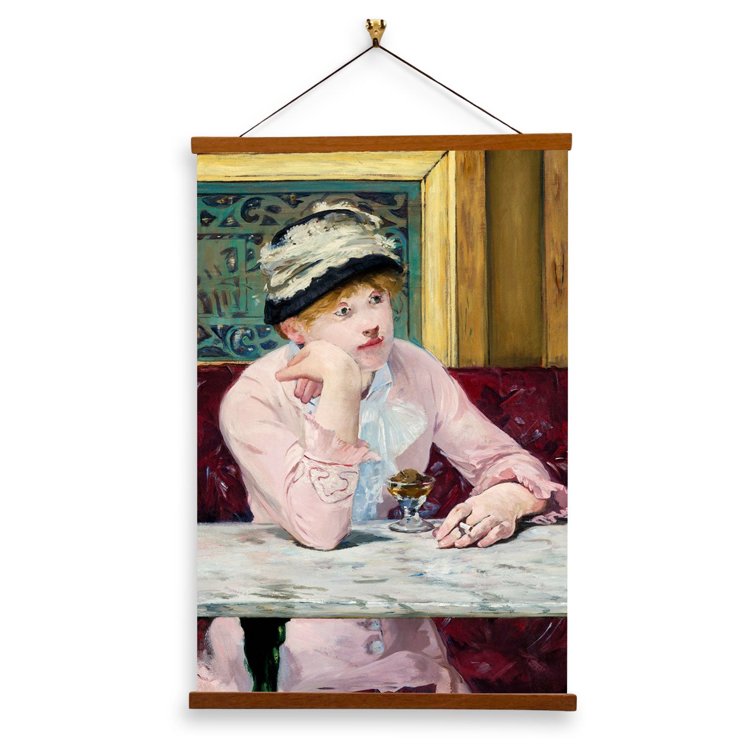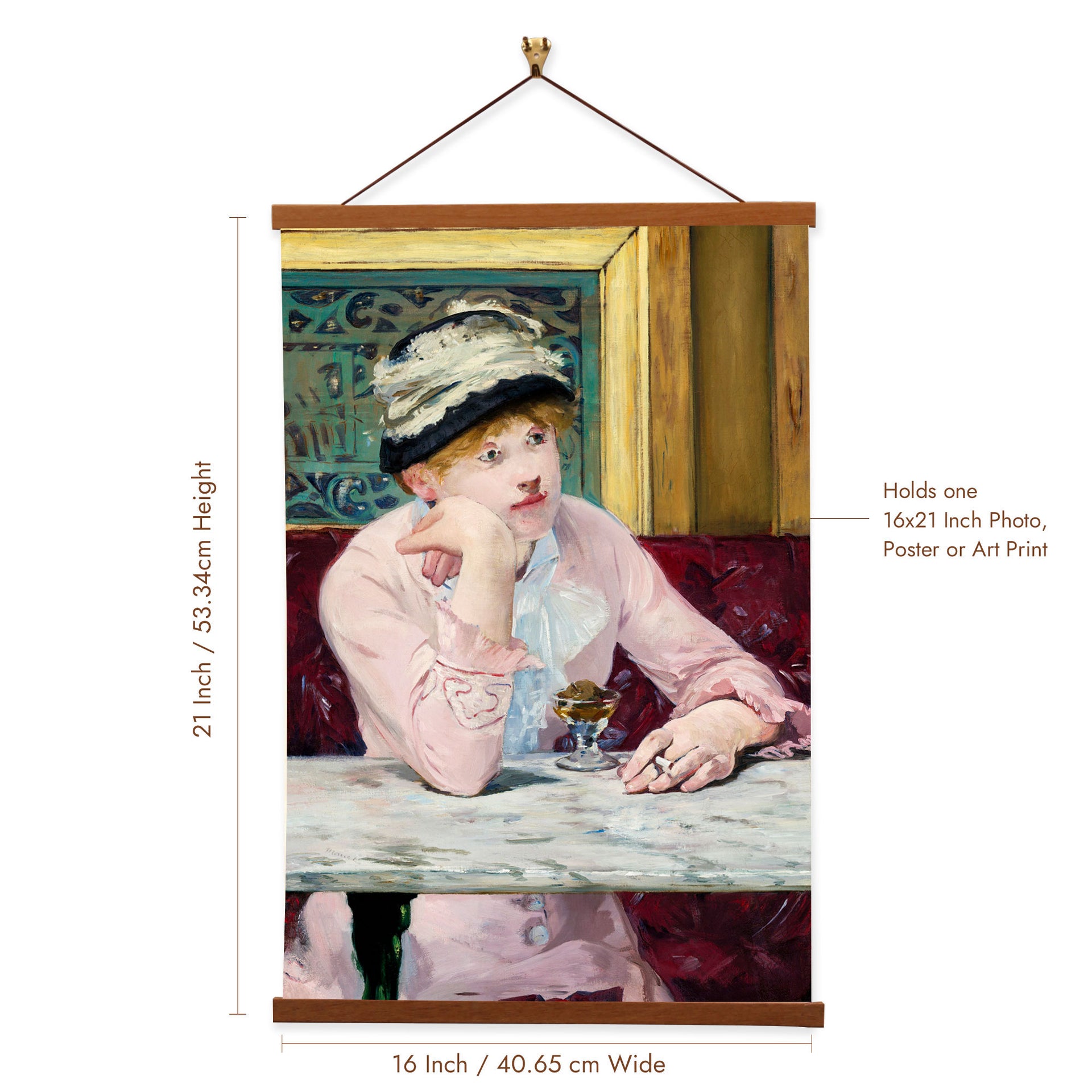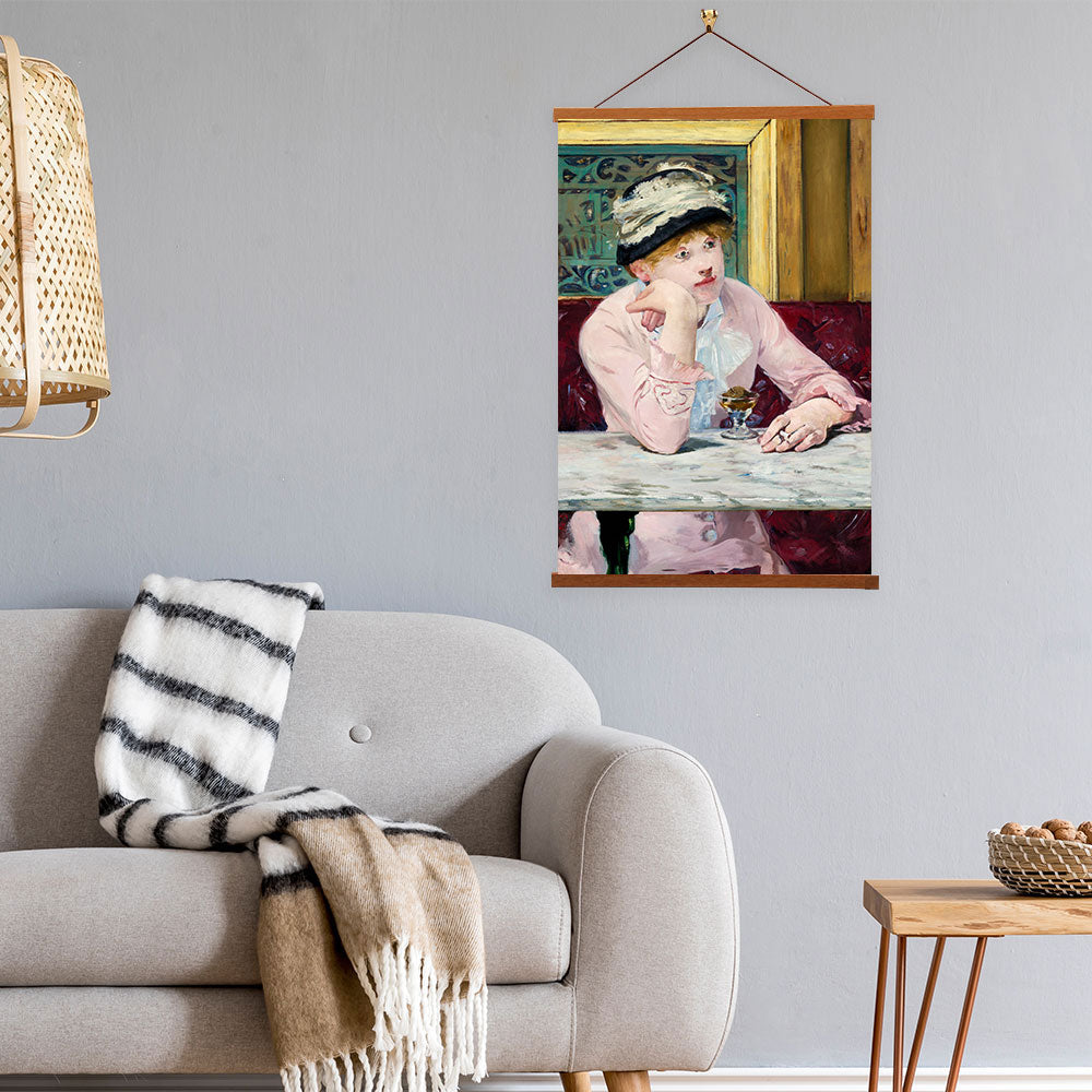 Our posters are elegantly suspended from a magnetic hanger crafted from rich walnut-colored wood, accentuated by a rustic rawhide string for a timeless and sophisticated display. Transform your space with this combination of artistry and craftsmanship.