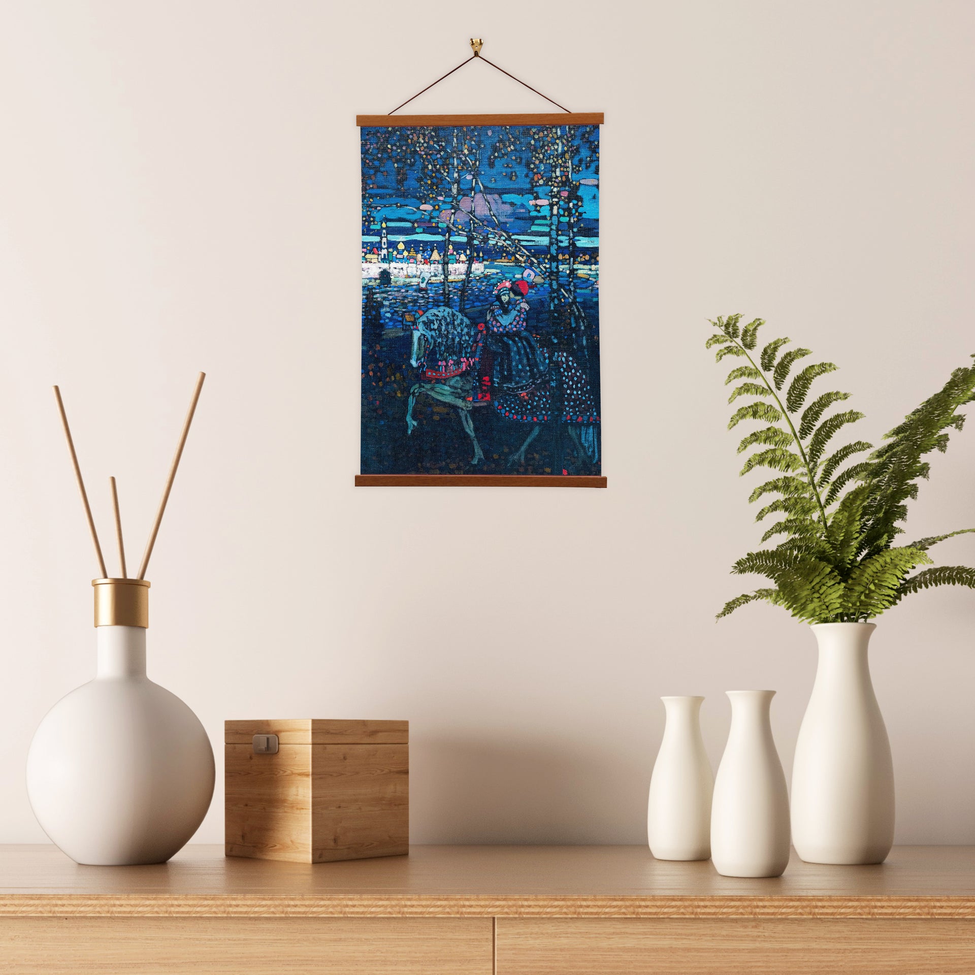 "Riding Couple (1906)" by Wassily Kandinsky captures the essence of early abstract art. This dynamic painting depicts a horseback rider and their companion, rendered in bold, colorful shapes and energetic brushstrokes. It's a pivotal work in Kandinsky's journey towards abstraction, heralding a revolutionary shift in artistic expression and perception.