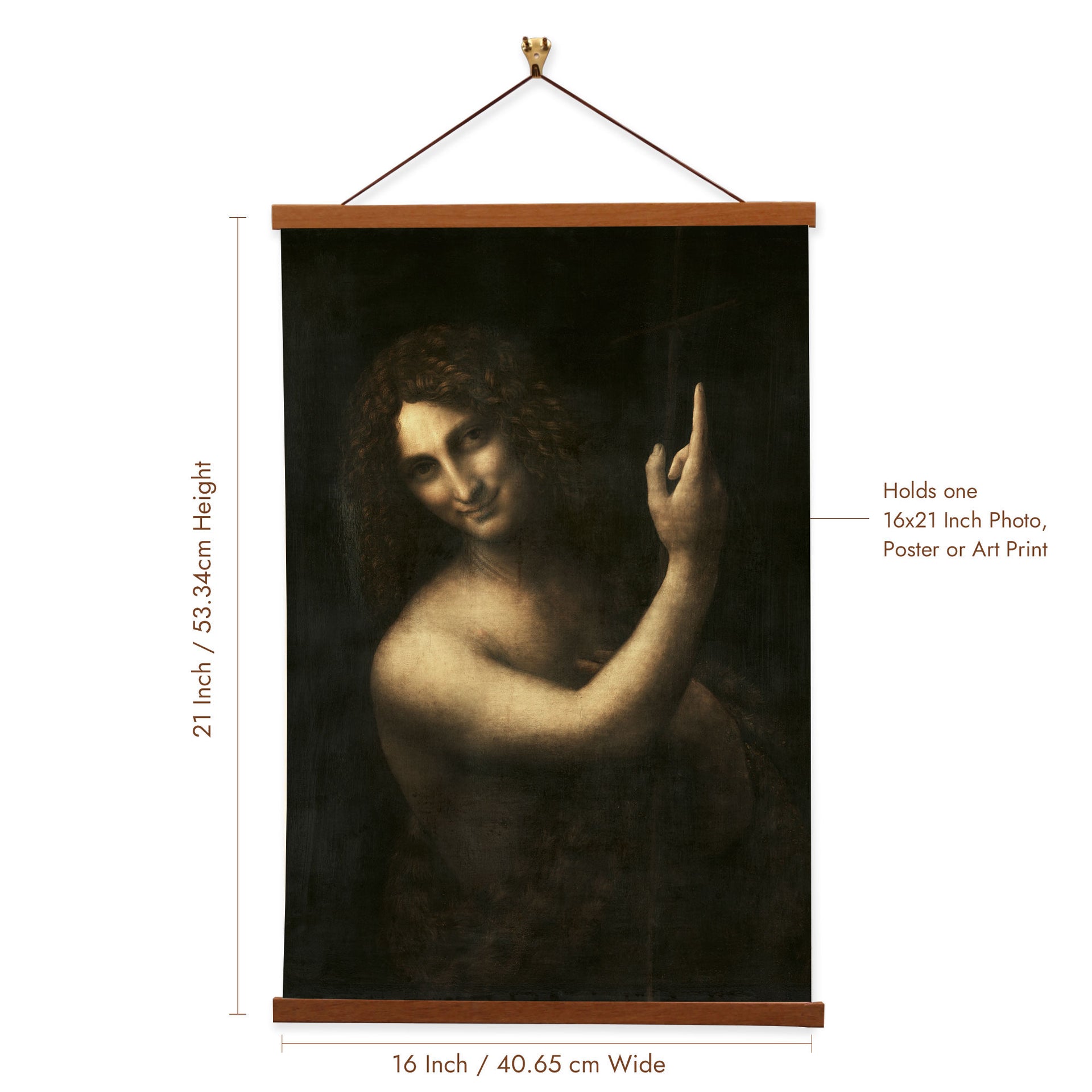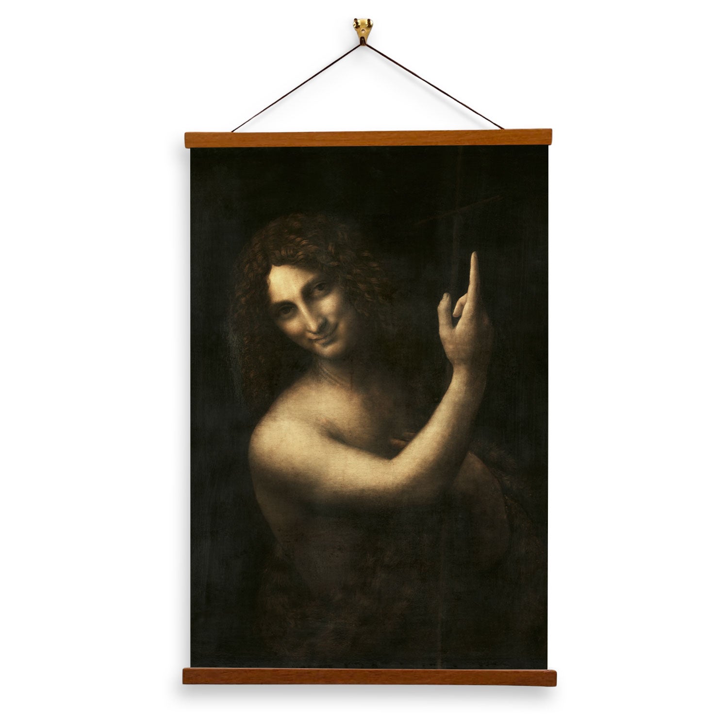 In this powerful and spiritual image, Leonardo presents Saint John the Baptist with an ethereal glow and a subtle, knowing expression. The upward-pointing gesture and shadowy background evoke mystery and divinity. A profound work that blends sensuality with religious symbolism, it showcases Leonardo’s late style and spiritual depth.