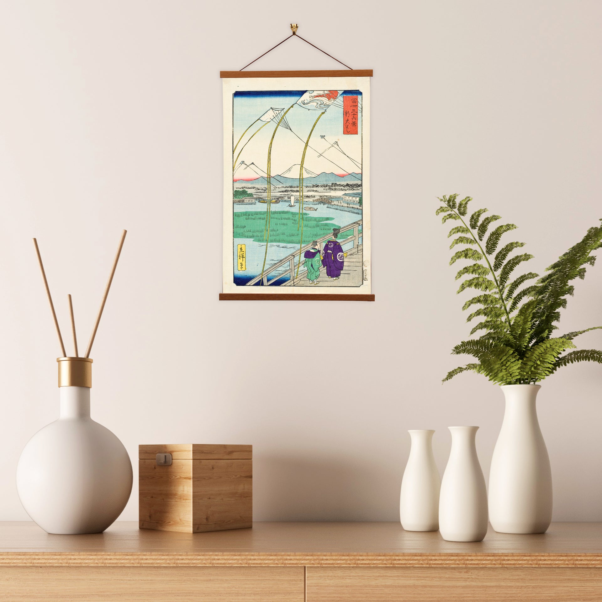 Shin Ōhashi by Utagawa Hiroshige is a captivating woodblock print from the 19th century Edo period. This iconic artwork showcases a bustling Japanese bridge, bathed in the soft hues of a setting sun. Hiroshige's masterful use of color and detail transports viewers to the heart of old Edo, evoking a sense of tranquility amid urban life.