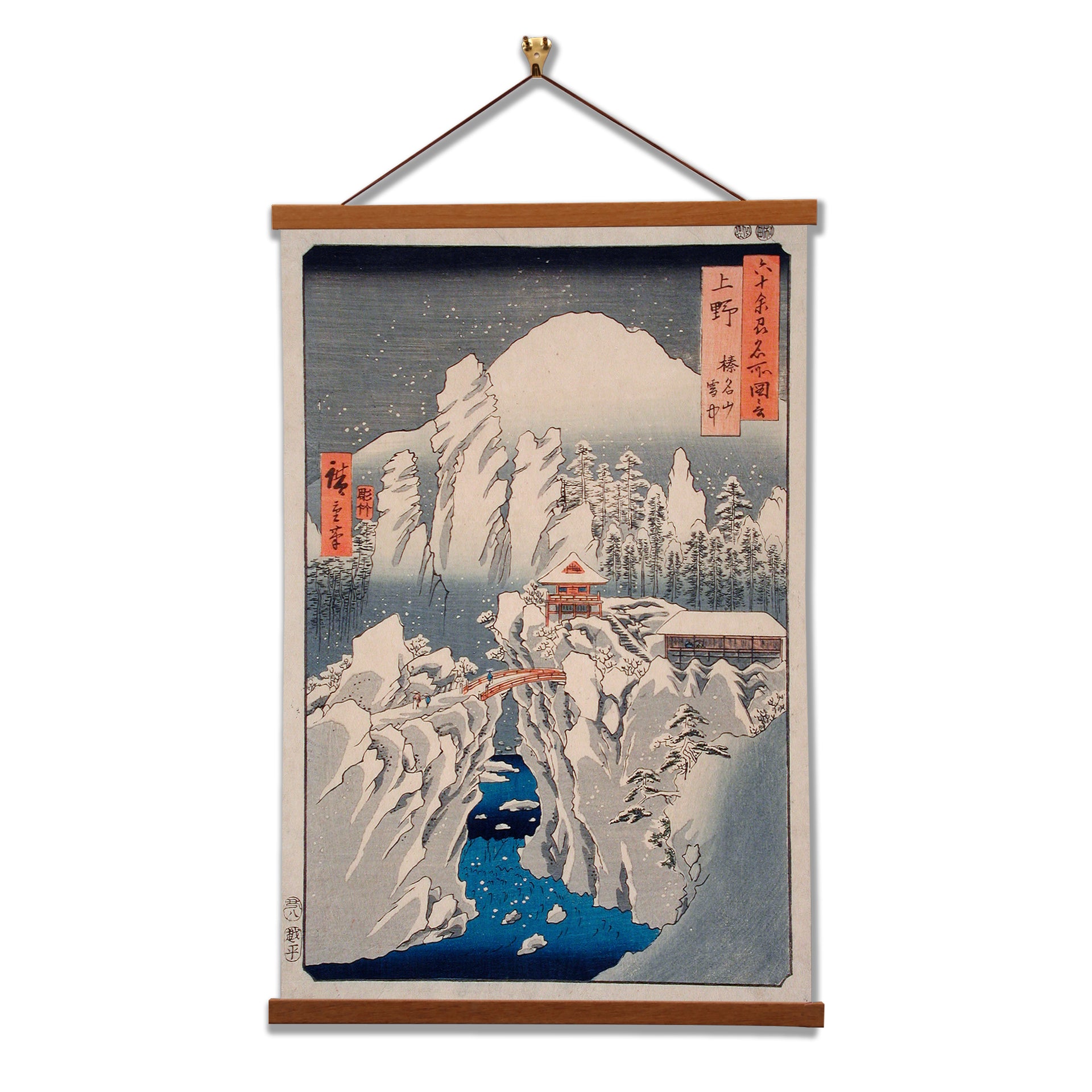"Snow on Mt. Haruna in Kōzuke Province" by Utagawa Hiroshige is a mesmerizing woodblock print from the iconic "Fifty-Three Stations of the Tōkaidō" series. Hiroshige captures the tranquil beauty of a snow-covered landscape with remarkable precision, depicting the majestic peak of Mt. Haruna shrouded in a serene, winter blanket.