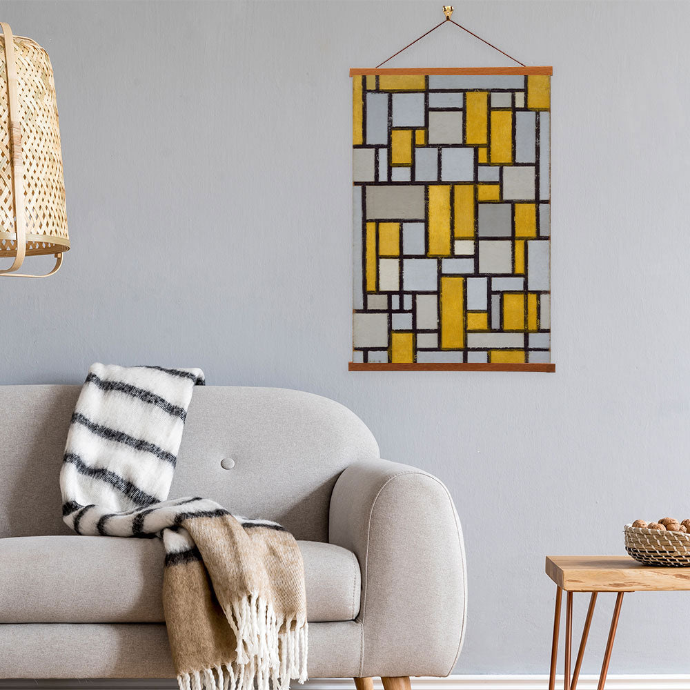 "Composition with Grid 1" by Piet Mondrian is a striking example of his signature abstract style, featuring a dynamic arrangement of black lines and primary-colored rectangles. Created in the early 20th century, this artwork embodies the principles of Neoplasticism, emphasizing harmony and balance through geometric simplicity. With its bold structure and refined color palette, this piece remains a timeless representation of Mondrian’s influence on modern art and design.