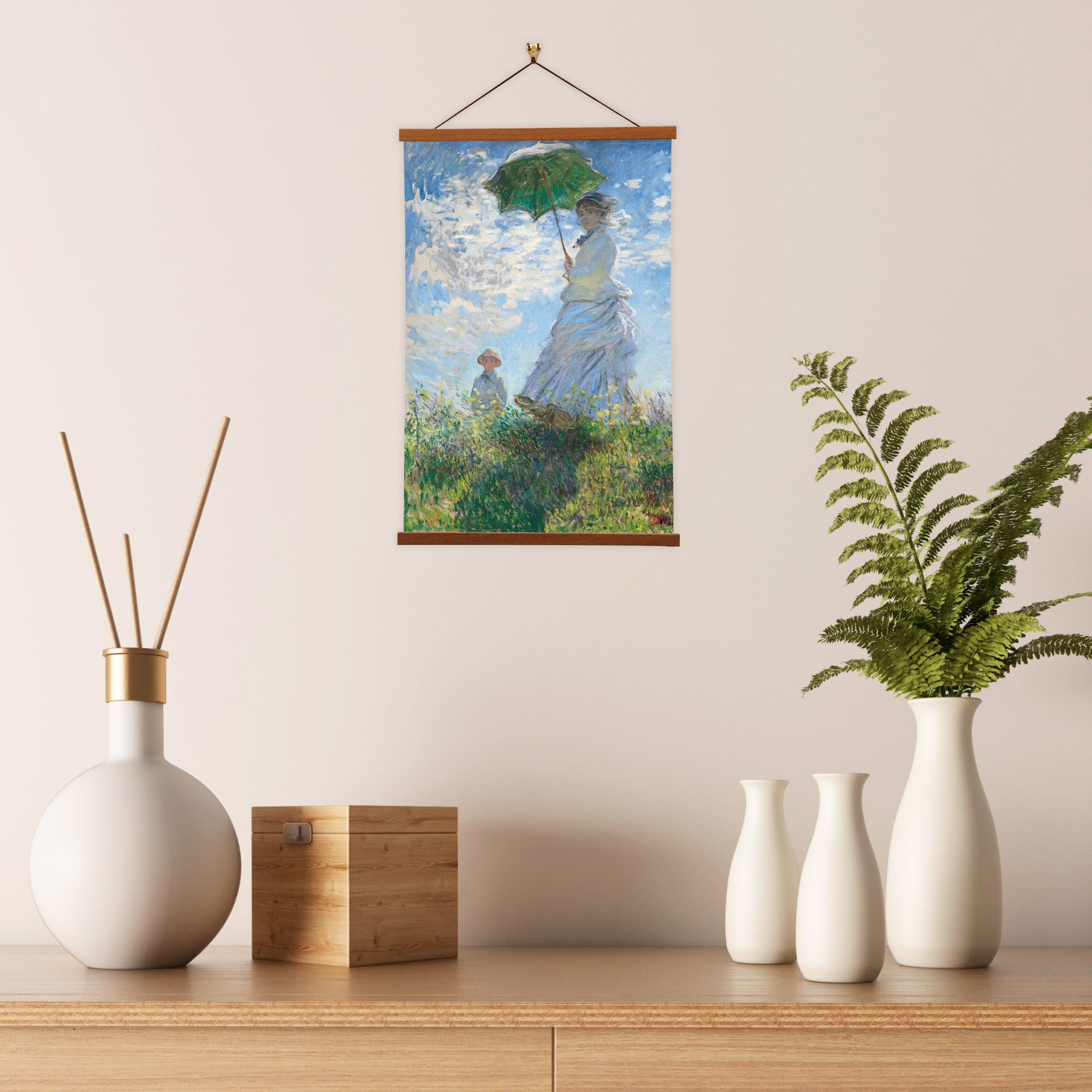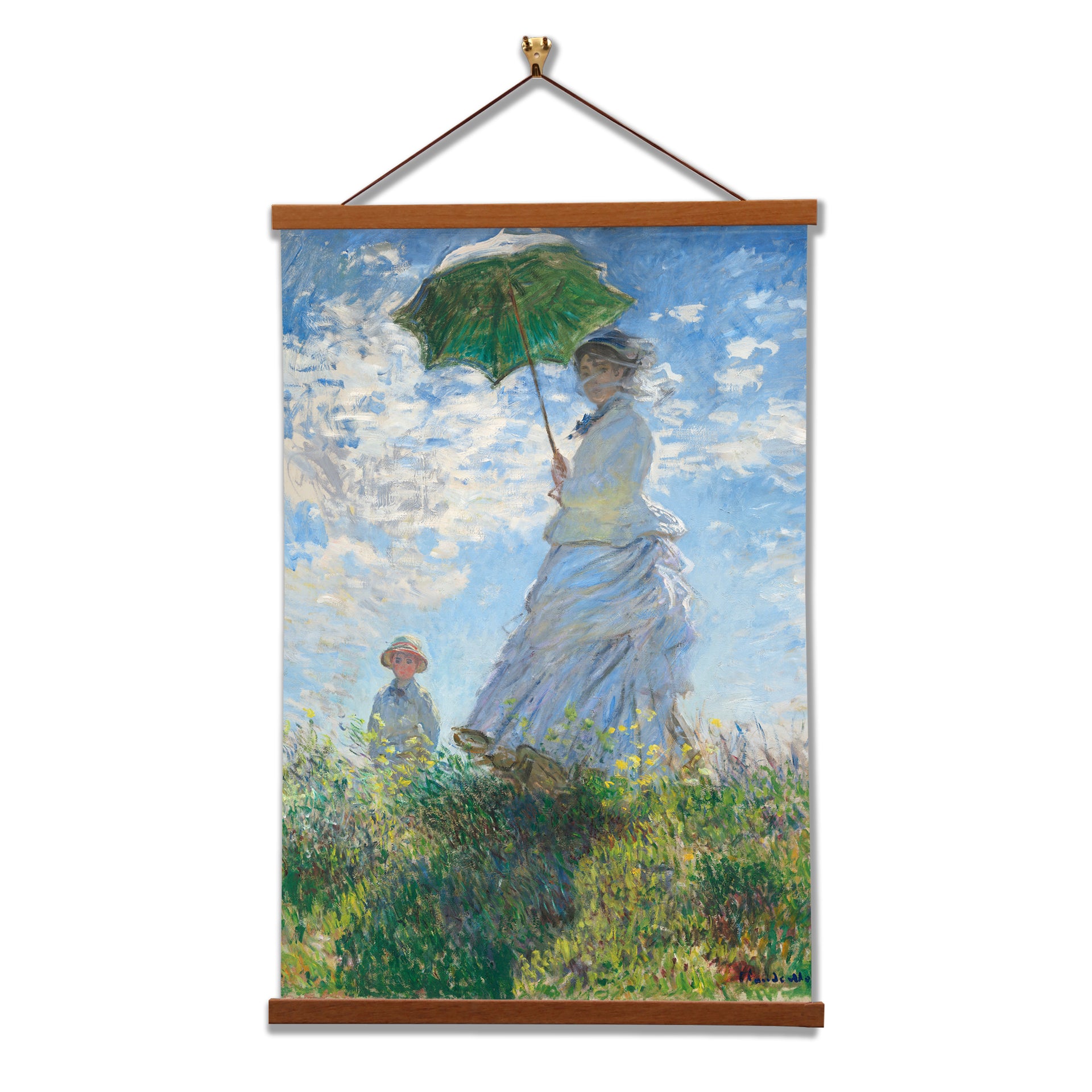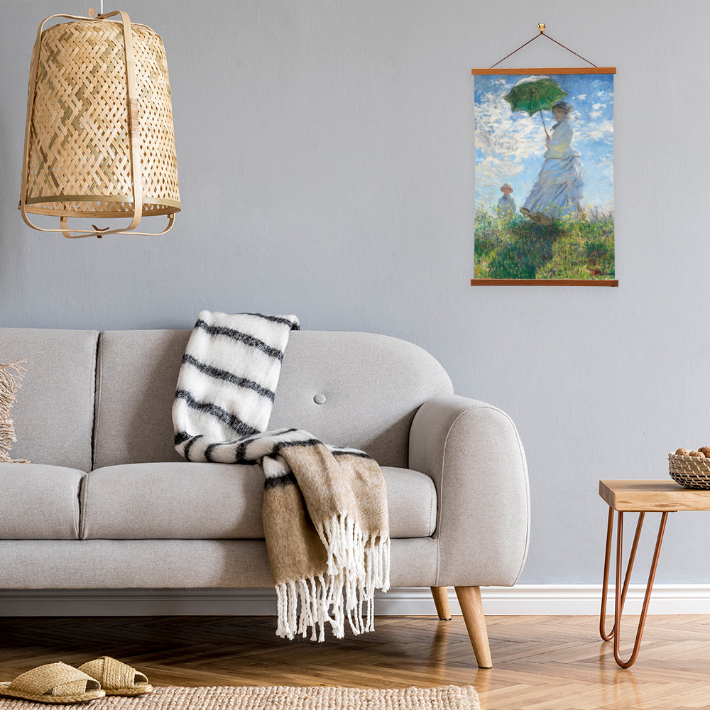 Our posters is elegantly suspended from a magnetic hanger crafted from rich walnut-colored wood, accentuated by a rustic rawhide string for a timeless and sophisticated display. Transform your space with this combination of artistry and craftsmanship.