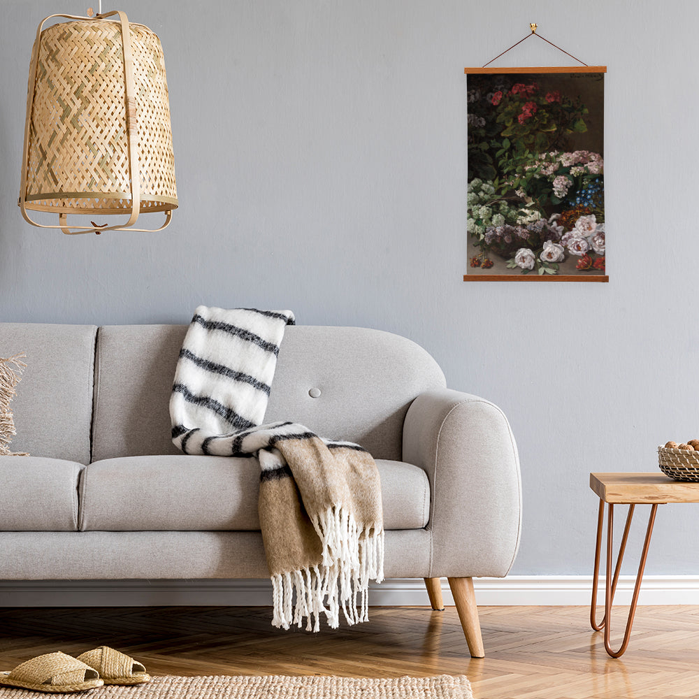 Our posters is elegantly suspended from a magnetic hanger crafted from rich walnut-colored wood, accentuated by a rustic rawhide string for a timeless and sophisticated display. Transform your space with this combination of artistry and craftsmanship.