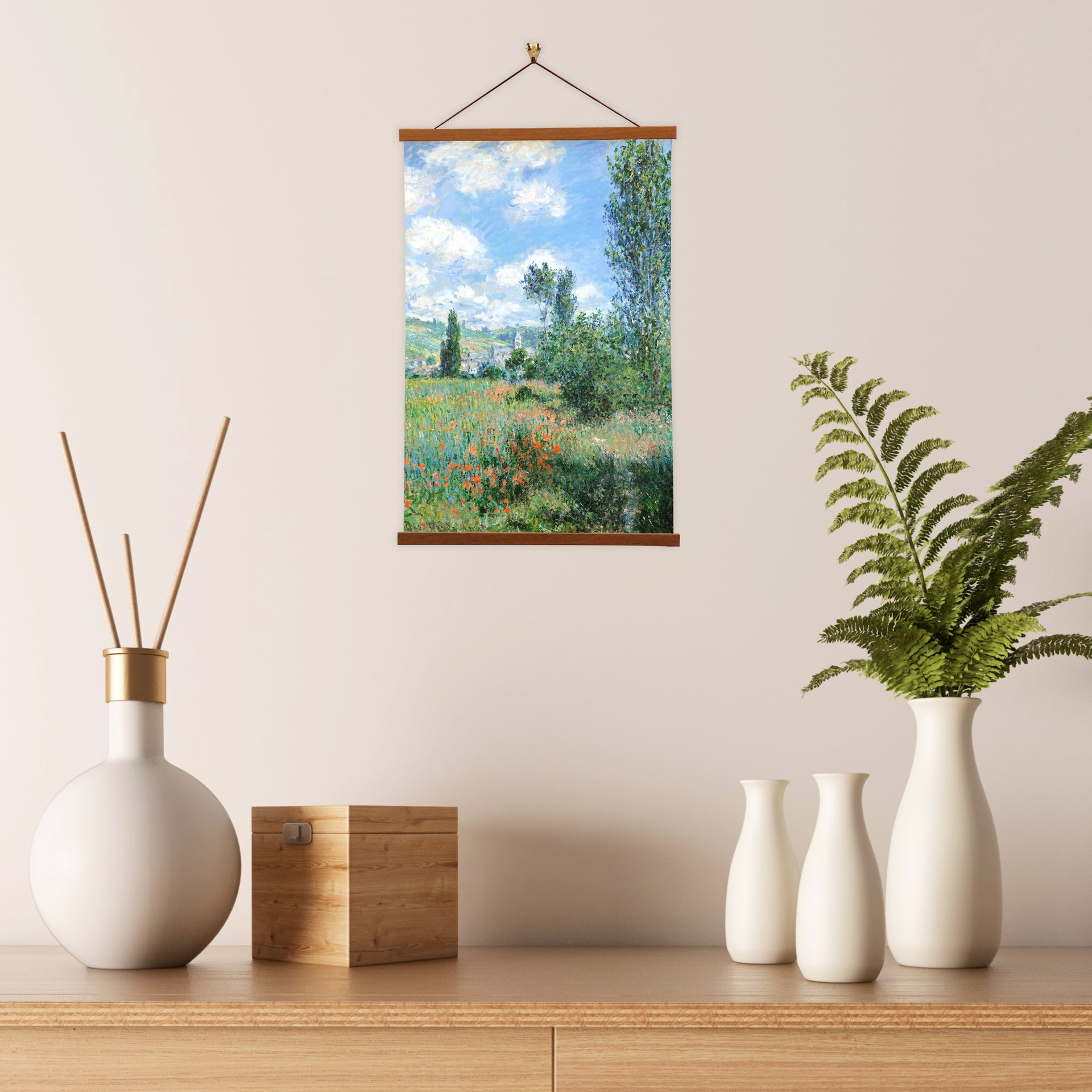 "View of Vétheuil (1880)" by Claude Monet captures the tranquil beauty of the French village, Vétheuil, on the banks of the Seine. Monet's masterful use of light and color imbues the scene with a sense of serenity, reflecting his signature Impressionist style. This painting invites viewers to experience the harmonious blend of nature and human habitation, evoking a profound connection to the countryside.