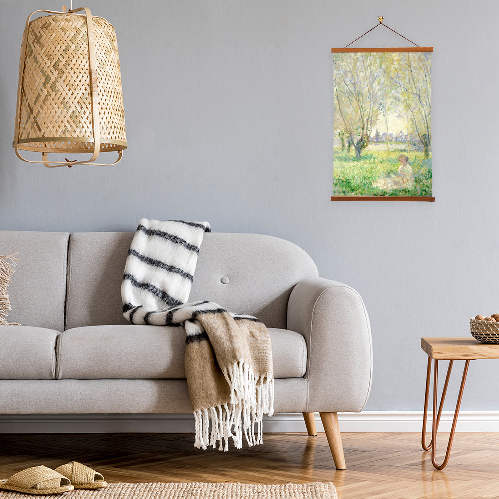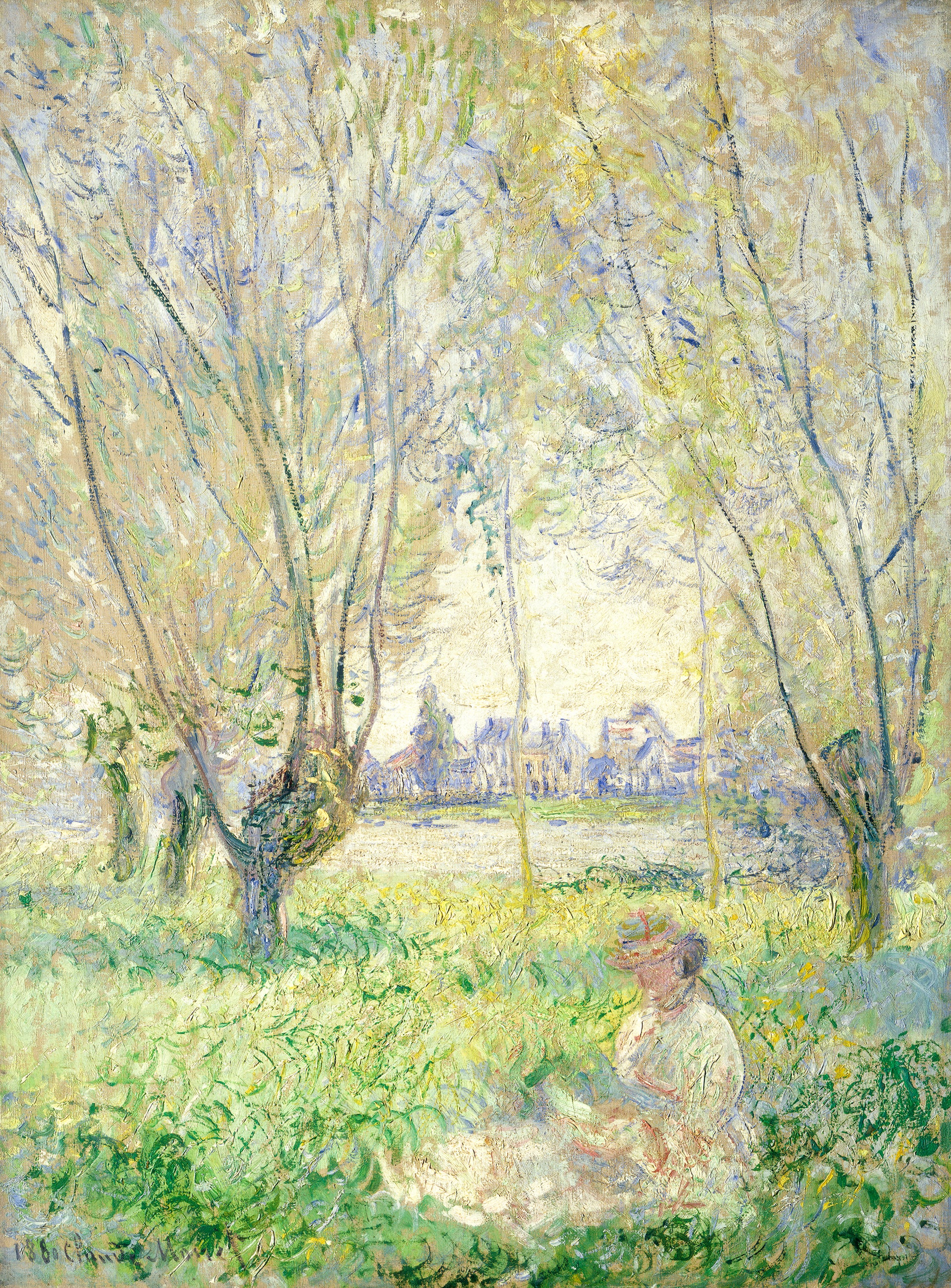 "Woman Seated under the Willows," painted in 1880 by Claude Monet, captures a tranquil scene of a woman sitting beneath the shade of weeping willow trees on the banks of the Seine. Monet's mastery of light and color creates a serene atmosphere, where nature and human presence harmoniously coexist.