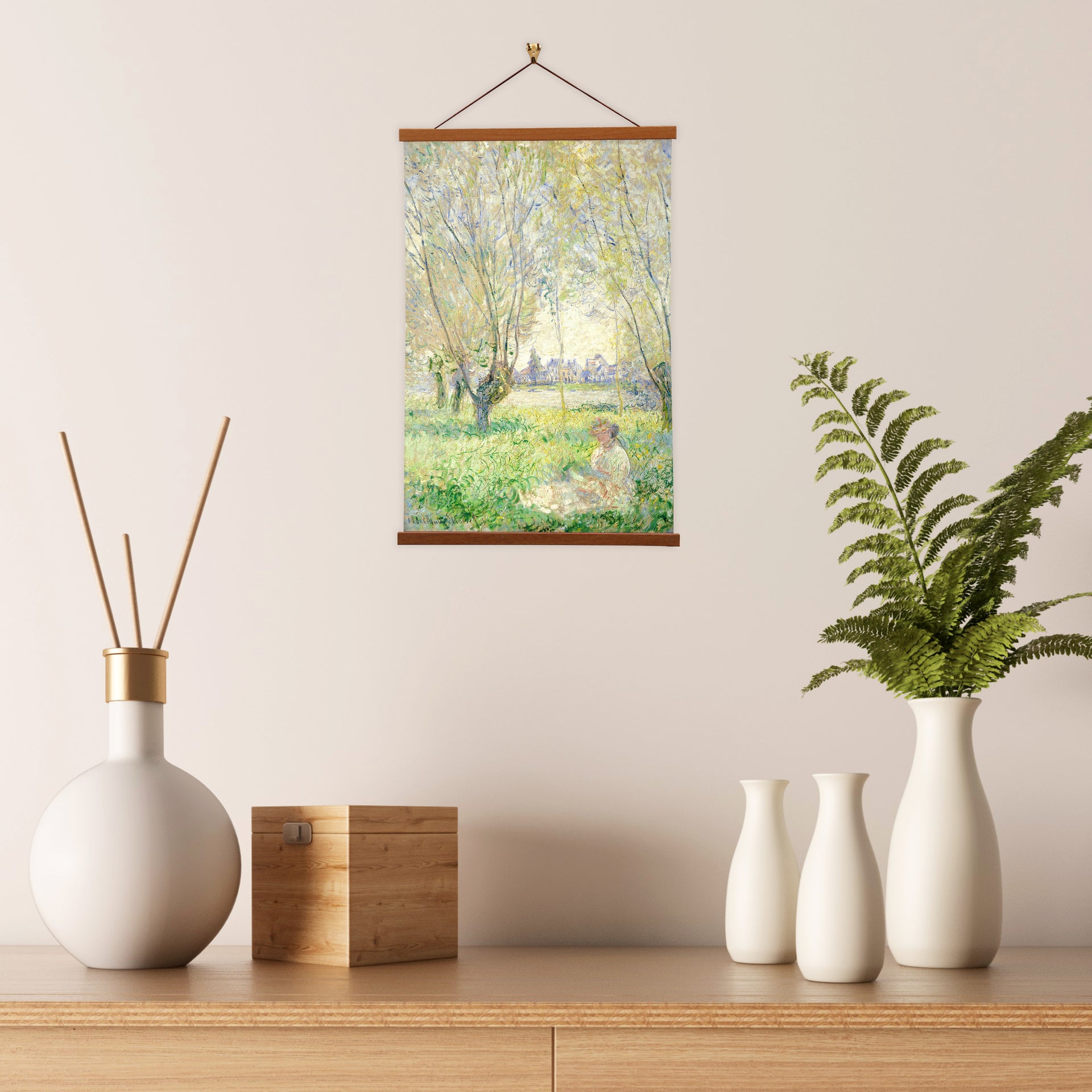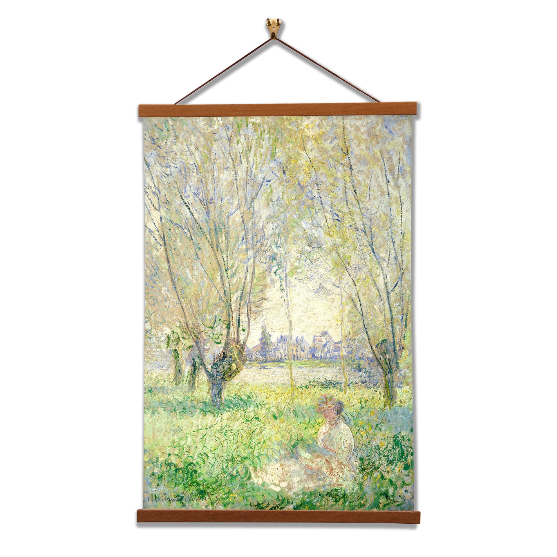 Our posters is elegantly suspended from a magnetic hanger crafted from rich walnut-colored wood, accentuated by a rustic rawhide string for a timeless and sophisticated display. Transform your space with this combination of artistry and craftsmanship.