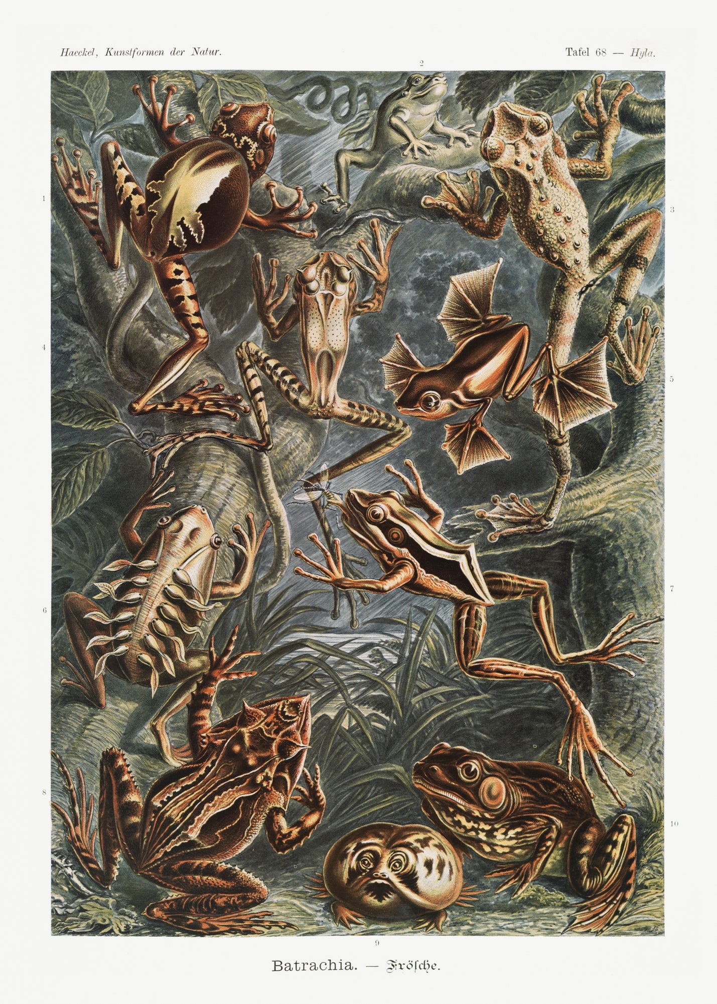 "Batrachia–Frösche" is a captivating work by Ernst Haeckel, a renowned biologist and artist. This masterpiece, published in the late 19th century, beautifully combines science and art. It showcases Haeckel's meticulous illustrations of frogs and their diverse species, providing a profound insight into the world of amphibians.