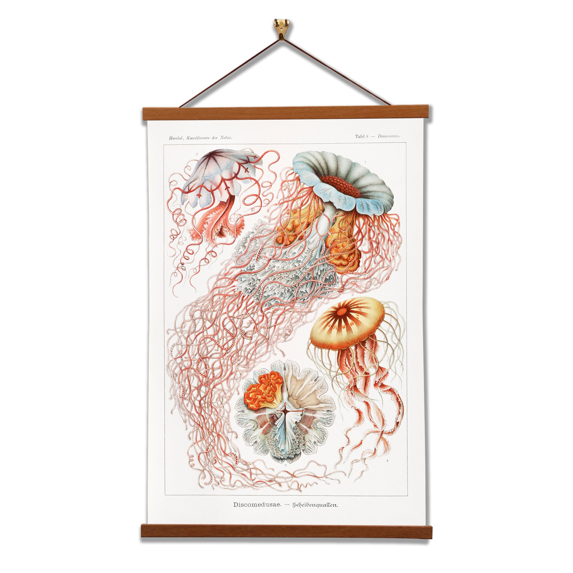 Ernst Haeckel's "Discomedusae–Scheibenquallen (Jellyfish - Table 8)" is a stunning 19th-century scientific illustration from his renowned work, "Kunstformen der Natur" (Art Forms of Nature). This exquisite plate showcases the intricate and diverse forms of disc-shaped jellyfish, capturing their ethereal beauty and contributing to our understanding of marine life's visual diversity.