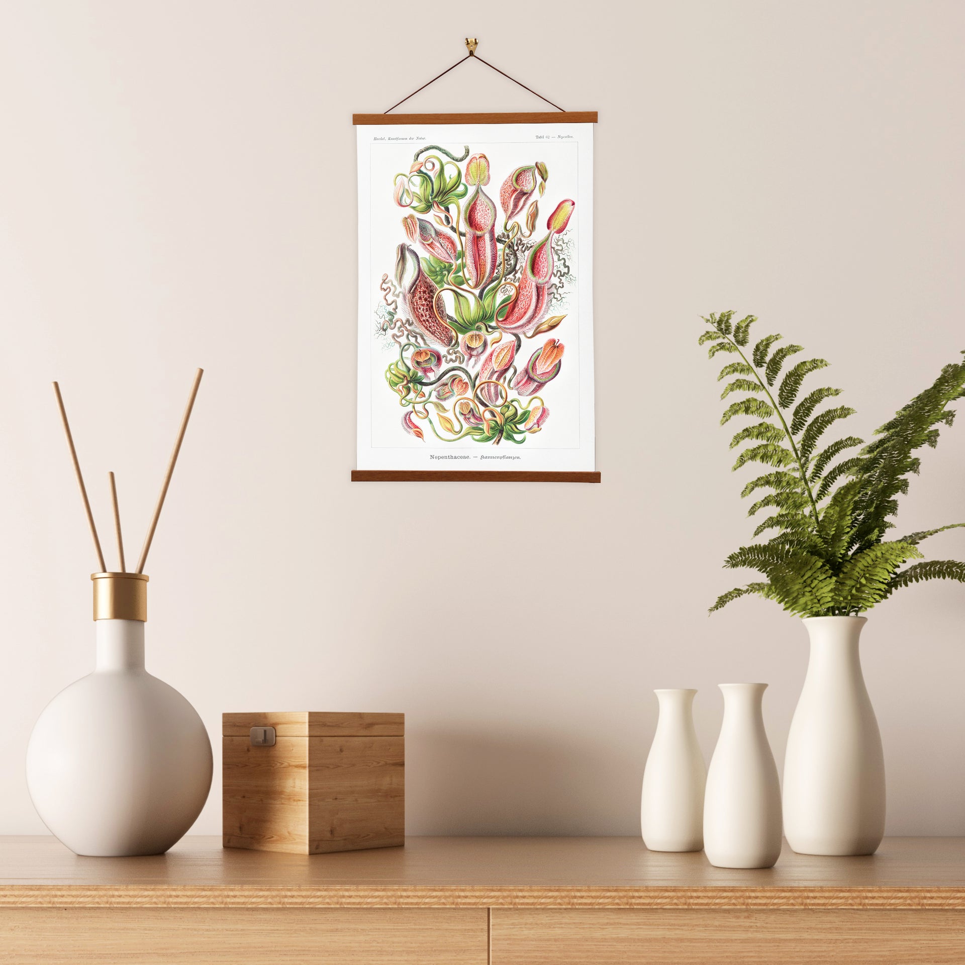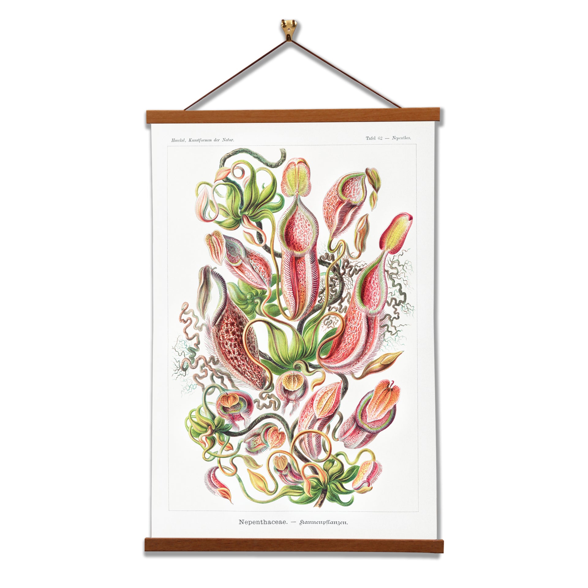 "Nepenthaceae – Kannenpflanzen," as illustrated in Table 62 by Ernst Haeckel, is a captivating representation of pitcher plants. Haeckel's intricate artwork beautifully showcases these carnivorous plants known for their unique pitcher-shaped leaves, designed to trap and digest insects. This botanical masterpiece offers a glimpse into the fascinating world of plant adaptations.