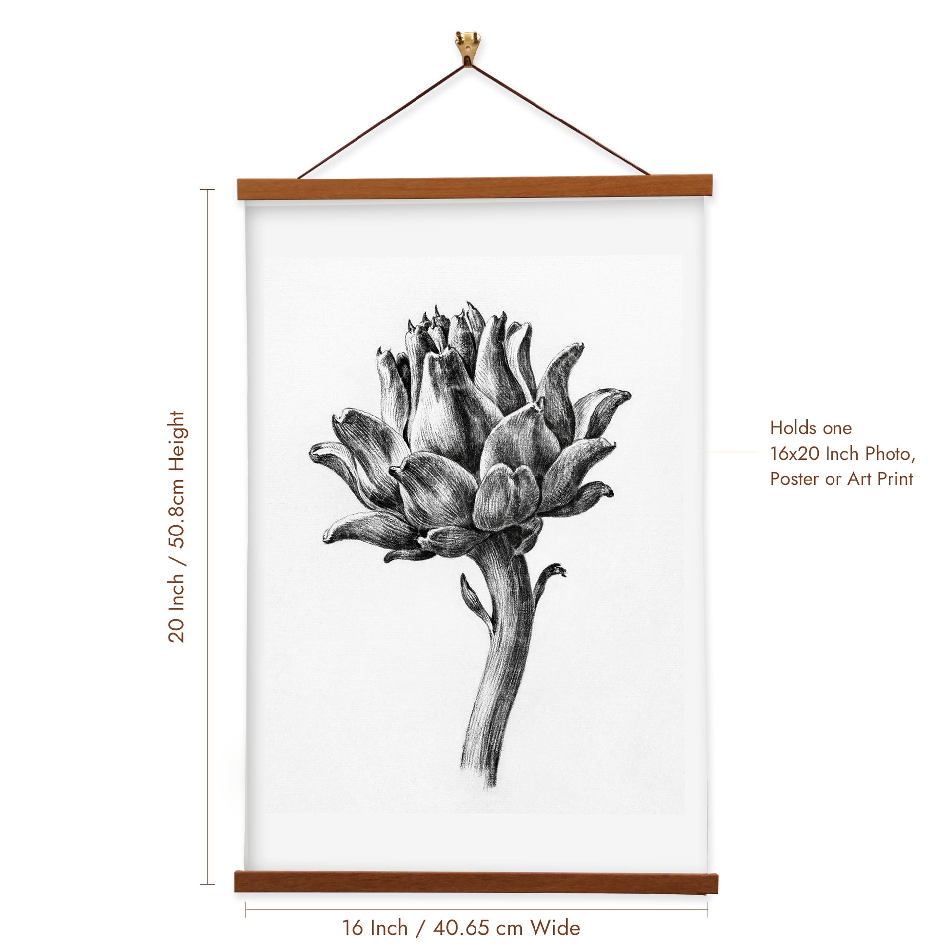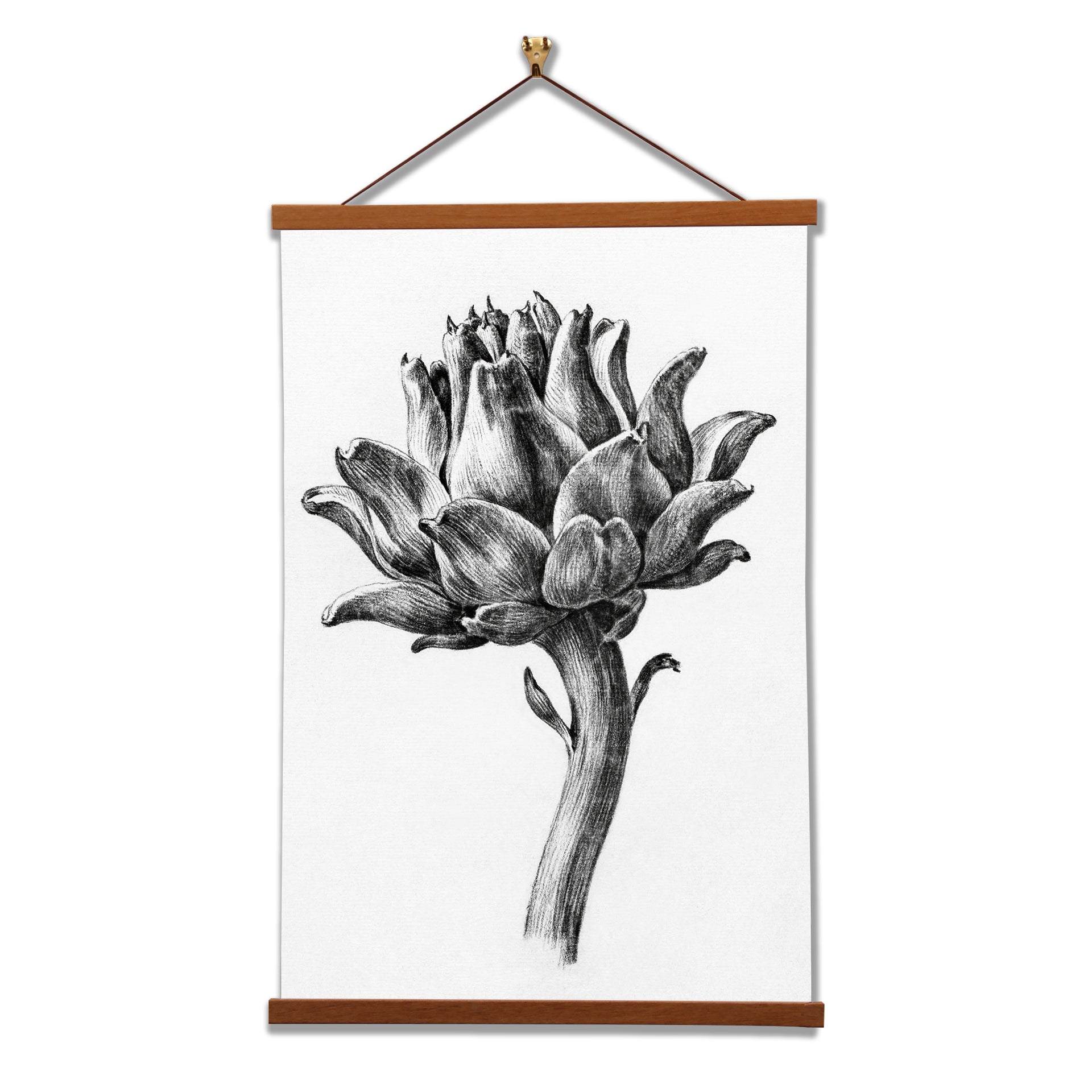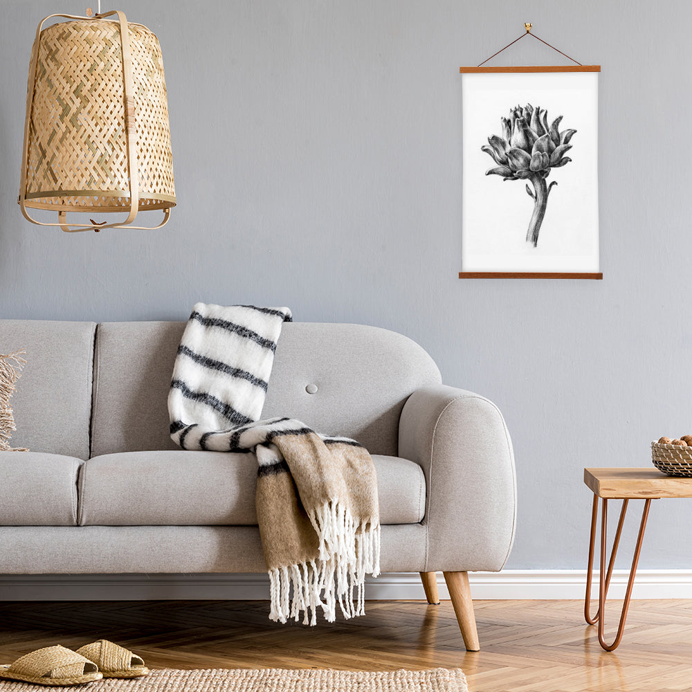 Our posters are elegantly suspended from a magnetic hanger crafted from rich walnut-colored wood, accentuated by a rustic rawhide string for a timeless and sophisticated display. Transform your space with this combination of artistry and craftsmanship.
