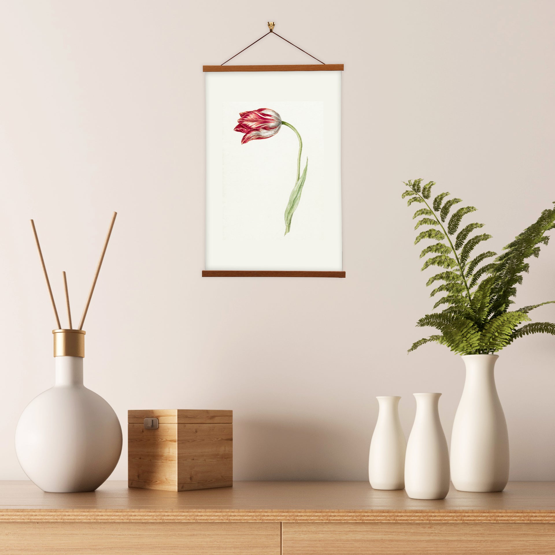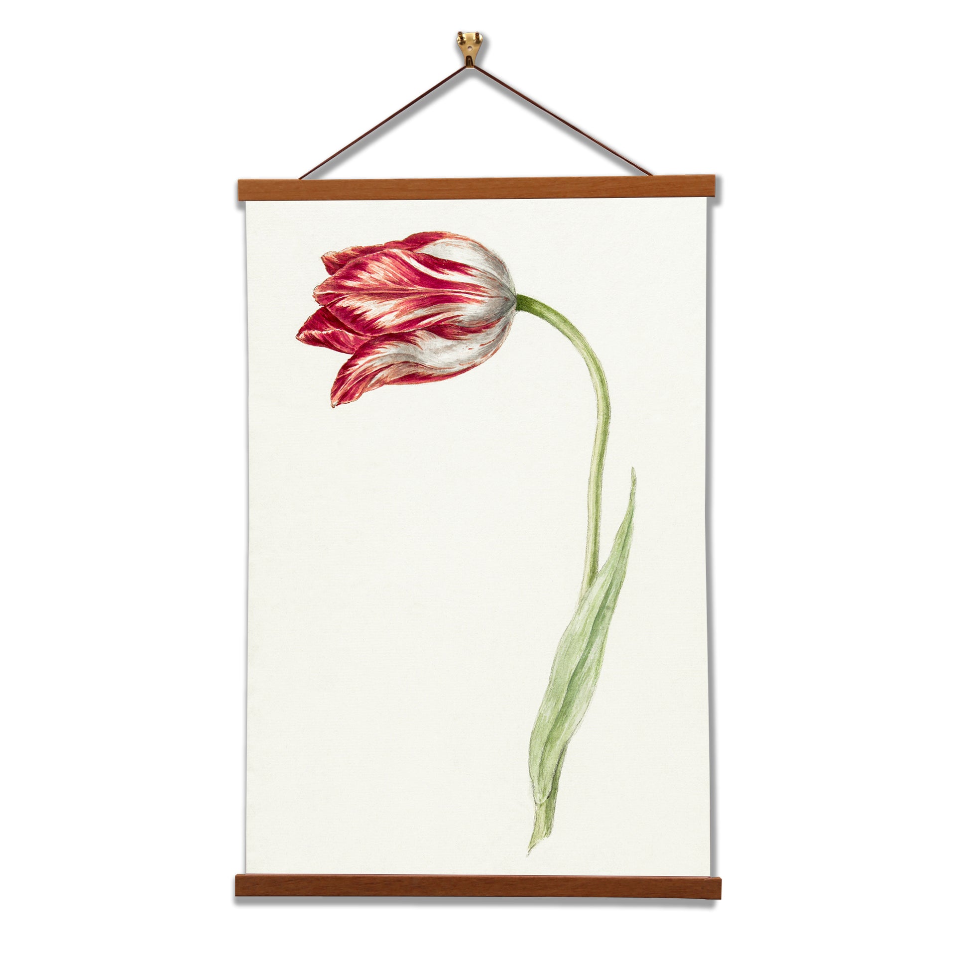Grace your home with delicate beauty through Jean Bernard's 1775 poster featuring a pink tulip. This vintage masterpiece exquisitely renders the beloved flower's form and vibrant hue with realism. Bernard's mastery of light and shadow reveals the tulip's nuanced petals and stem with remarkable skill, evoking a lifelike presence that almost allows you to inhale its fragrance.