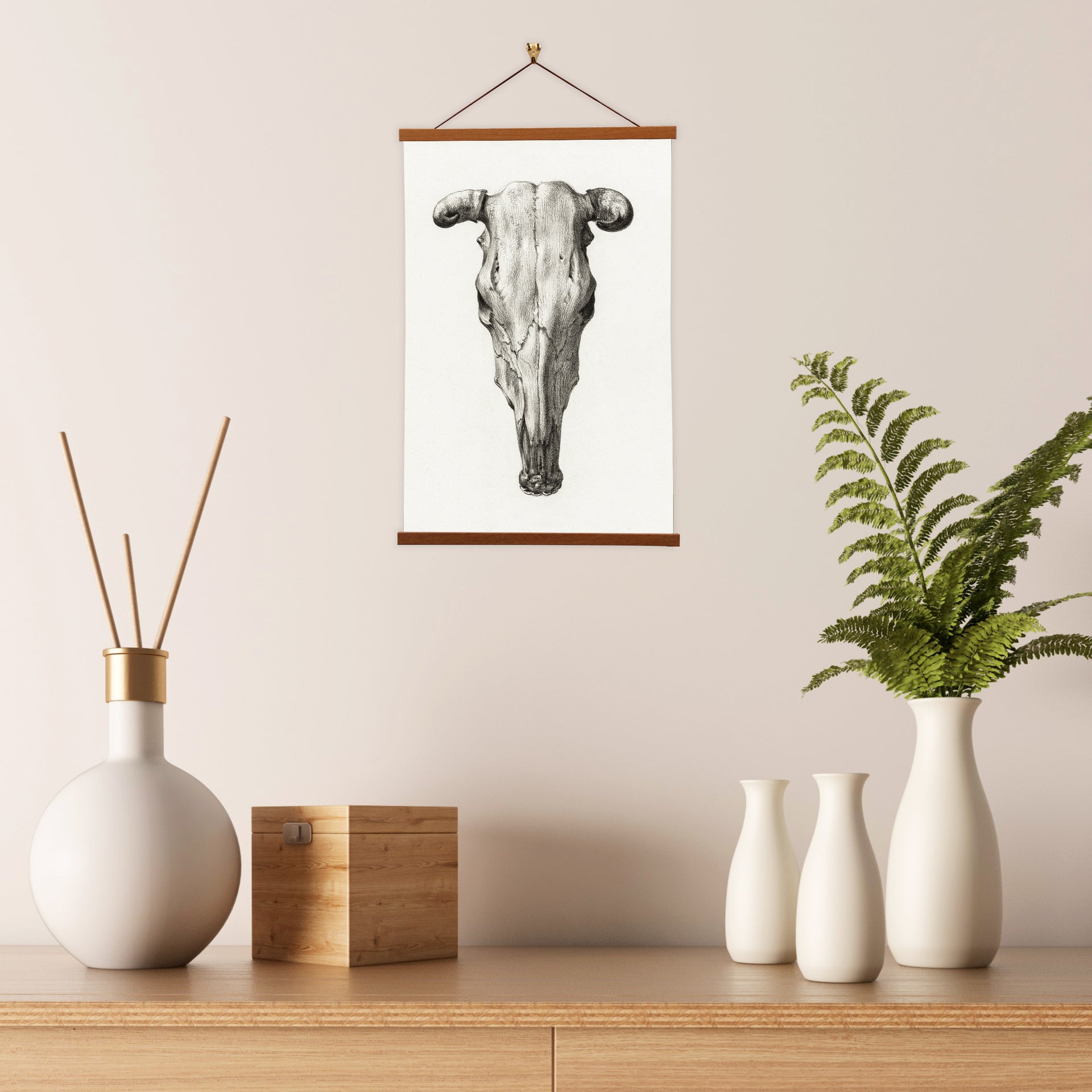 Our posters is elegantly suspended from a magnetic hanger crafted from rich walnut-colored wood, accentuated by a rustic rawhide string for a timeless and sophisticated display. Transform your space with this combination of artistry and craftsmanship.