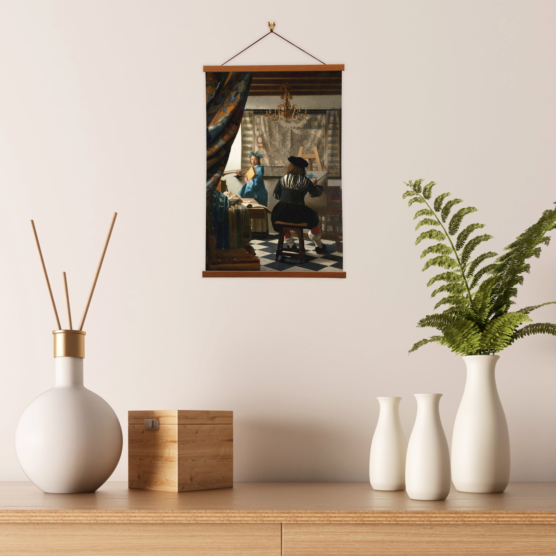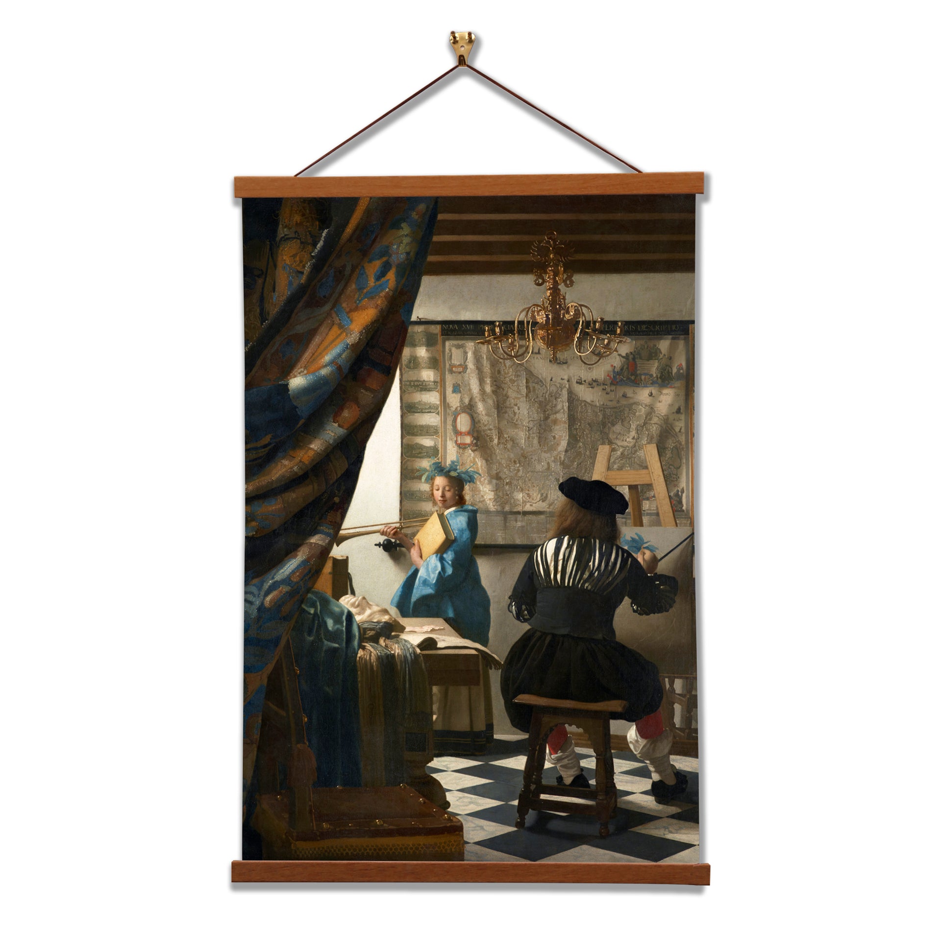 "The Allegory of Painting" by Johannes Vermeer is a captivating 17th-century Dutch masterpiece. This enigmatic artwork features a young woman, an allegorical representation of the art of painting, in a sunlit studio. The painting skillfully combines realism and symbolism, highlighting Vermeer's mastery of light, detail, and storytelling within a single canvas.