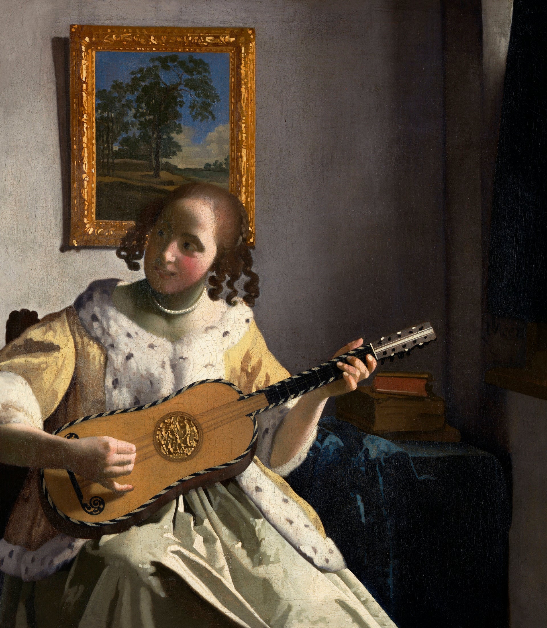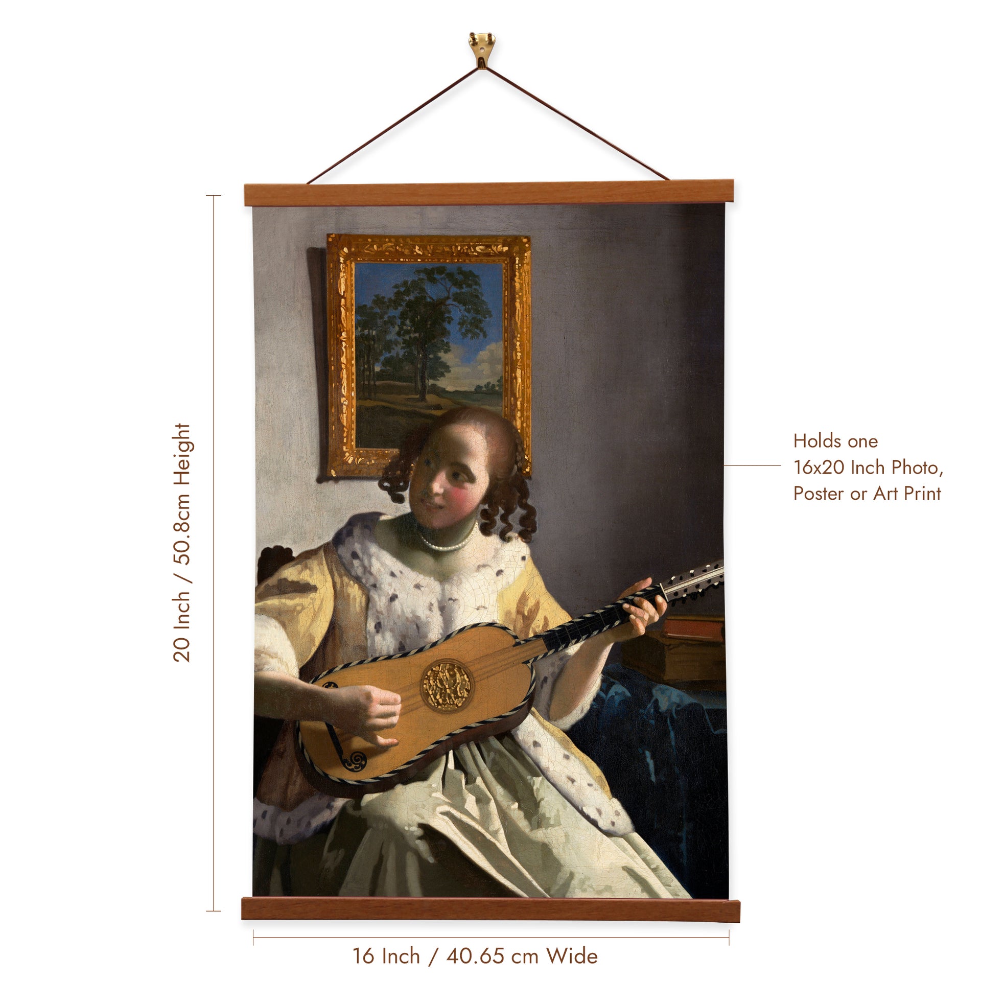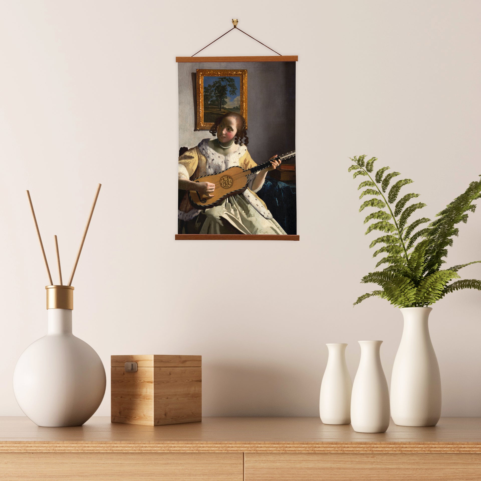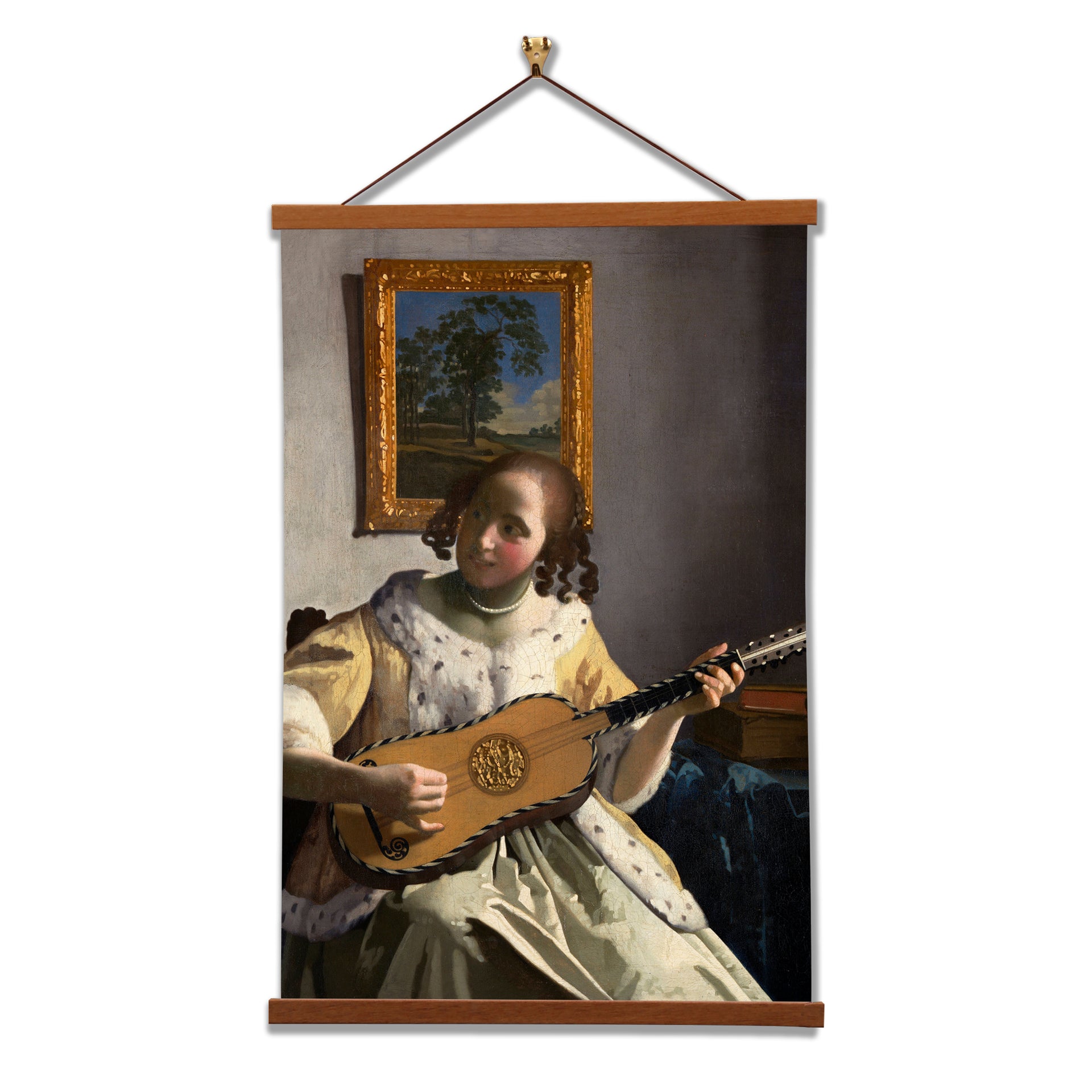 "The Guitar Player" by Johannes Vermeer is a captivating 17th-century Dutch masterpiece. This intimate genre painting portrays a young woman absorbed in playing a guitar, bathed in soft, natural light. Vermeer's meticulous attention to detail and mastery of color and composition make this artwork a stunning representation of Dutch Baroque art.