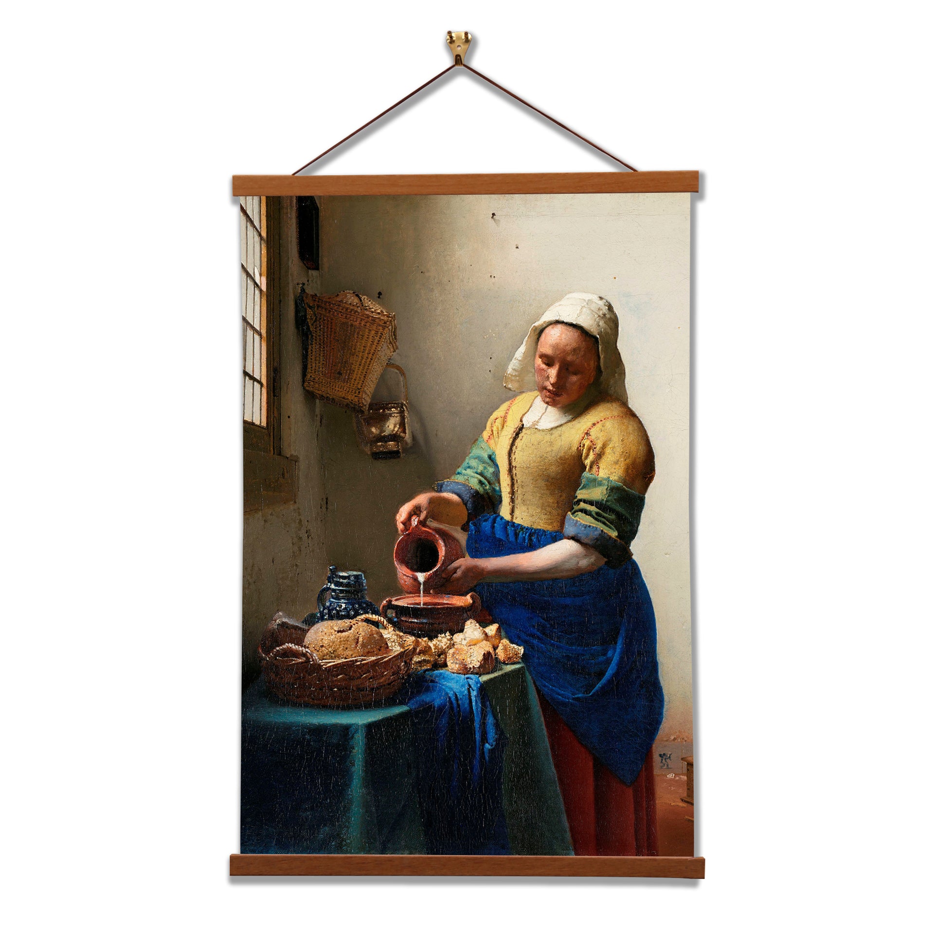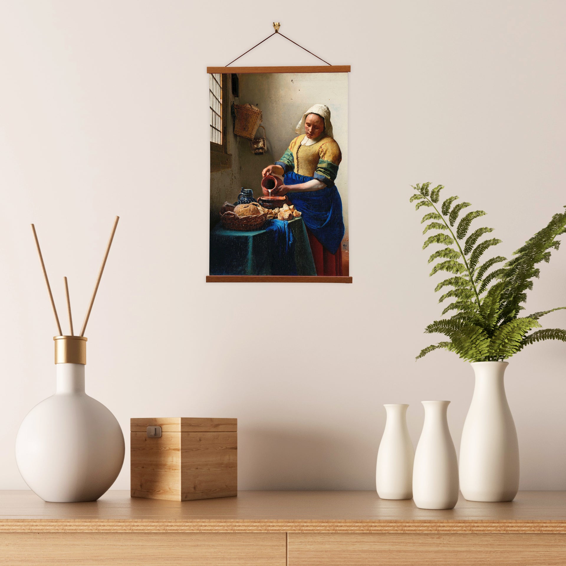 Our posters is elegantly suspended from a magnetic hanger crafted from rich walnut-colored wood, accentuated by a rustic rawhide string for a timeless and sophisticated display. Transform your space with this combination of artistry and craftsmanship.