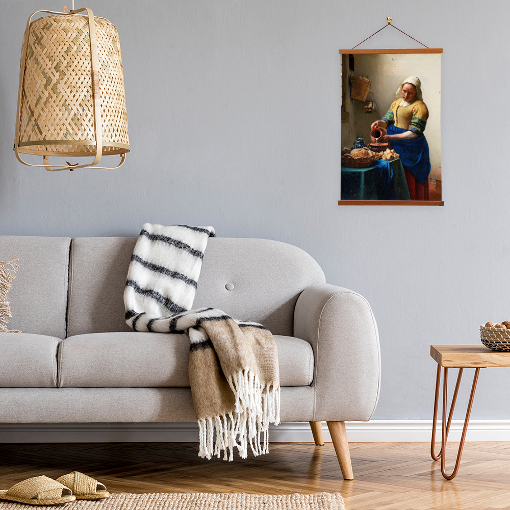 "The Milkmaid" by Johannes Vermeer is a masterful 17th-century Dutch painting that captures a serene domestic moment. The artwork showcases a young woman pouring milk into a bowl, bathed in soft, natural light. Vermeer's meticulous attention to detail and the play of light and shadow create a timeless, intimate atmosphere.