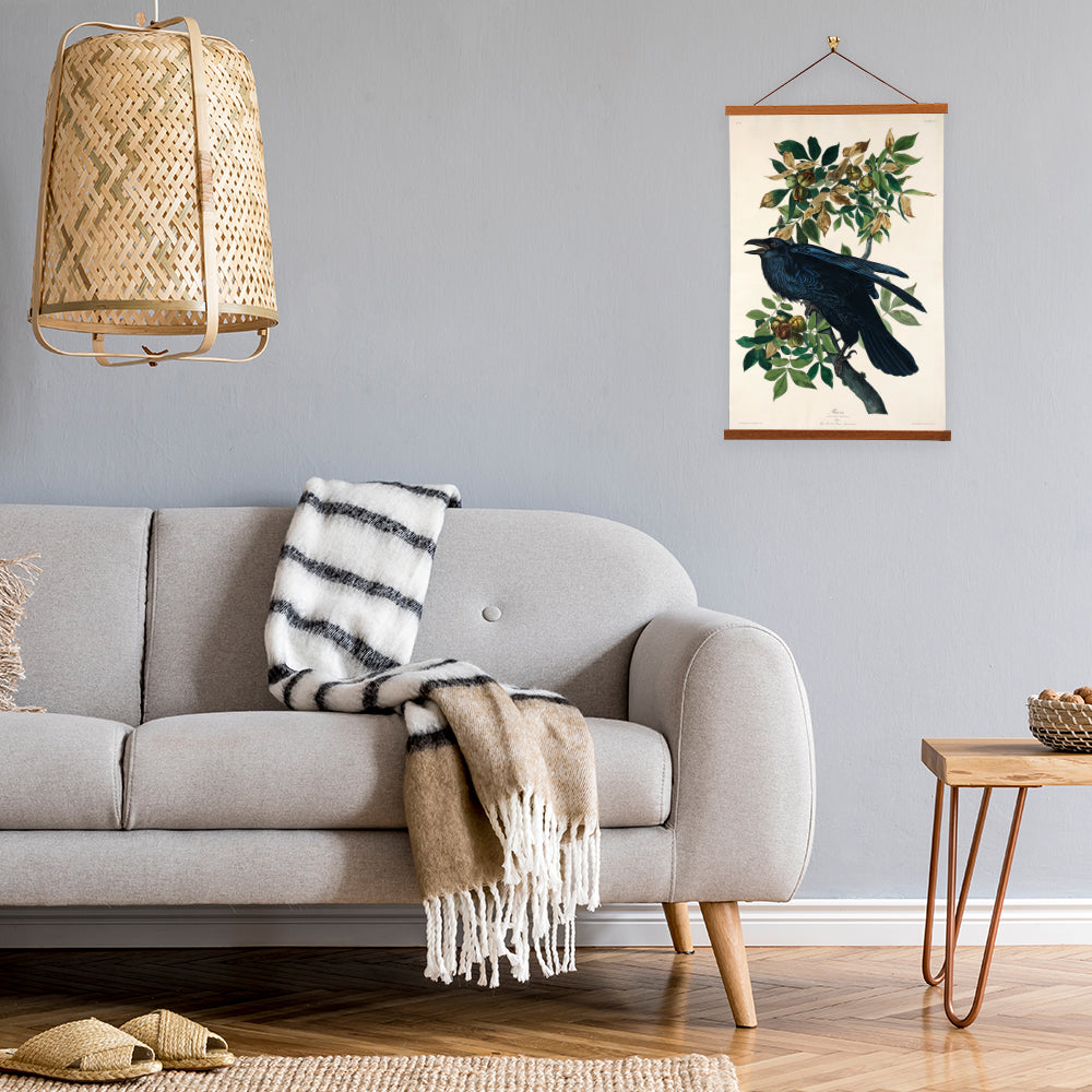 "Raven" by John James Audubon is a captivating ornithological illustration from his seminal work, "The Birds of America" (1827-1838). This exquisite depiction showcases the striking, dark-plumed raven in remarkable detail, capturing its majestic presence and enigmatic allure. Audubon's masterful artistry and scientific precision make this work an enduring testament to avian beauty.