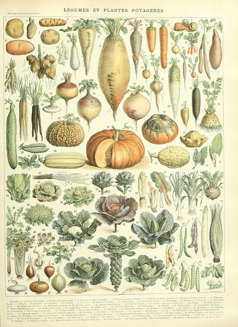 "Legumes Et Plantes Potageres" is a botanical illustration by Adolphe Millot, a French artist known for his exquisite natural history artwork. This work, dating back to the late 19th century, showcases a stunning array of legumes and vegetables with meticulous detail, serving as a timeless reference for botanists and enthusiasts alike.