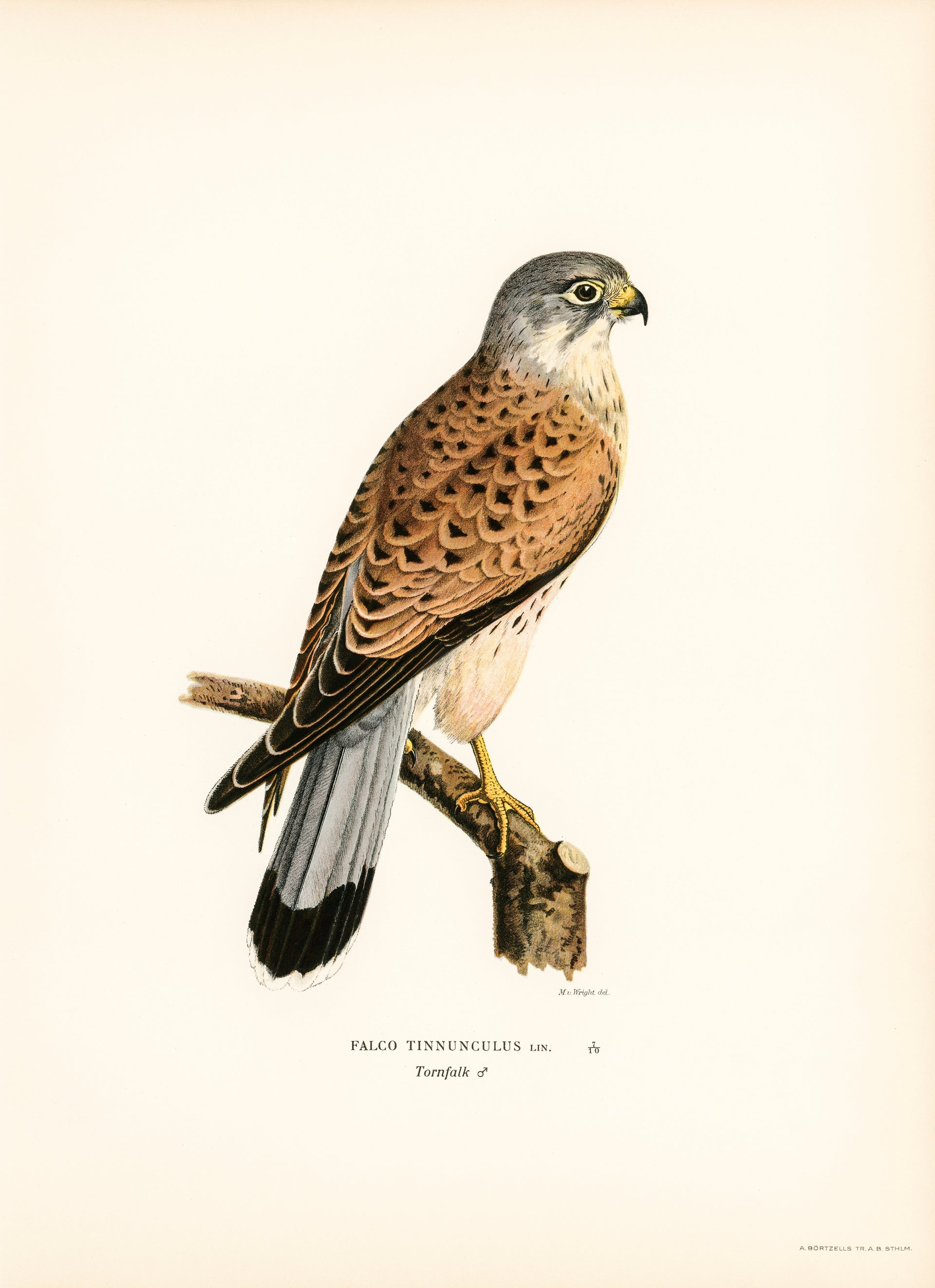 The von Wright Brothers, celebrated for their naturalist illustrations, portray the Common Kestrel male (Falco tinnunculus) with meticulous detail. Their art captures the raptor's striking plumage, characterized by russet hues and distinctive black streaks. This charismatic bird of prey is a symbol of agility and grace in the skies.
