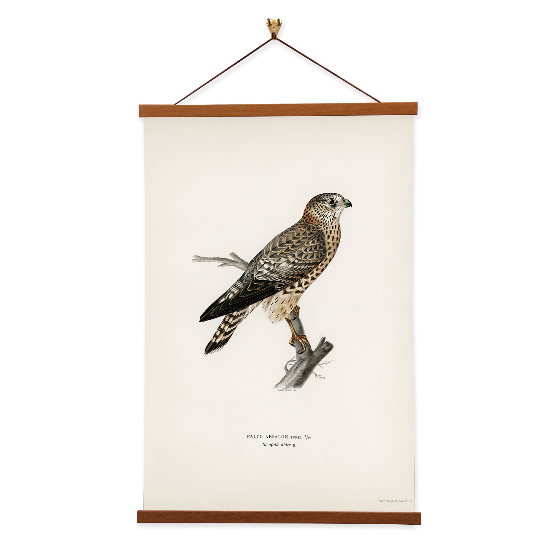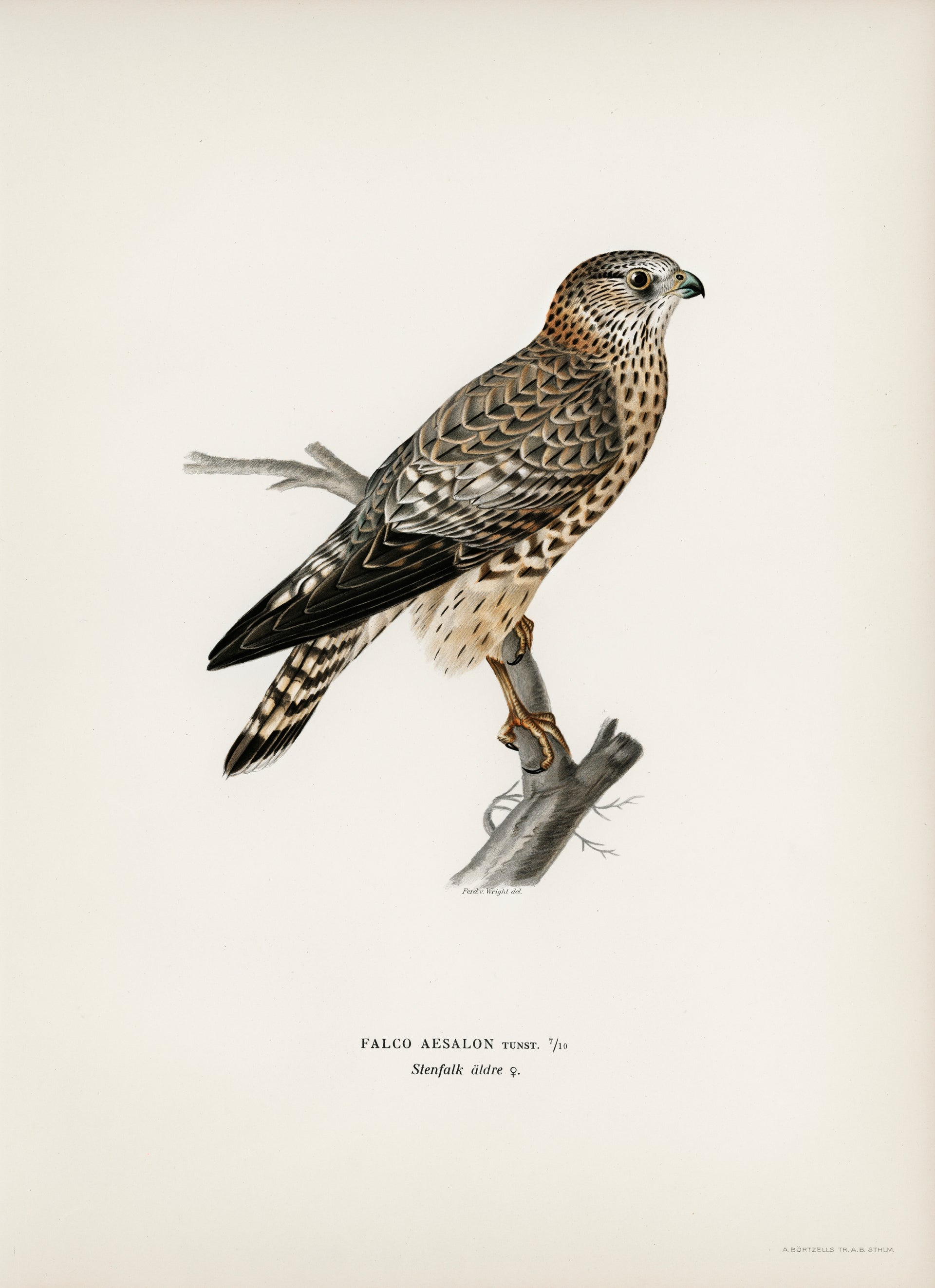 Merlin (Falco aesalon), as depicted by the von Wright Brothers, showcases the keen eye for detail and the inherent elegance of this compact raptor. Their artwork beautifully captures the female Merlin's distinctive plumage and fierce, determined gaze, embodying the spirit of this agile and skilled bird of prey.