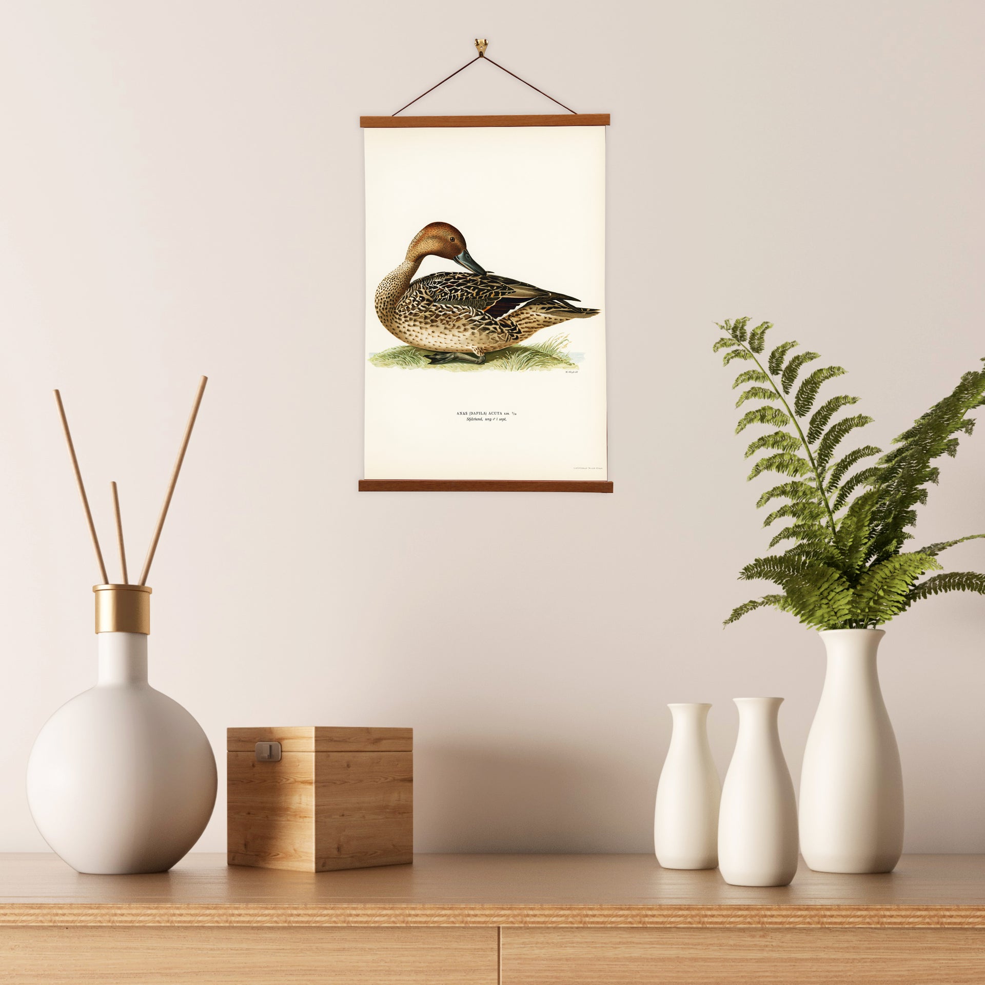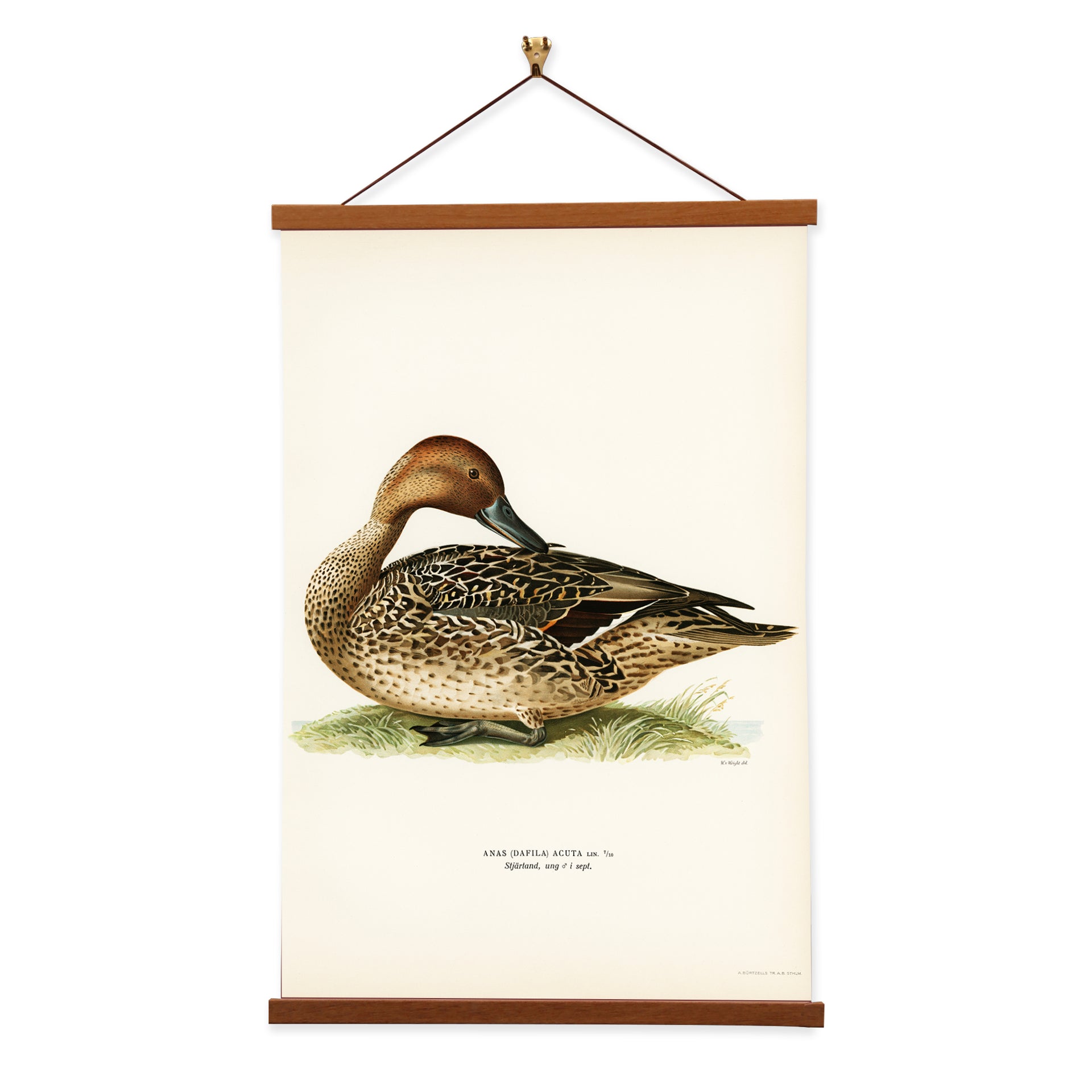The Northern Pintail, vividly depicted by the von Wright Brothers, is a striking waterfowl species. Its slender, elongated body, elegant white neck, and distinctive pointed tail feathers set it apart. These remarkable birds are known for their graceful appearance and their prominent role in wetland ecosystems across the Northern Hemisphere.