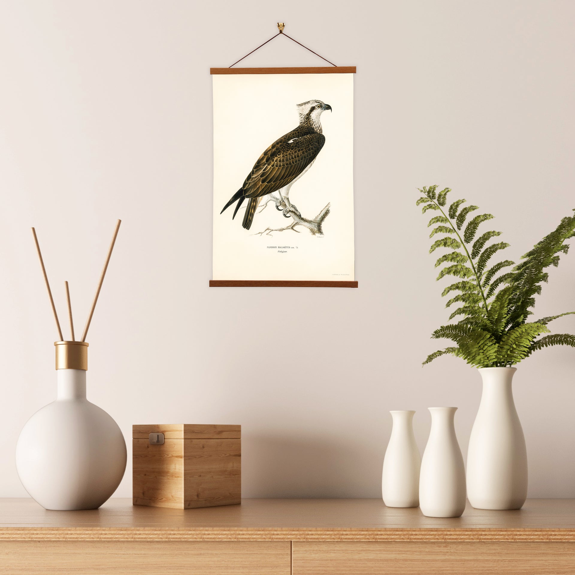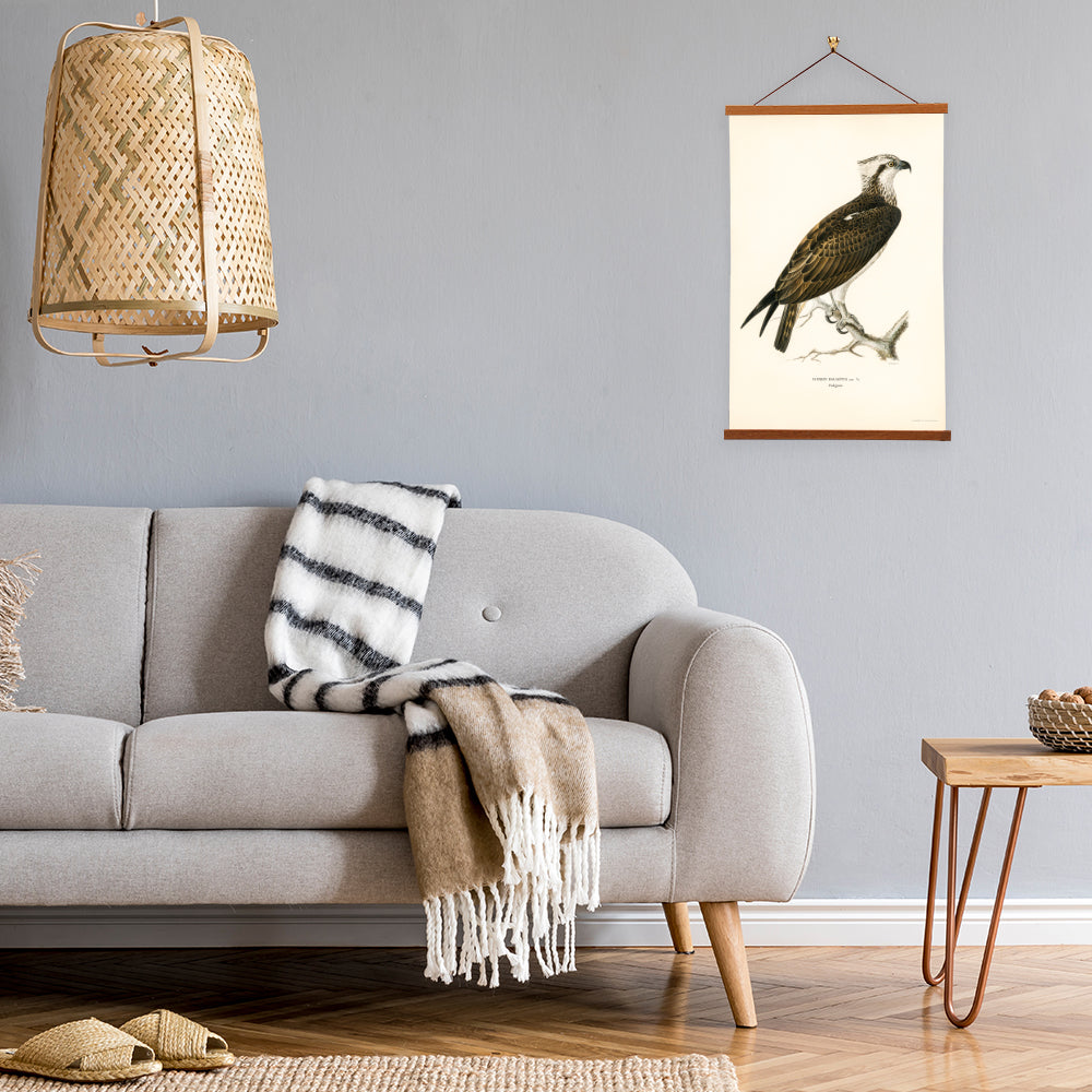 Our posters are elegantly suspended from a magnetic hanger crafted from rich walnut-colored wood, accentuated by a rustic rawhide string for a timeless and sophisticated display. Transform your space with this combination of artistry and craftsmanship.