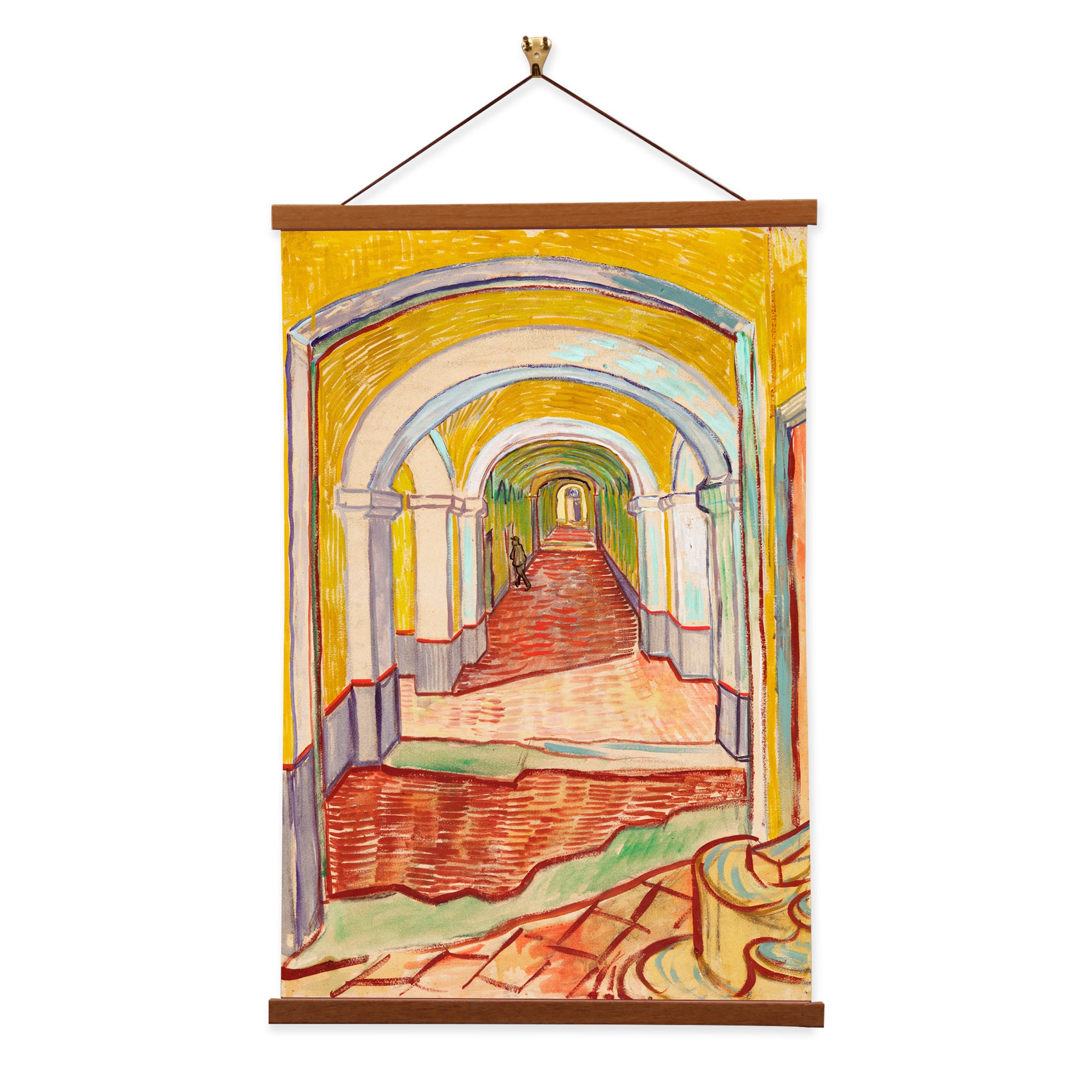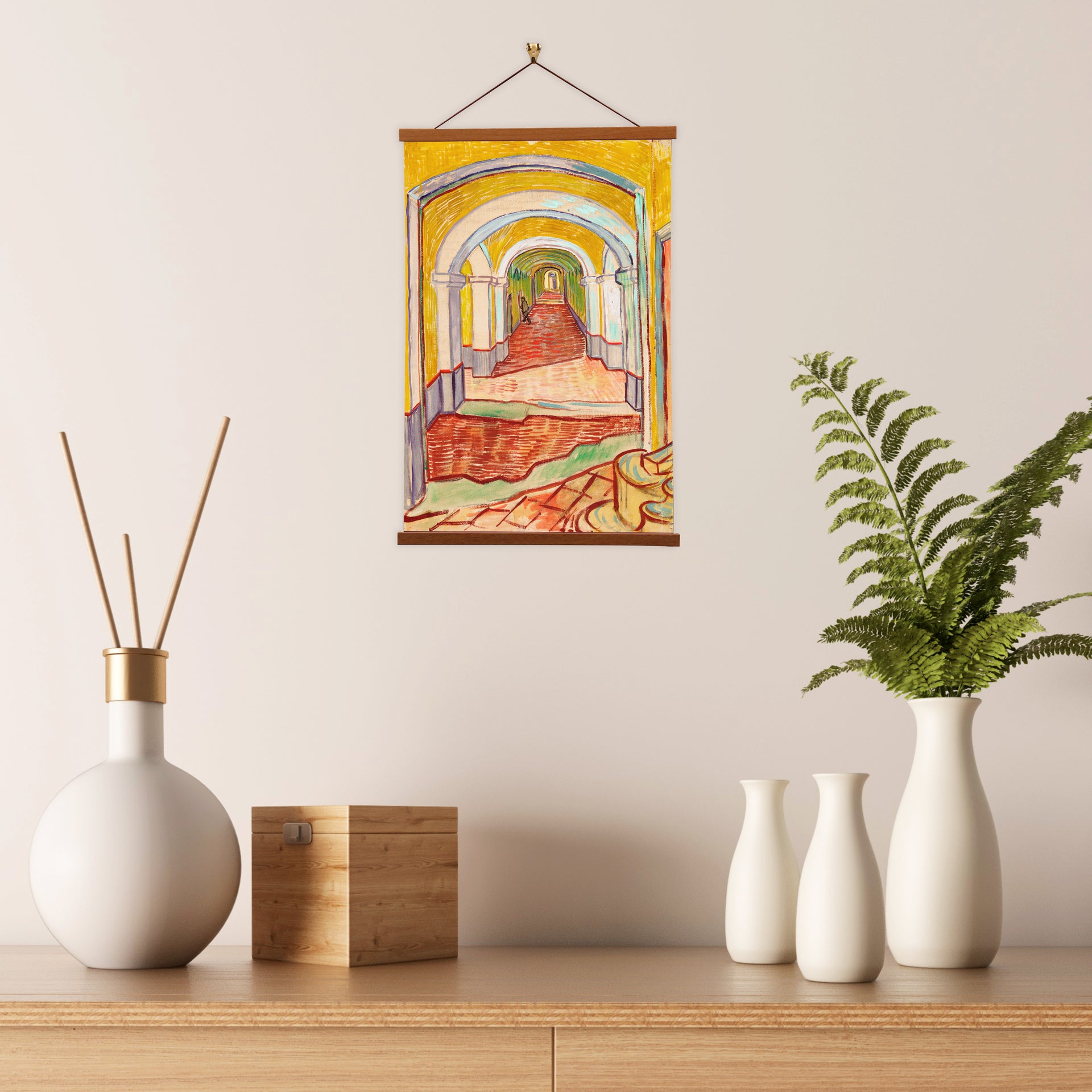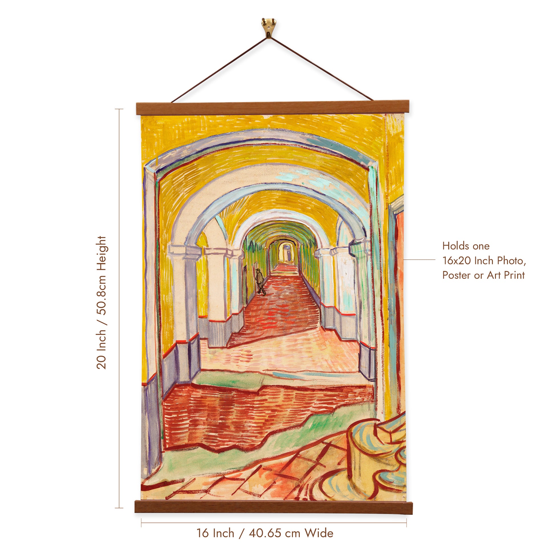 Our posters is elegantly suspended from a magnetic hanger crafted from rich walnut-colored wood, accentuated by a rustic rawhide string for a timeless and sophisticated display. Transform your space with this combination of artistry and craftsmanship.