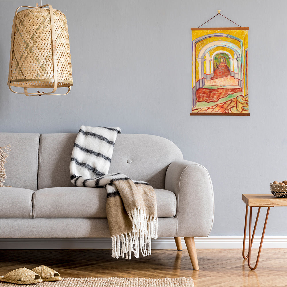 "Corridor in the Asylum" is a haunting masterpiece by Vincent van Gogh, painted during his stay at the Saint-Paul-de-Mausole asylum in Saint-Rémy-de-Provence in 1889. The painting captures the desolation of the asylum's corridor, where Van Gogh's emotional turmoil is palpable through his use of swirling brushstrokes and a muted color palette, conveying a sense of isolation and inner turmoil.