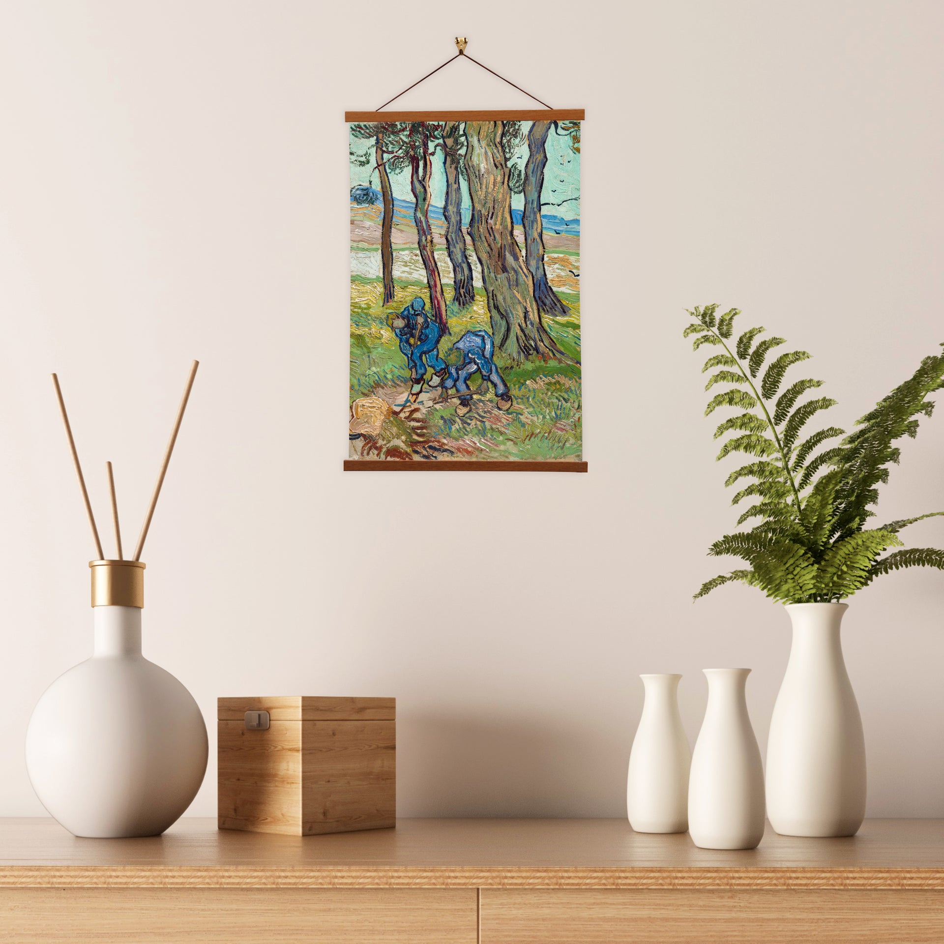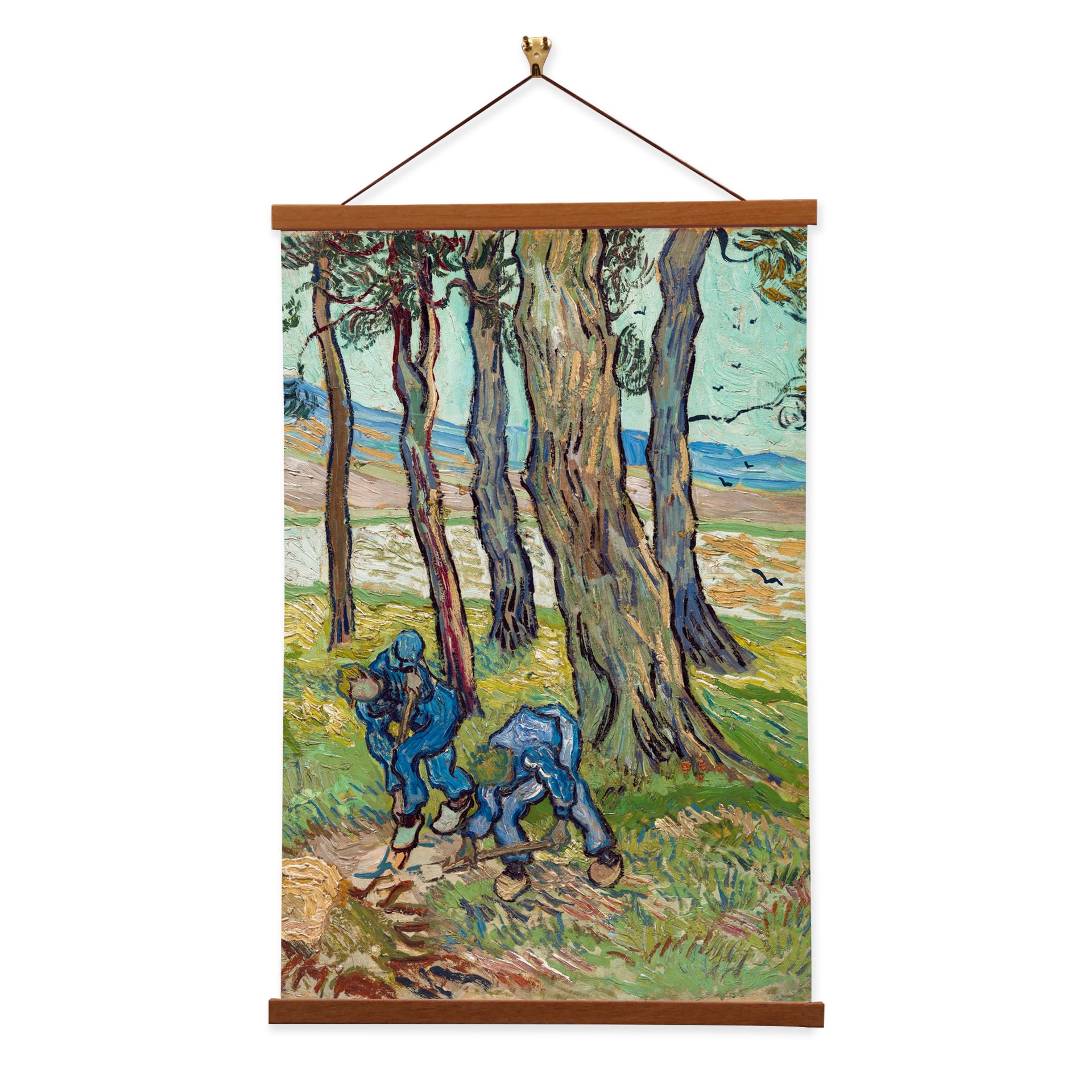 "The Diggers" is a mesmerizing masterpiece by Vincent van Gogh, painted in 1889 during his stay at the Saint-Paul-de-Mausole asylum. This striking artwork captures the labor of two peasants toiling in a sun-drenched field, their stooped postures and vibrant surroundings reflecting the artist's profound connection with nature and the working class. Van Gogh's signature swirling brushwork and vivid colors imbue the scene with a sense of vitality and emotion, making "The Diggers" a compelling representation of his unique artistic style and profound empathy for the human condition.