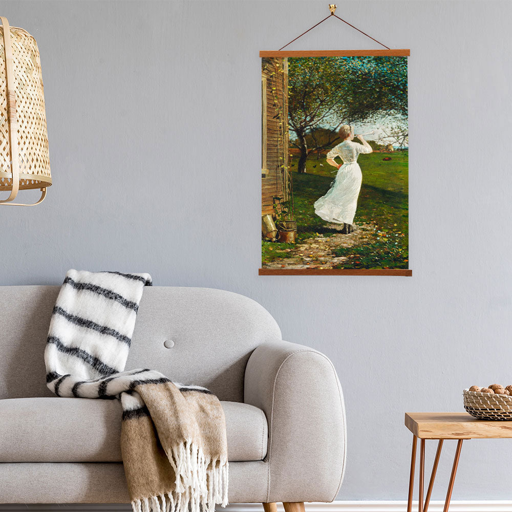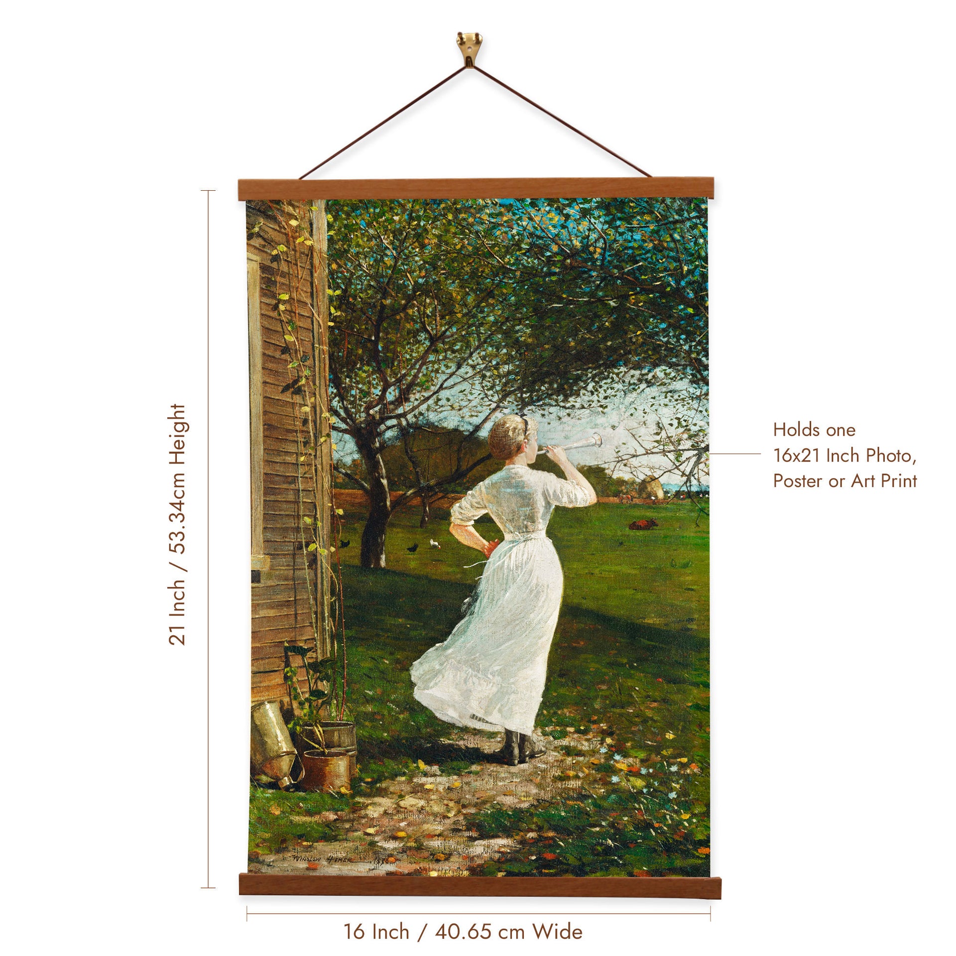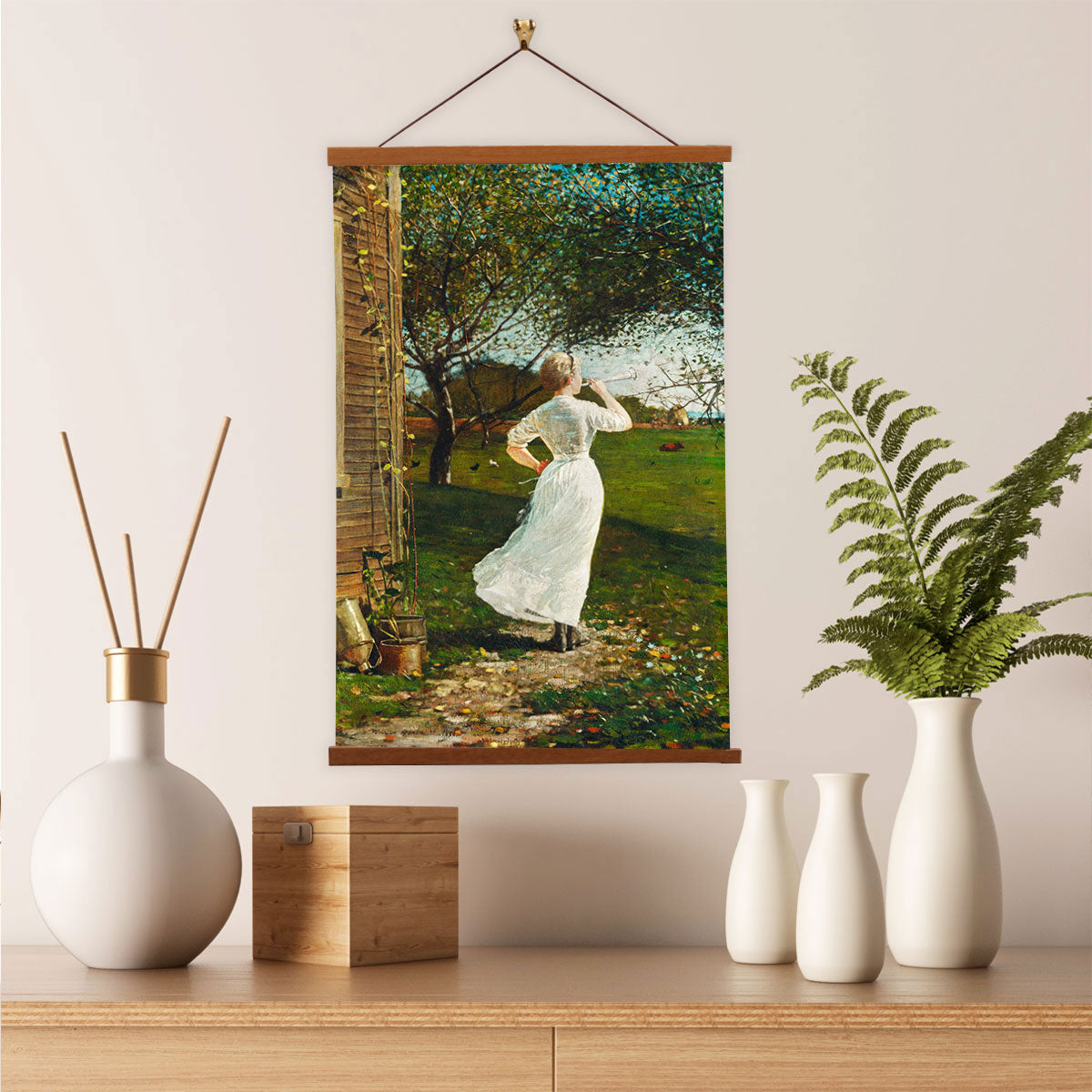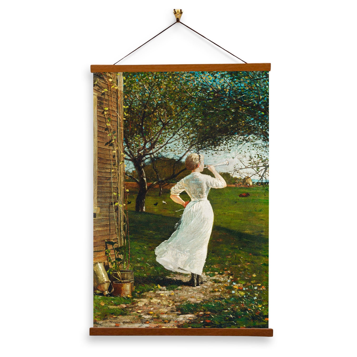 "The Dinner Horn (Blowing the Horn at Seaside)" by Winslow Homer captures a rural moment of daily life, with a young woman calling workers home at the end of the day. The scene, set against a glowing coastal backdrop, blends realism with atmospheric depth, emphasizing themes of labor, routine, and nostalgia. Homer’s masterful use of light and shadow brings a quiet yet powerful energy to this evocative painting.