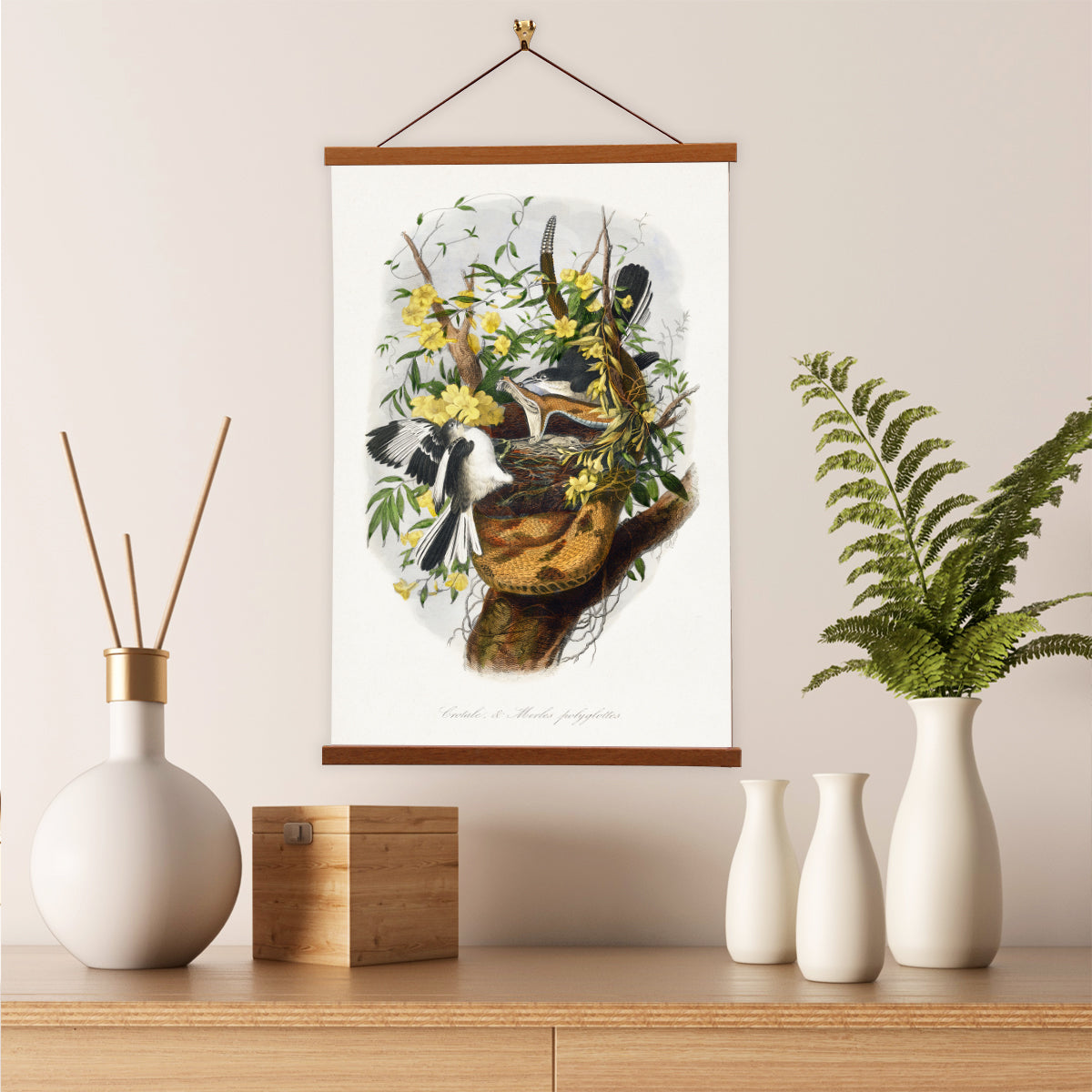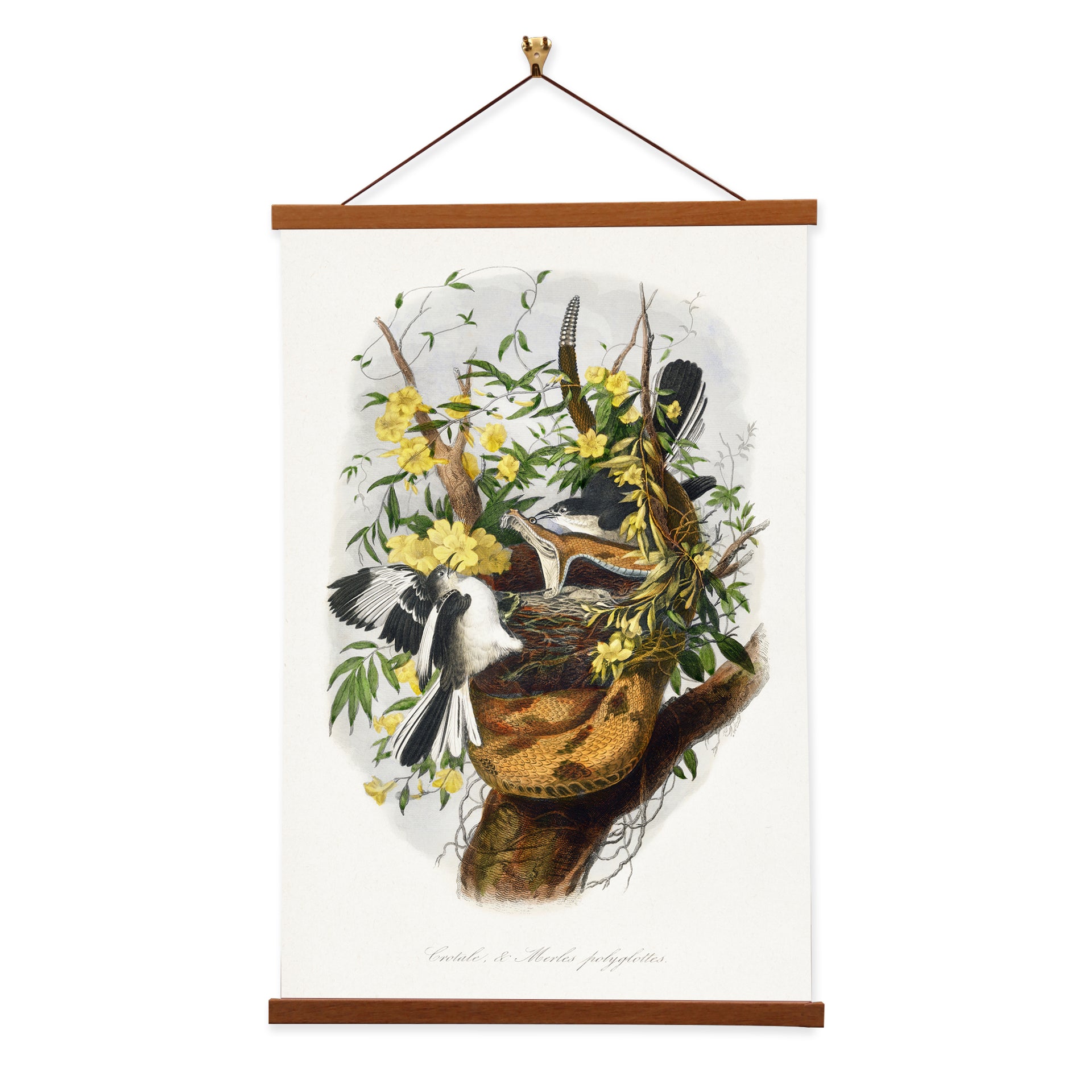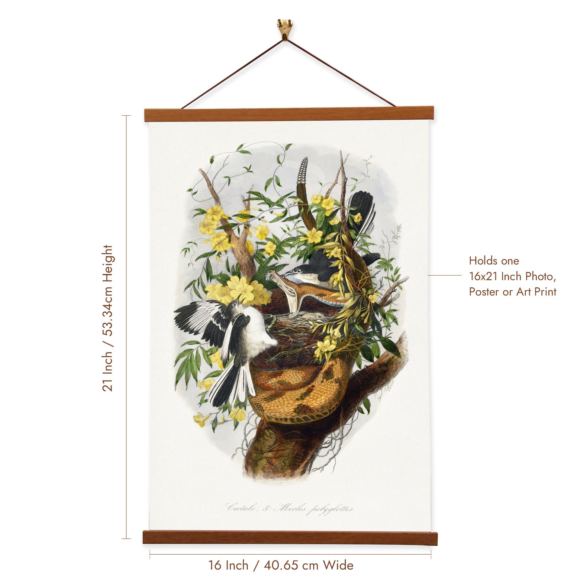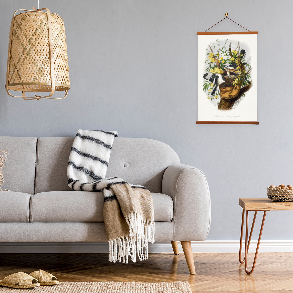 Our posters is elegantly suspended from a magnetic hanger crafted from rich walnut-colored wood, accentuated by a rustic rawhide string for a timeless and sophisticated display. Transform your space with this combination of artistry and craftsmanship.