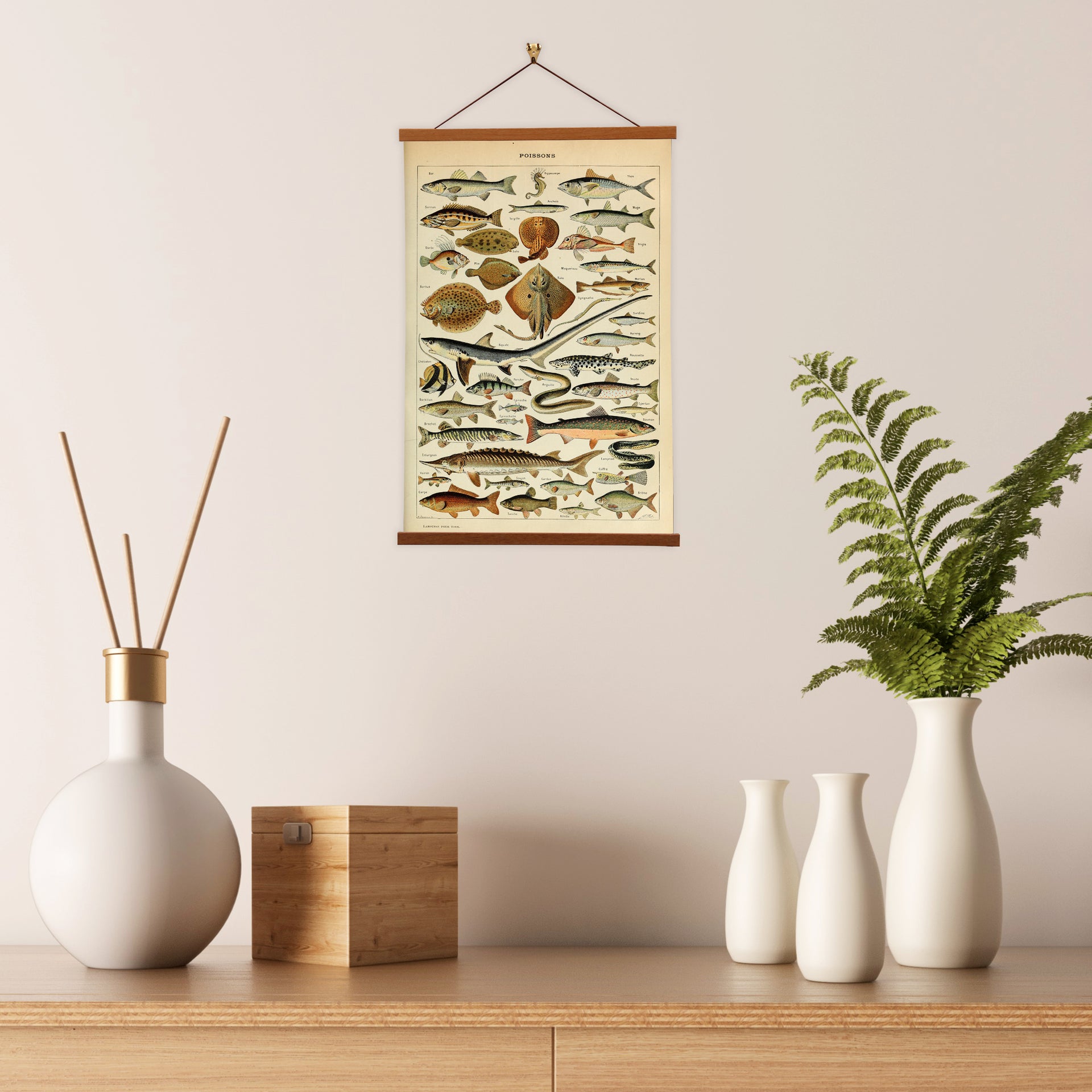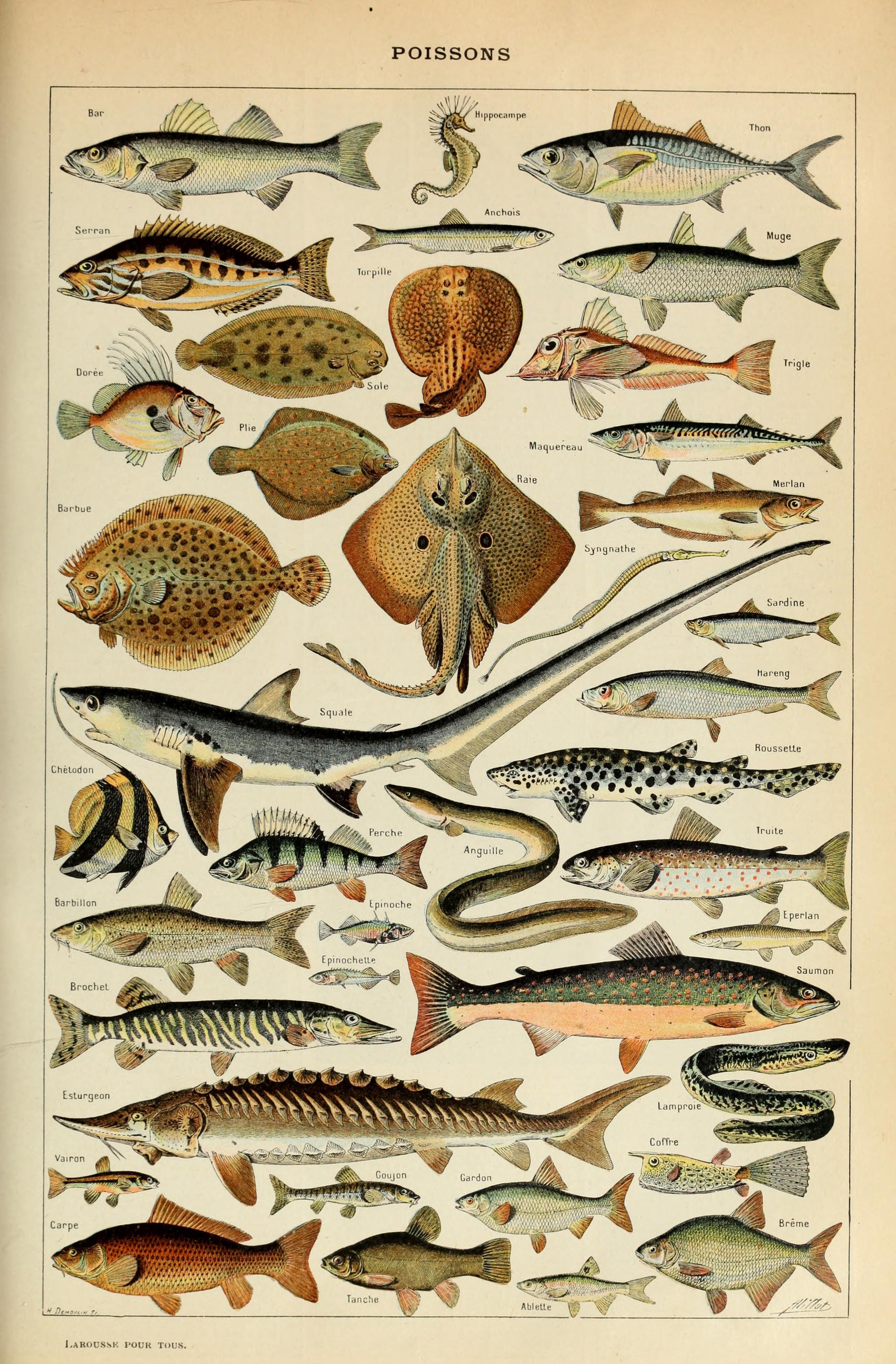 "Poissons I" by Adolphe Millot is a captivating illustration from the iconic "Nouveau Larousse Illustré," a 19th-century French encyclopedia. This intricate artwork showcases a diverse array of fish species, meticulously detailed and beautifully rendered. Millot's mastery of natural history illustration is evident in this stunning visual compendium of aquatic life.